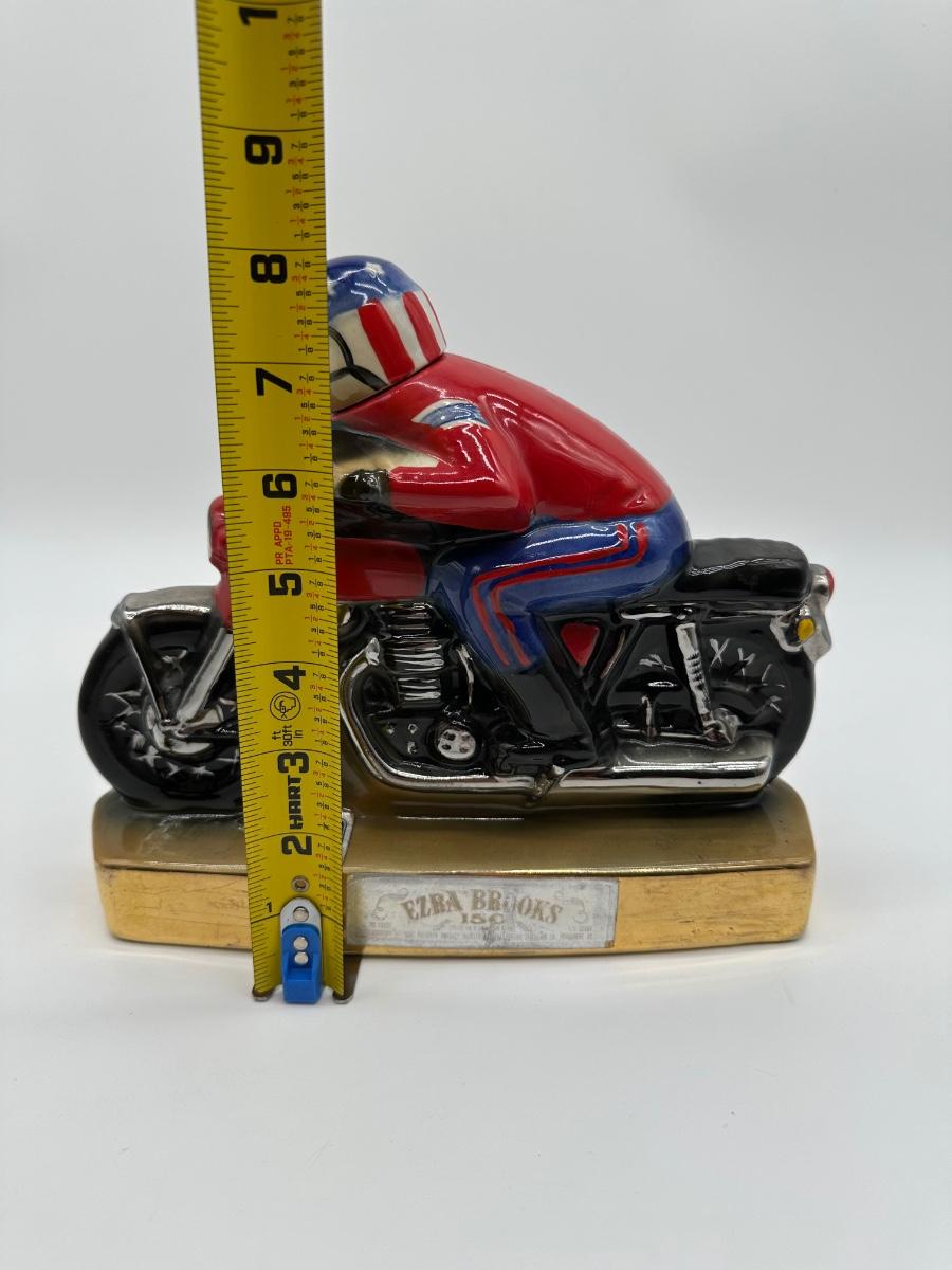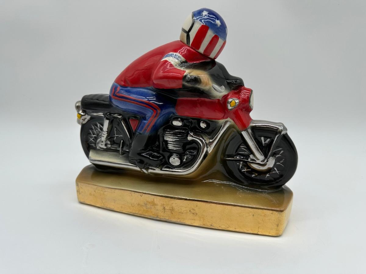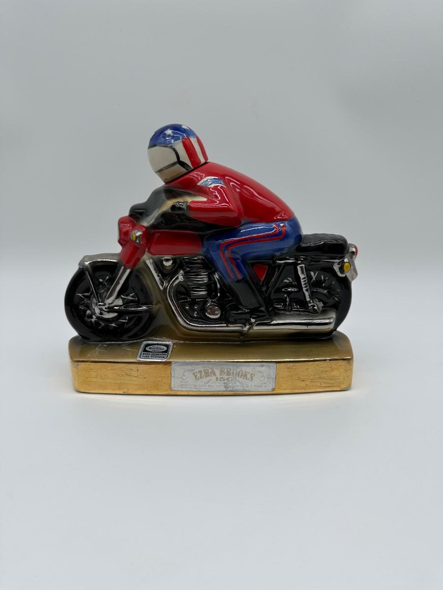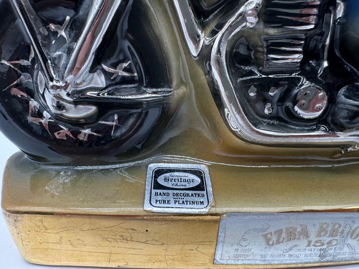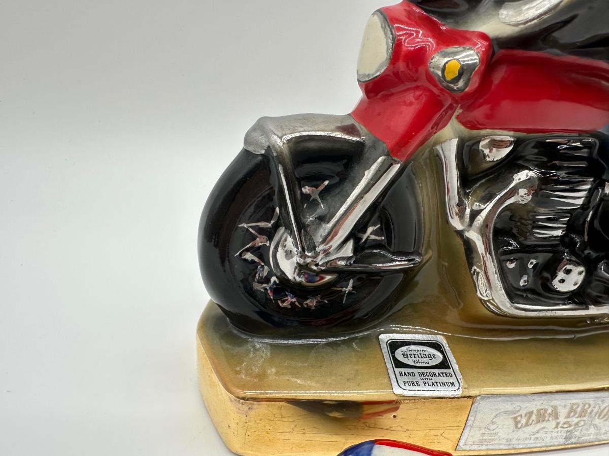 Vintage Ezra Brooks 150 figural whiskey decanter featuring a motorcycle racer on a classic bike. Produced by Heritage China, marked “Hand Decorated with Pure Platinum.” Highly detailed ceramic with glossy glaze, patriotic racing helmet, and sculpted motorcycle details. Labeled Ezra Brooks 150 on the base. A standout piece for whiskey, motorcycle, or barware collectors.