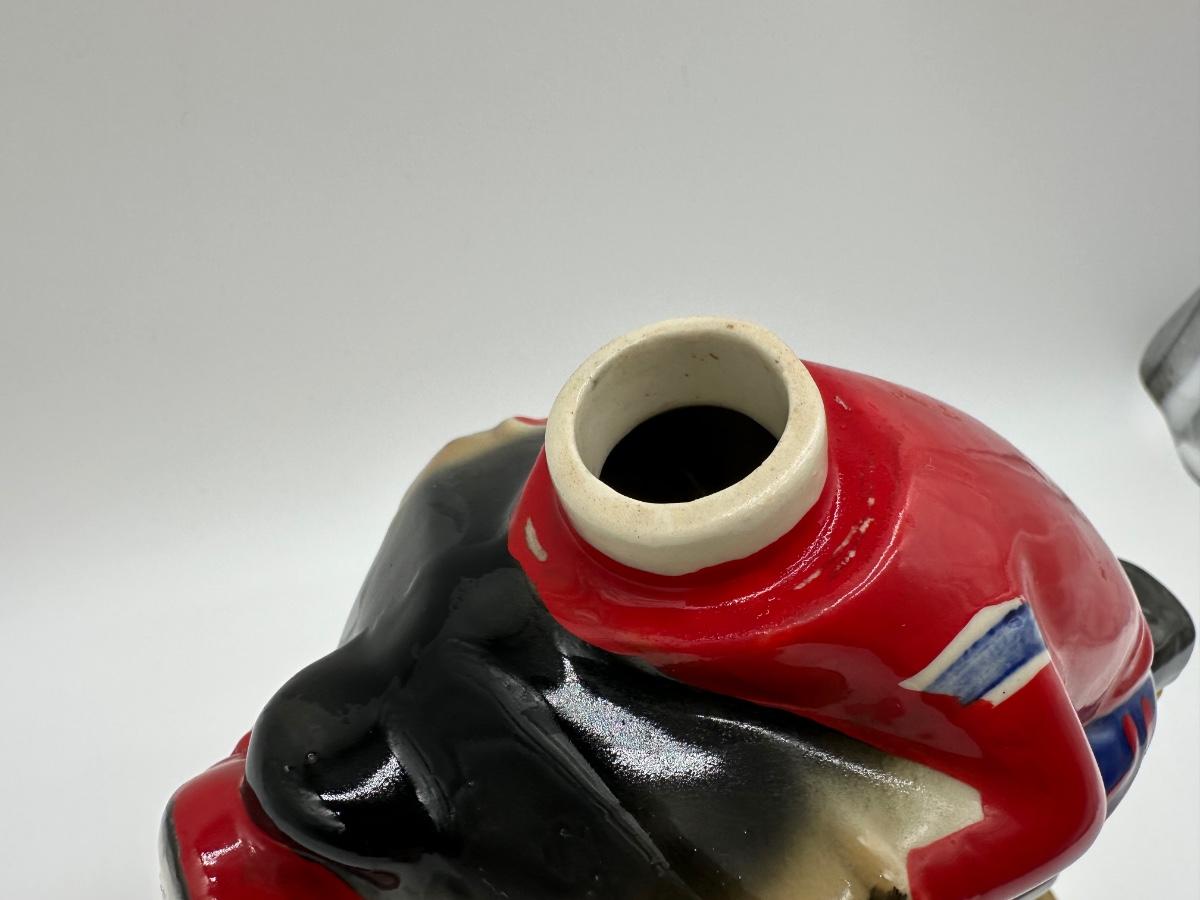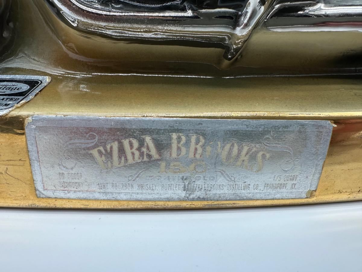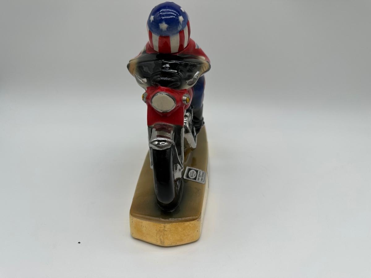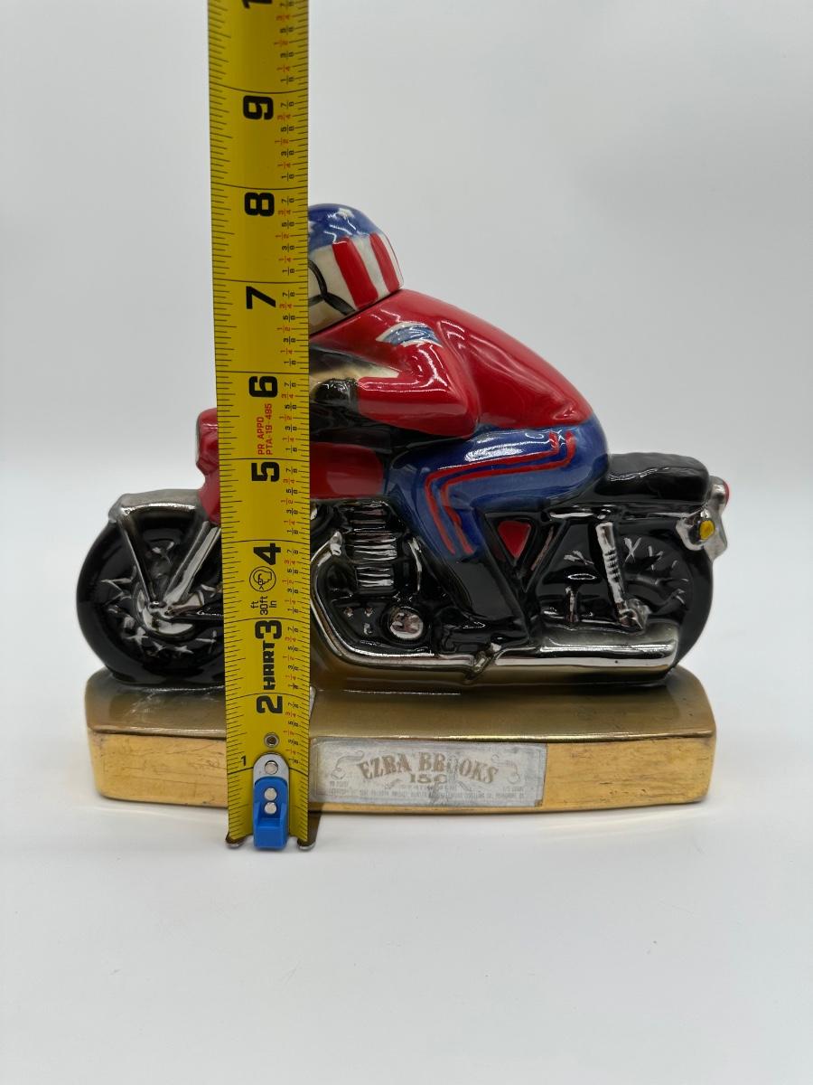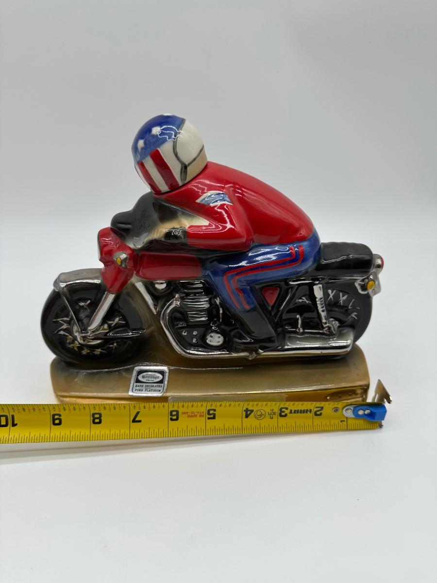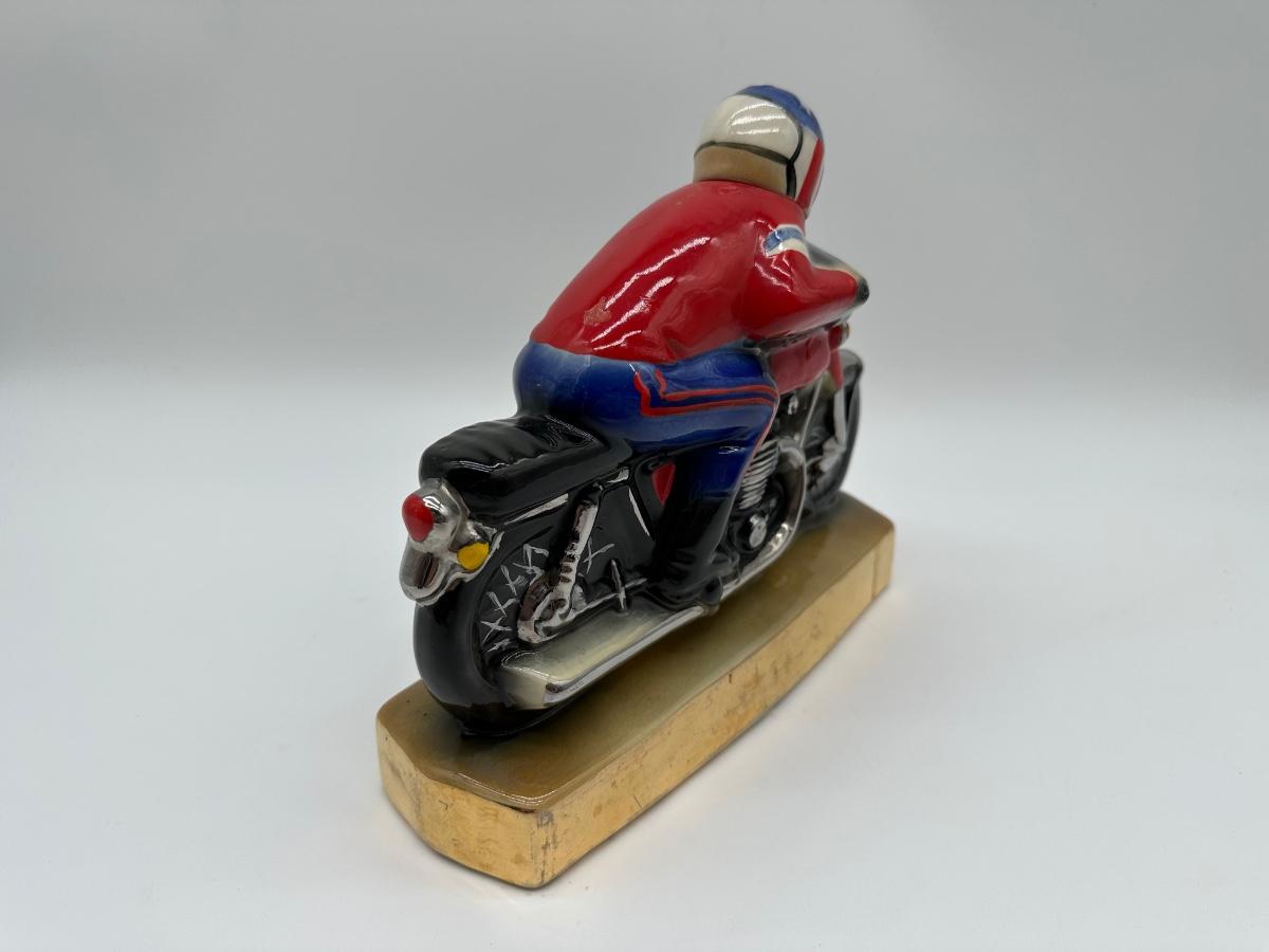 Vintage Ezra Brooks 150 figural whiskey decanter featuring a motorcycle racer on a classic bike. Produced by Heritage China, marked “Hand Decorated with Pure Platinum.” Highly detailed ceramic with glossy glaze, patriotic racing helmet, and sculpted motorcycle details. Labeled Ezra Brooks 150 on the base. A standout piece for whiskey, motorcycle, or barware collectors.