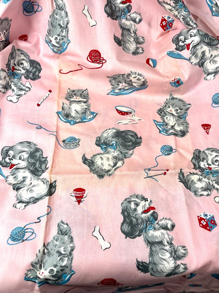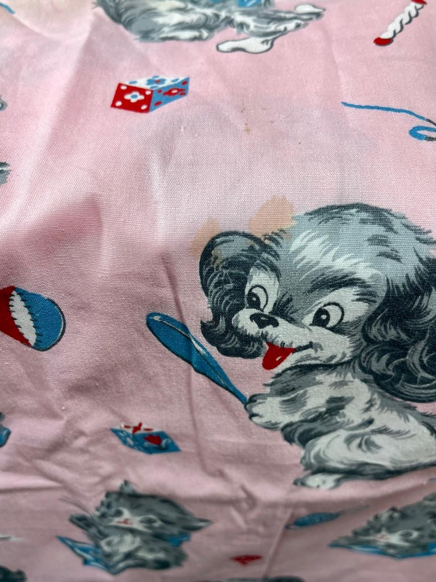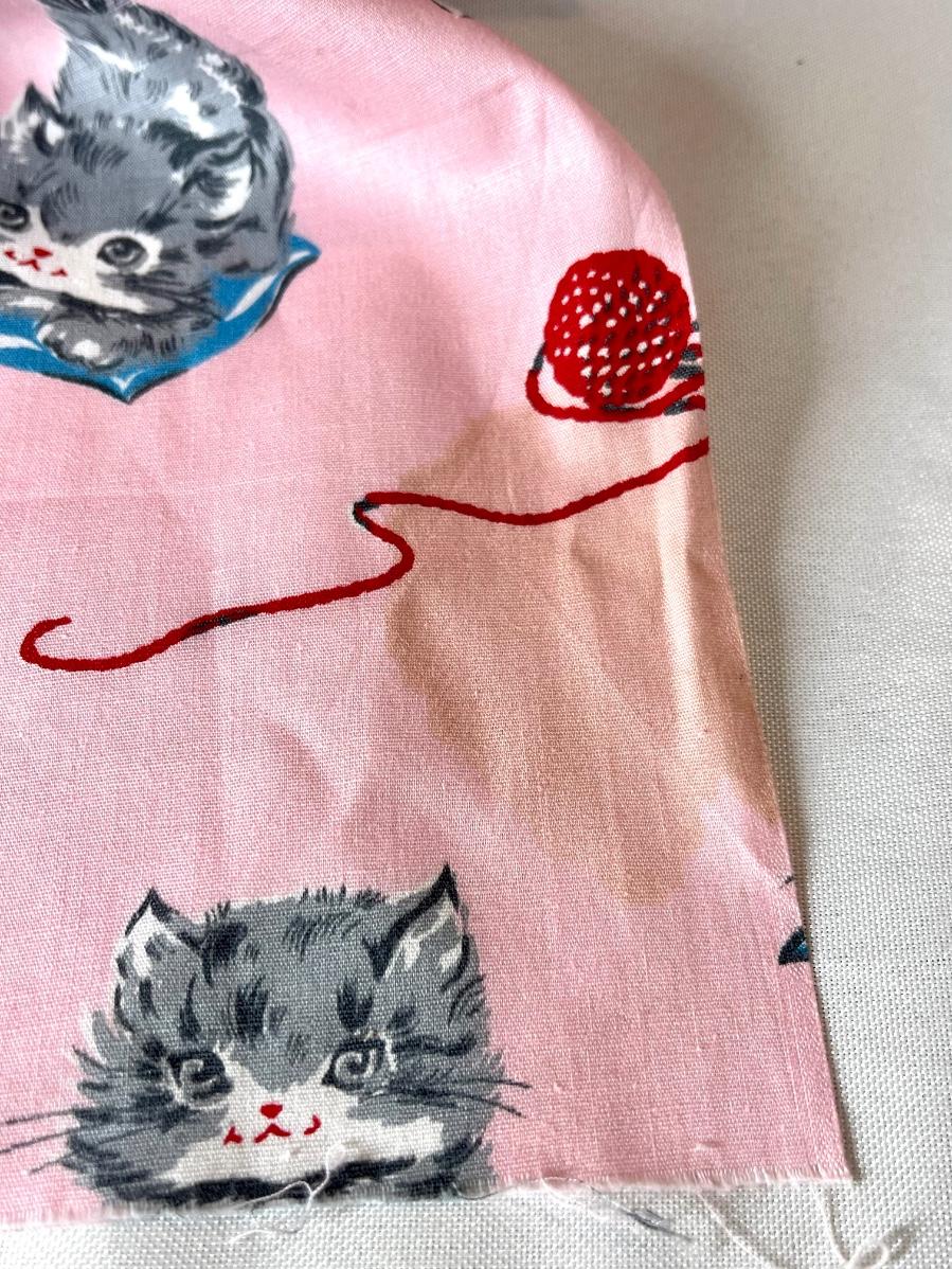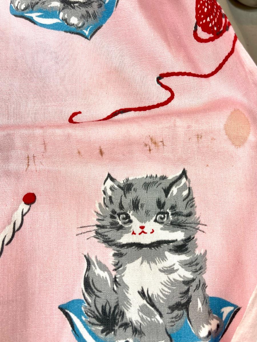 This is so cute!! There are spots of browning or staining that I pictured. These could possibly be laundered out. It’s certainly worth a try! This is such a sweet piece! Measures 35”X72”