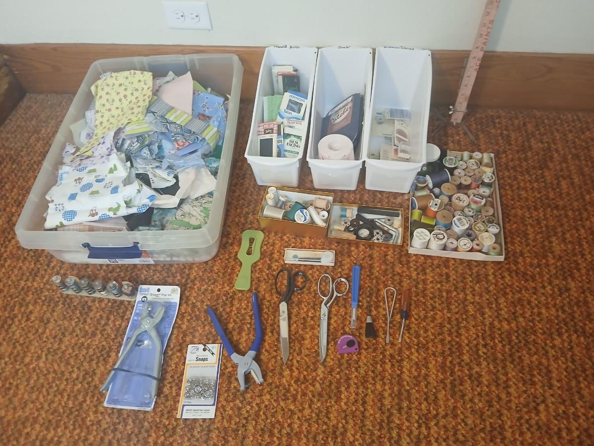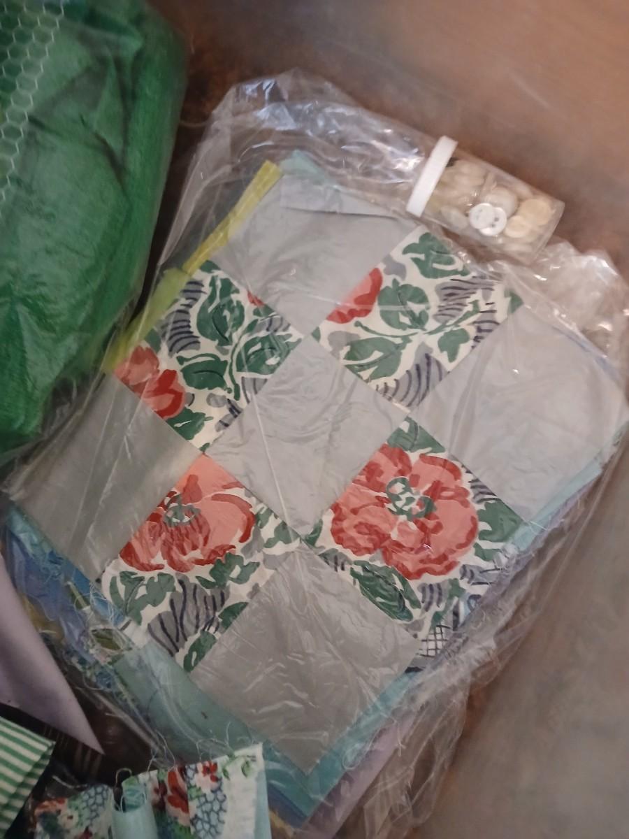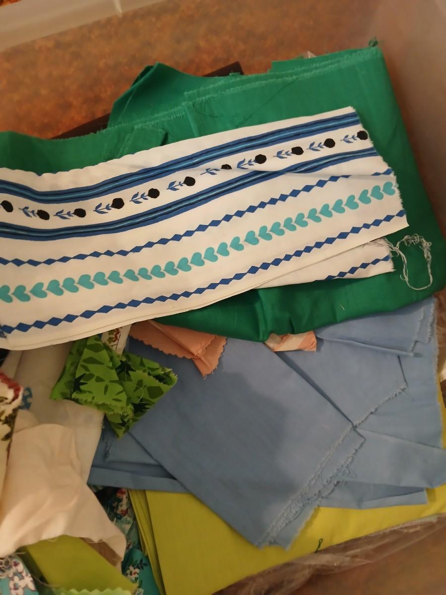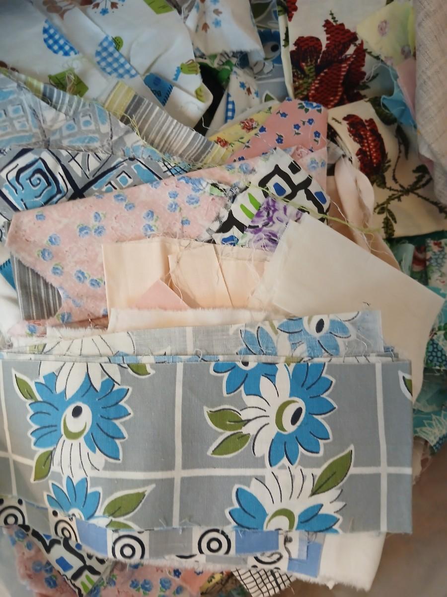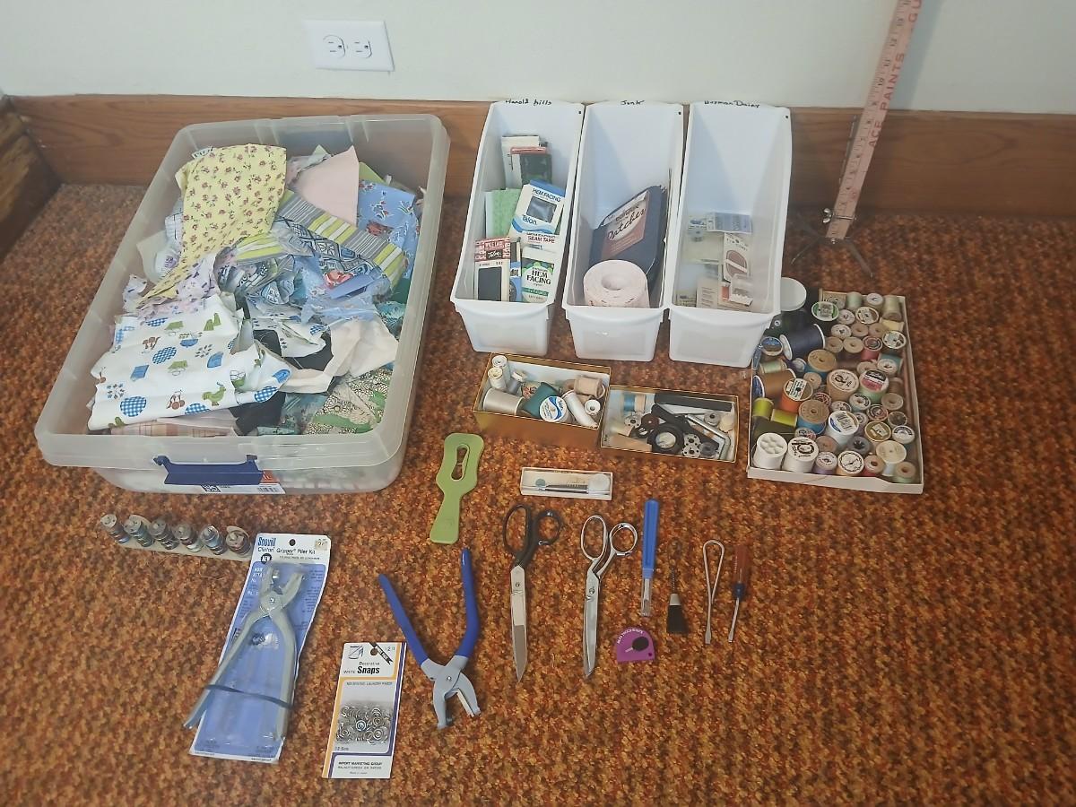 Vintage fabric scraps & sewing items - thread - needles - patches - Hem facing -tools of the trade and more