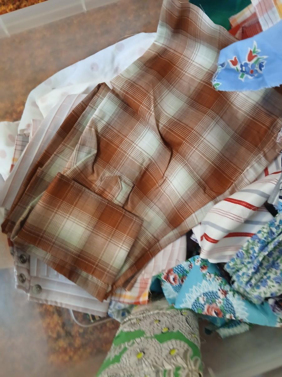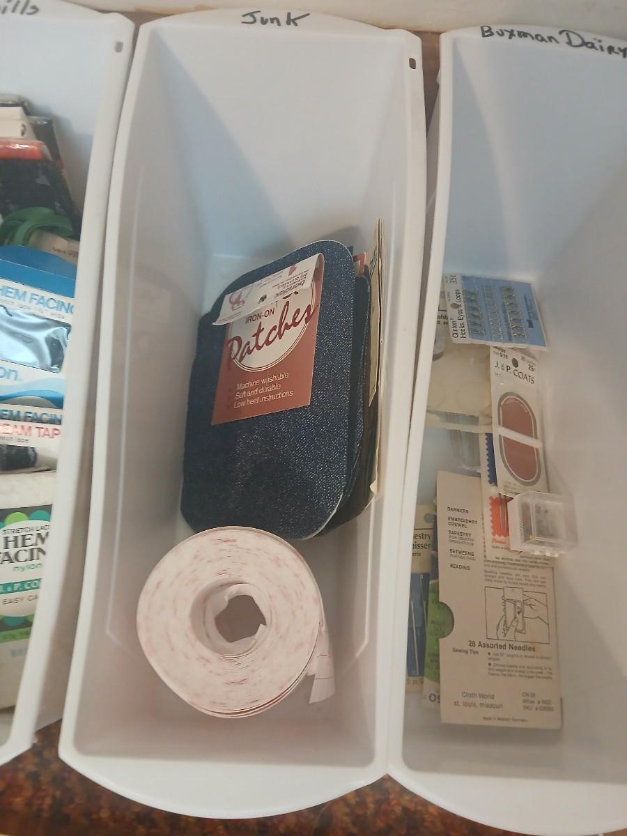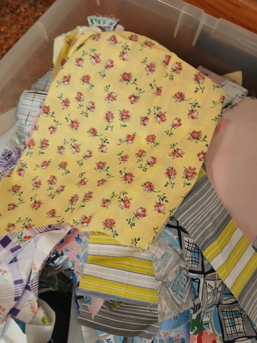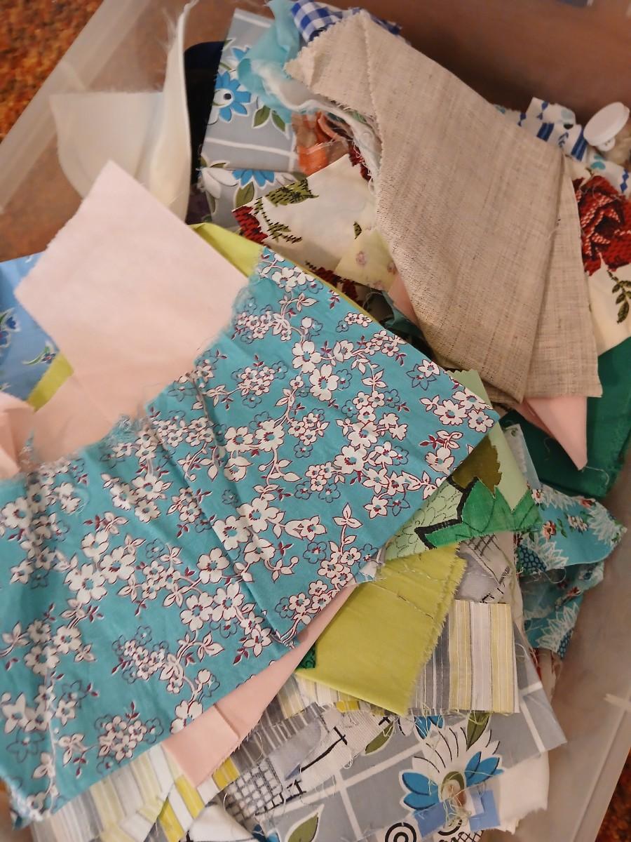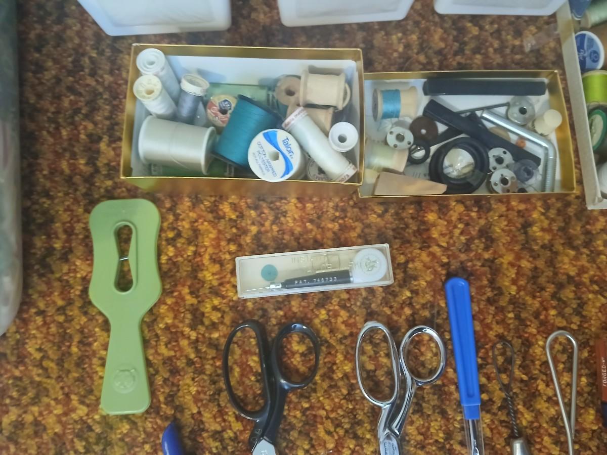Vintage fabric scraps & sewing items - thread - needles - patches - Hem facing -tools of the trade and more
