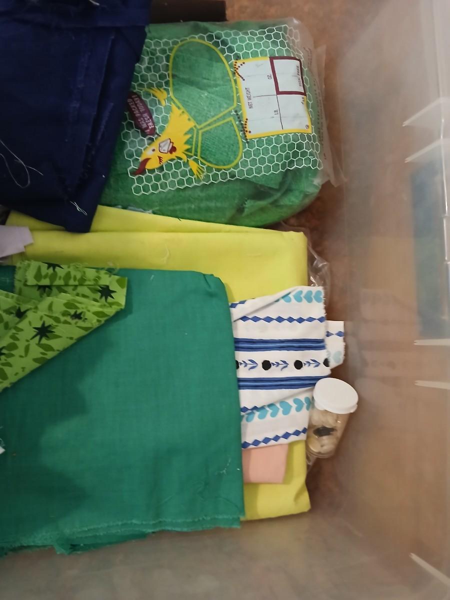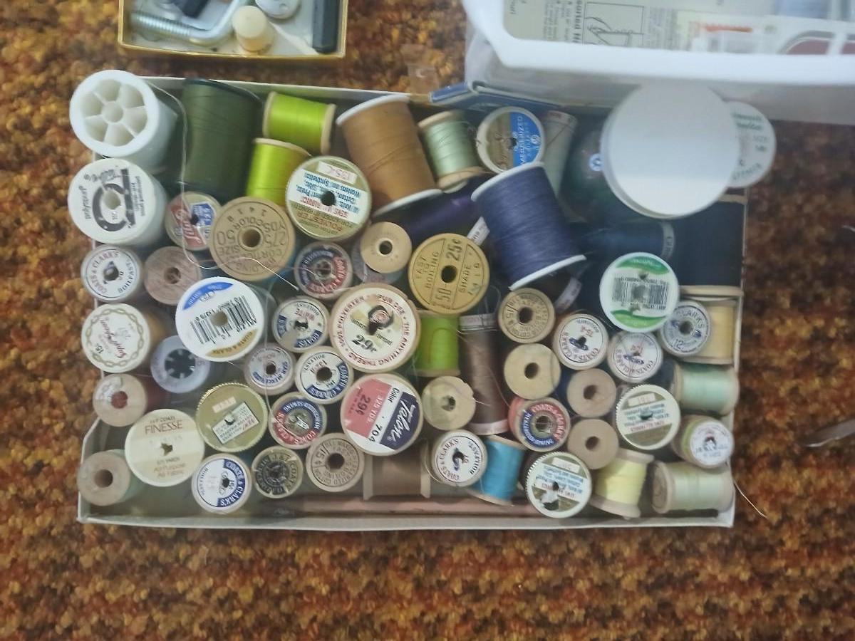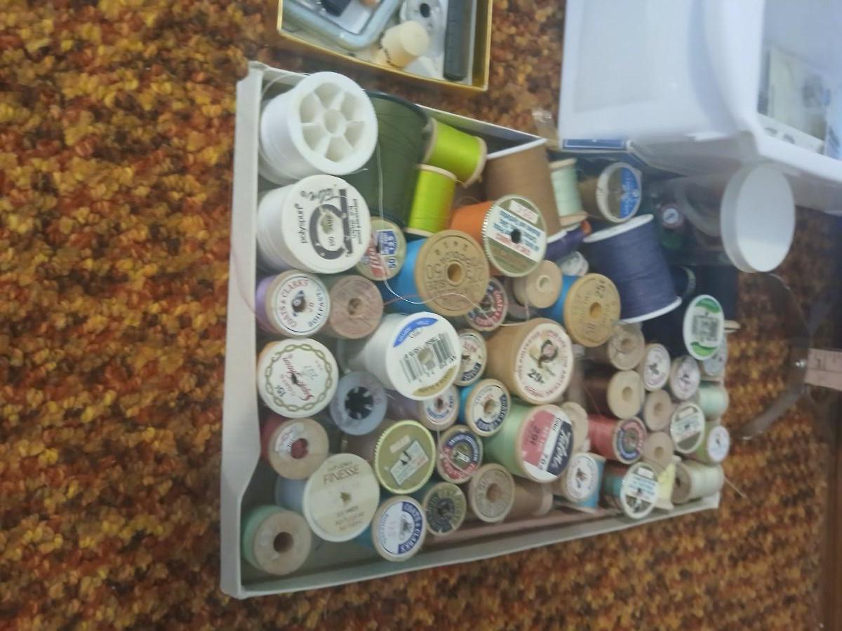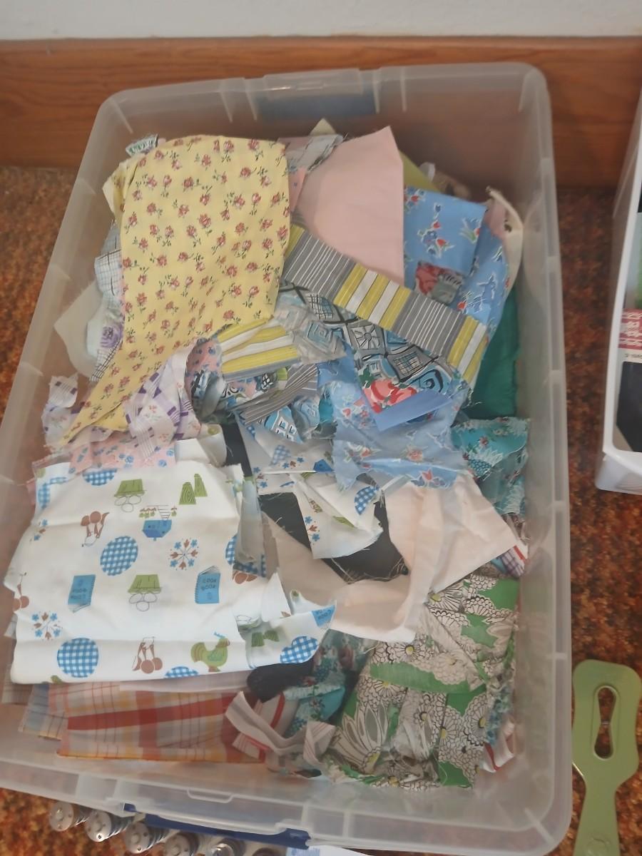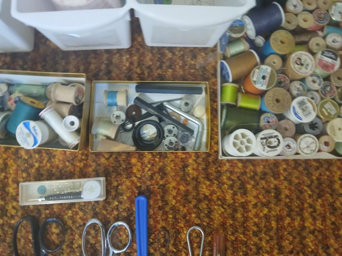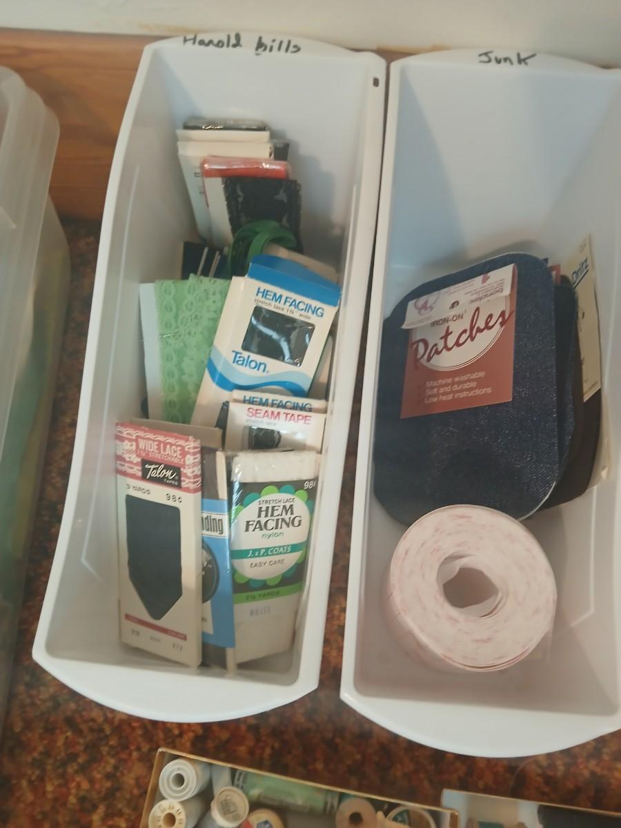 Vintage fabric scraps & sewing items - thread - needles - patches - Hem facing -tools of the trade and more