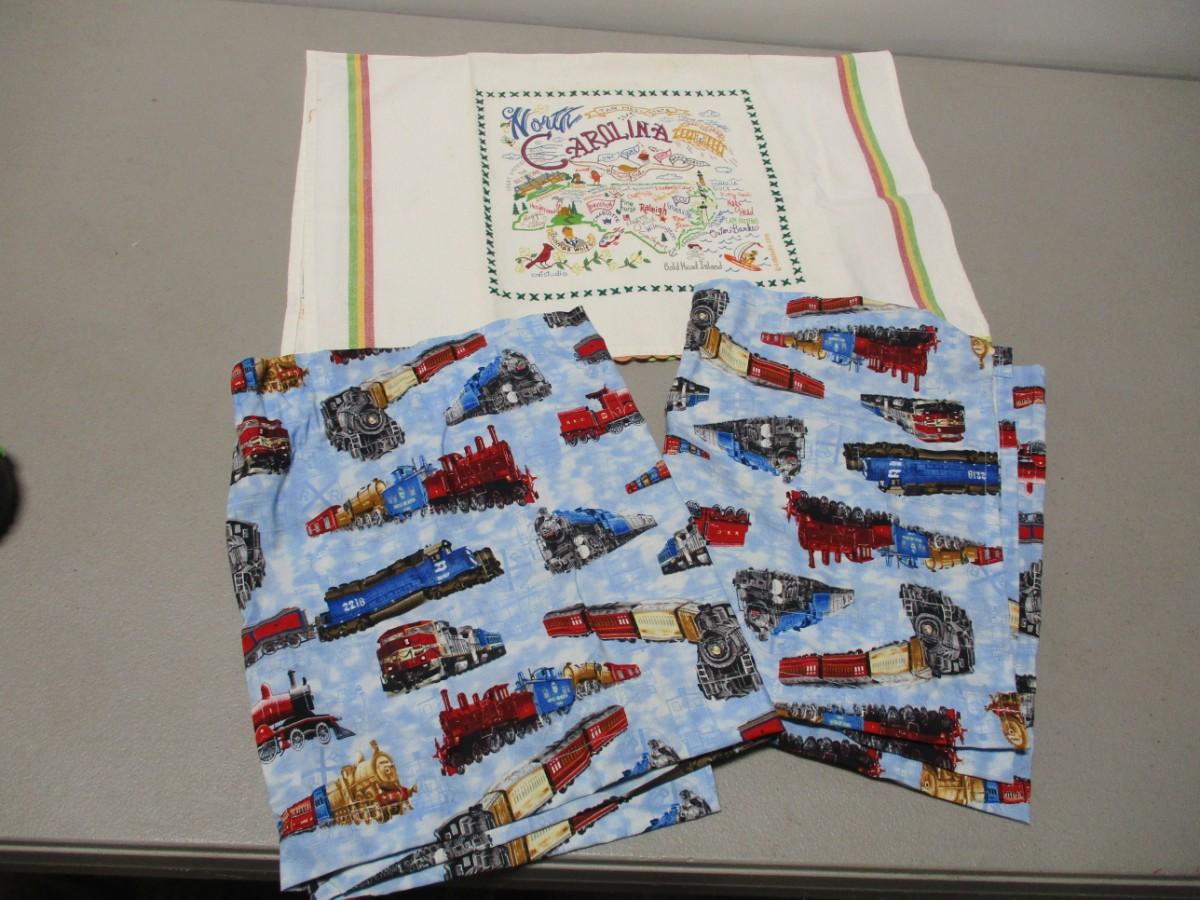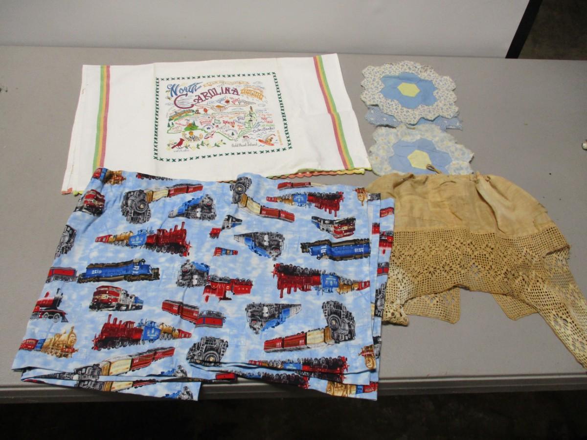 Vintage Fabric Includes Train Themed Valances, Tea-Stained Camisole, and Doilies