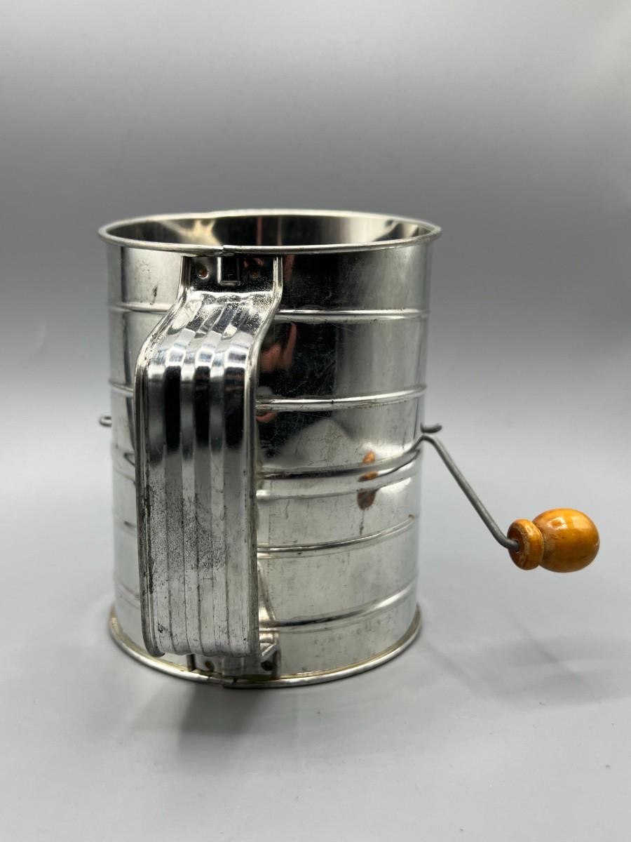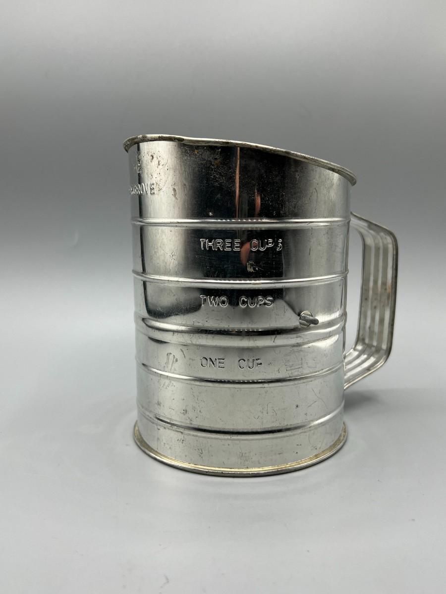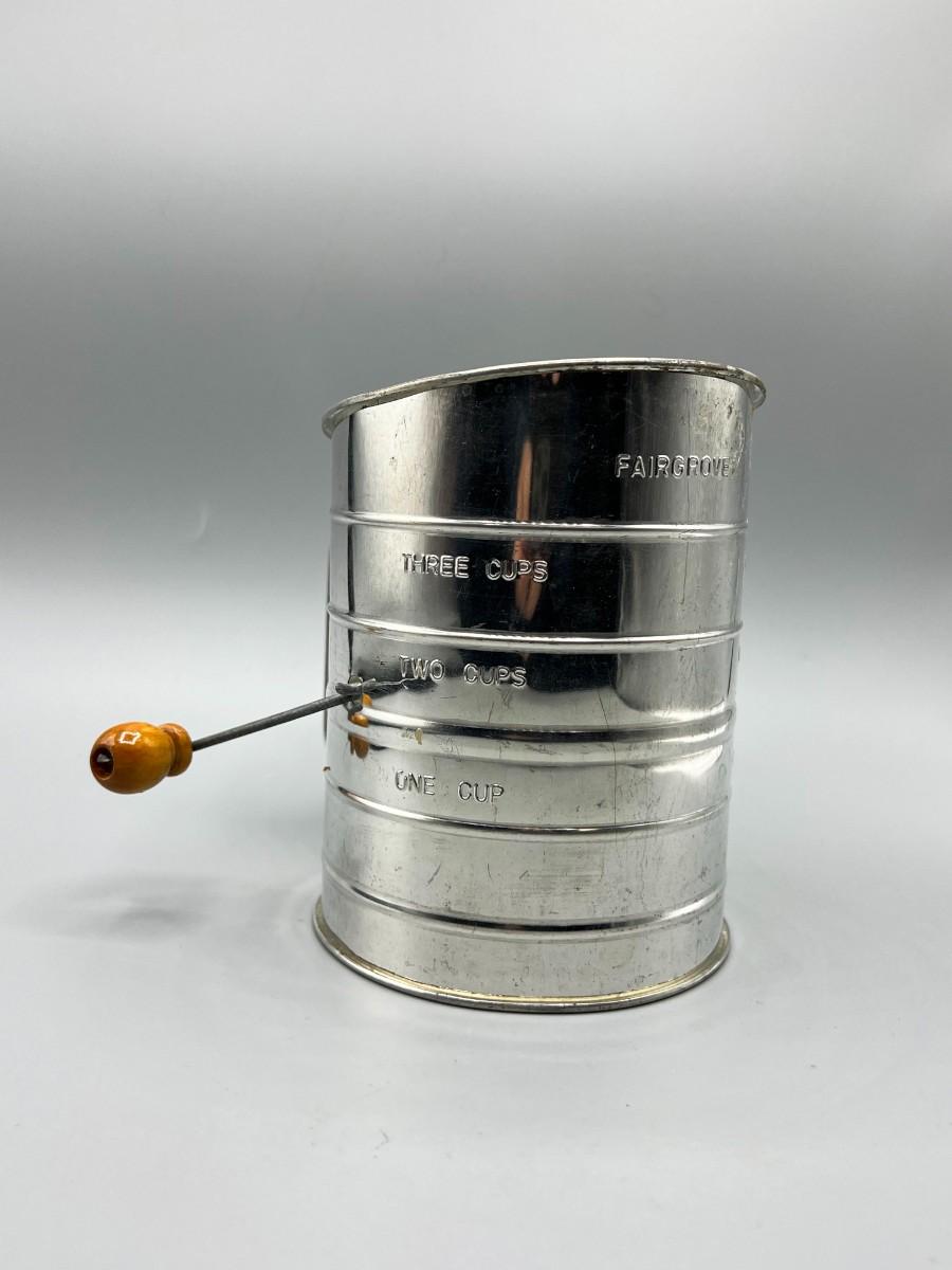 Vintage Fairgrove Kitchen Bakeware 3 Cup Flour Sifter with Wood Handle, there is no significant dents or damage to the sifter and is in good vintage condition. Check pictures for more details and for sizing.
