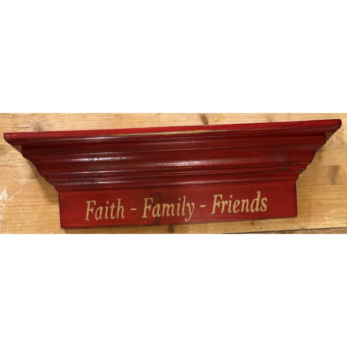 Vintage Faith - Family - Friends Red w/ White Lettering Wood Shelf Ready To Hang
