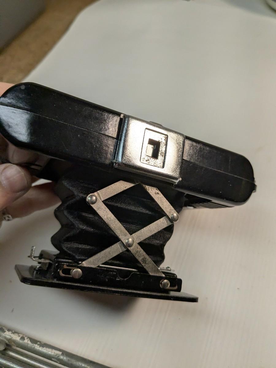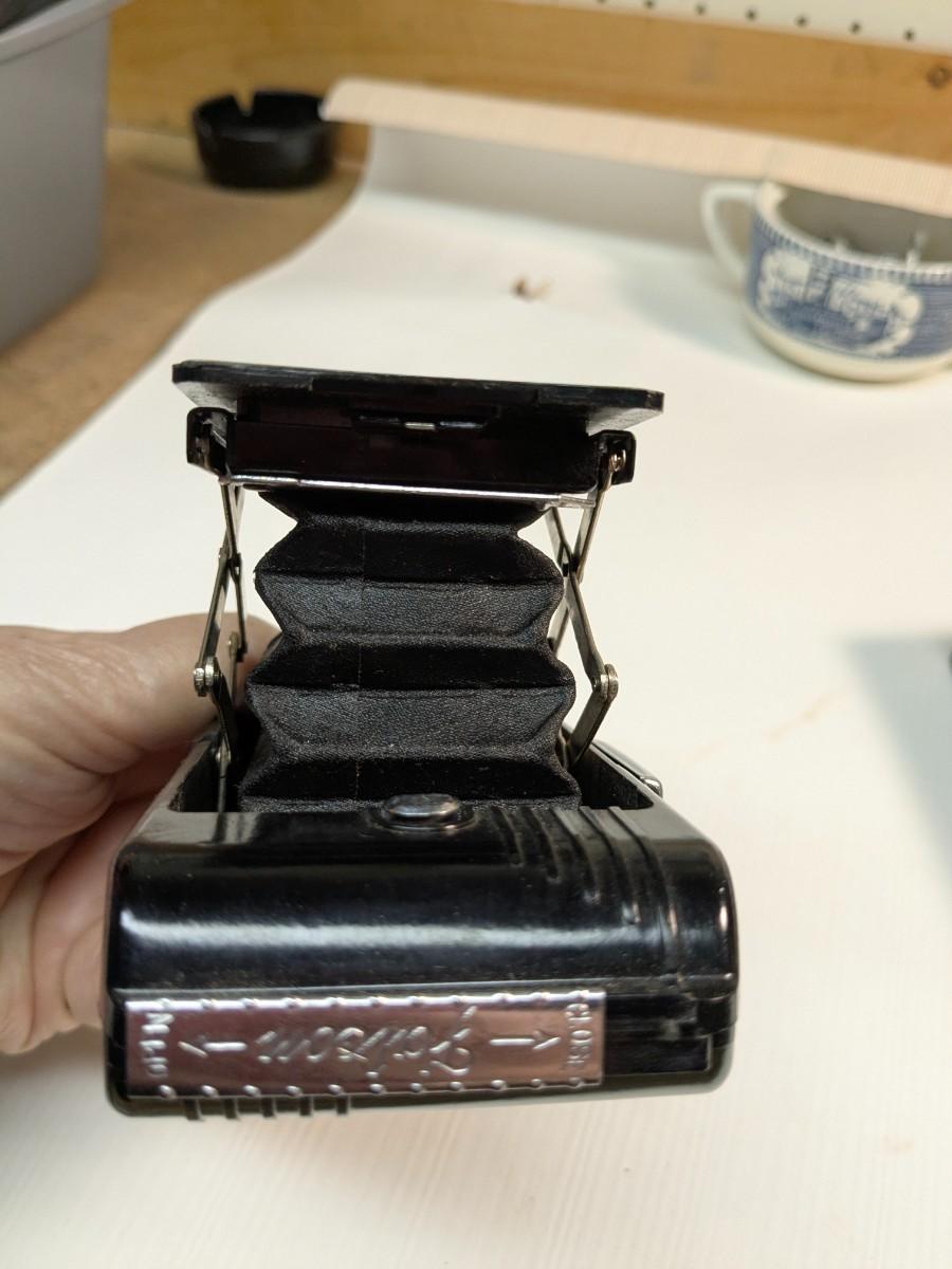 The Utility Manufacturing Co. of New York offered this strut-folding "vest pocket" Falcon Model V-16 camera which used 127 film. It is essentially similar to the Falcon Junior, aside from the styling of the faceplate; but its film gate and viewfinder are masked to expose 16 exposures per roll rather than 8.