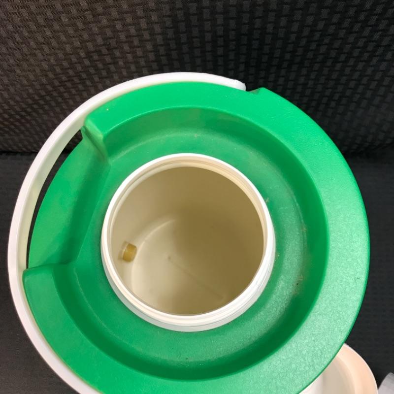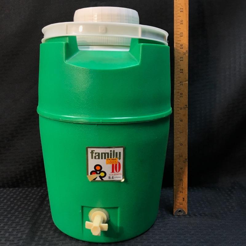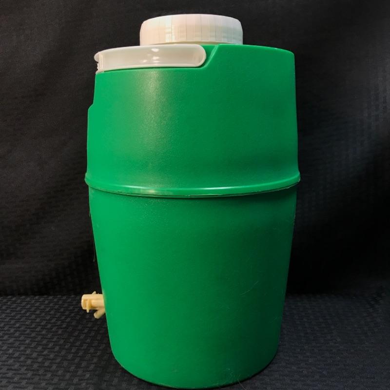 Up for auction is a vintage water dispenser from the 1970s. Doesn’t appear to have been used much. It has a two compartment lid which also doubles as a cup. There are no visible cracks or holes; see pictures.