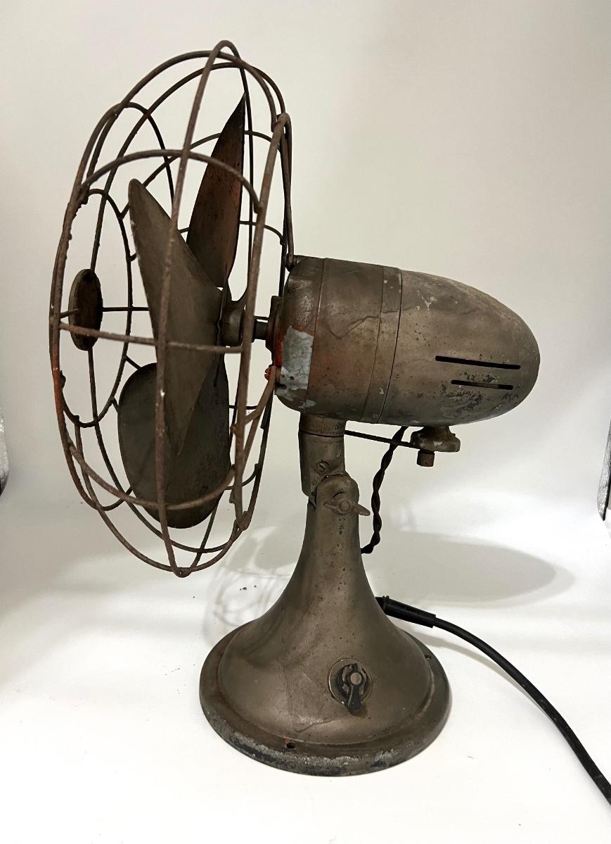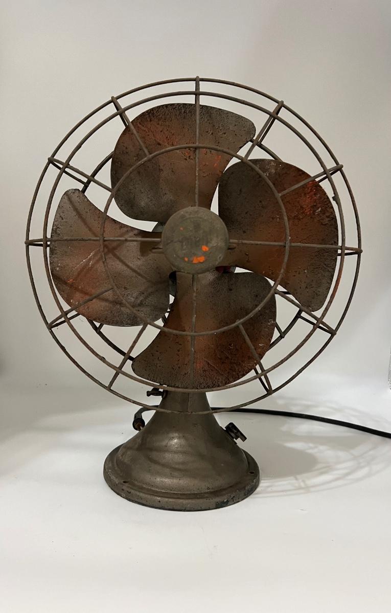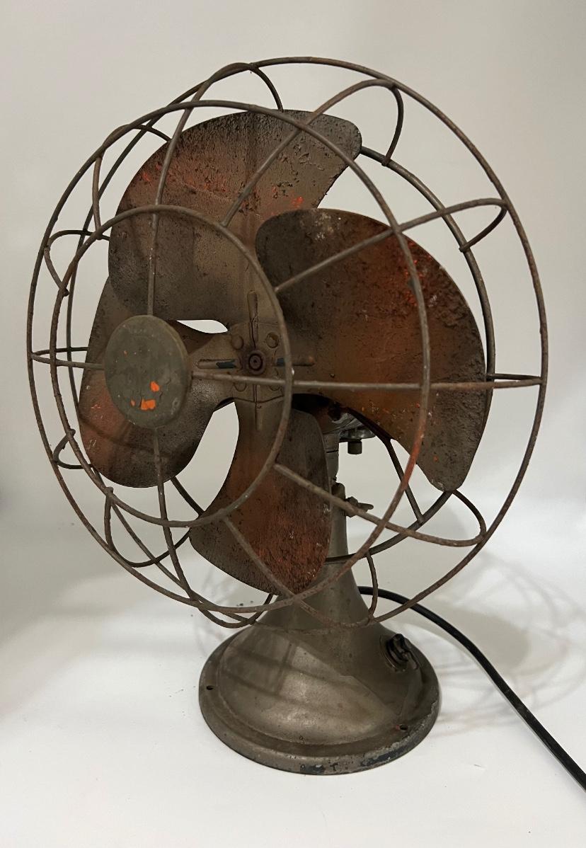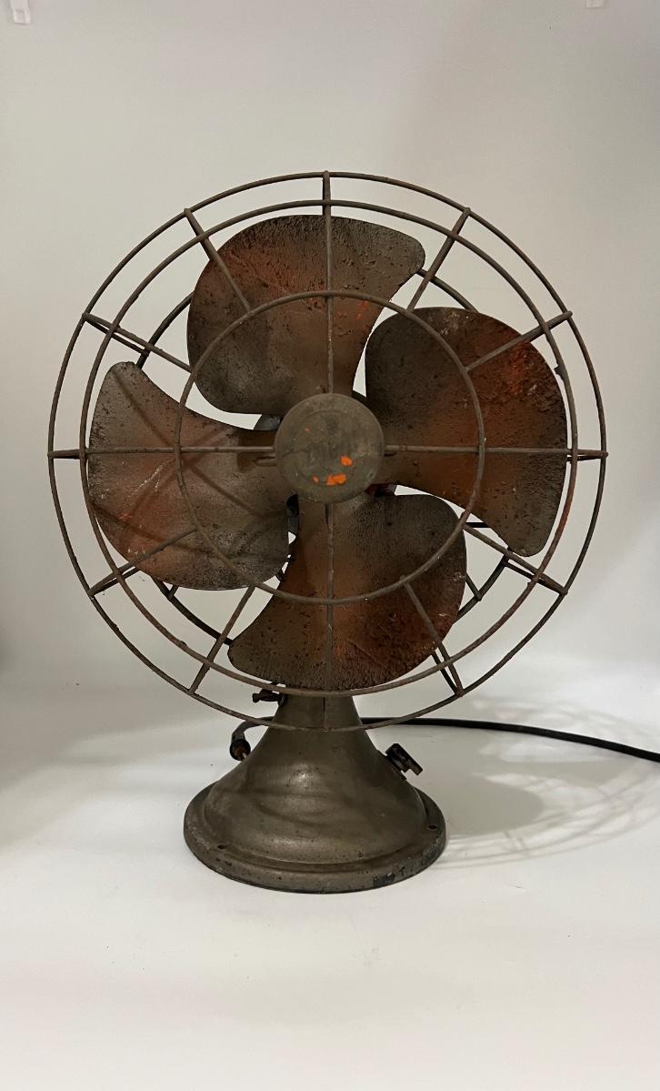 Vintage table fan possibly DIELL. This fan is heavy! NOT TESTED! Cord looks like it needs to be redone. Selling as a decorative piece only. Measures 19 inches and 13 1/2 inches wide.