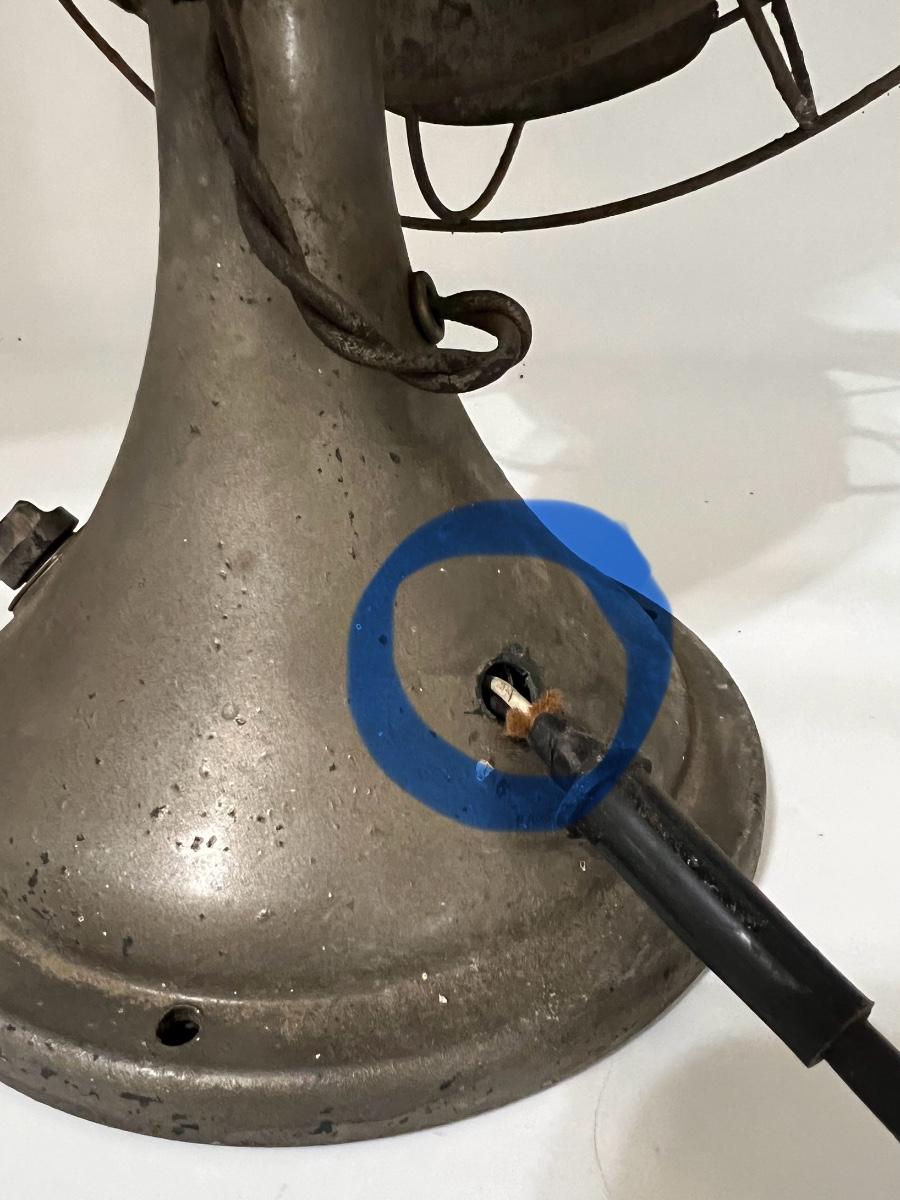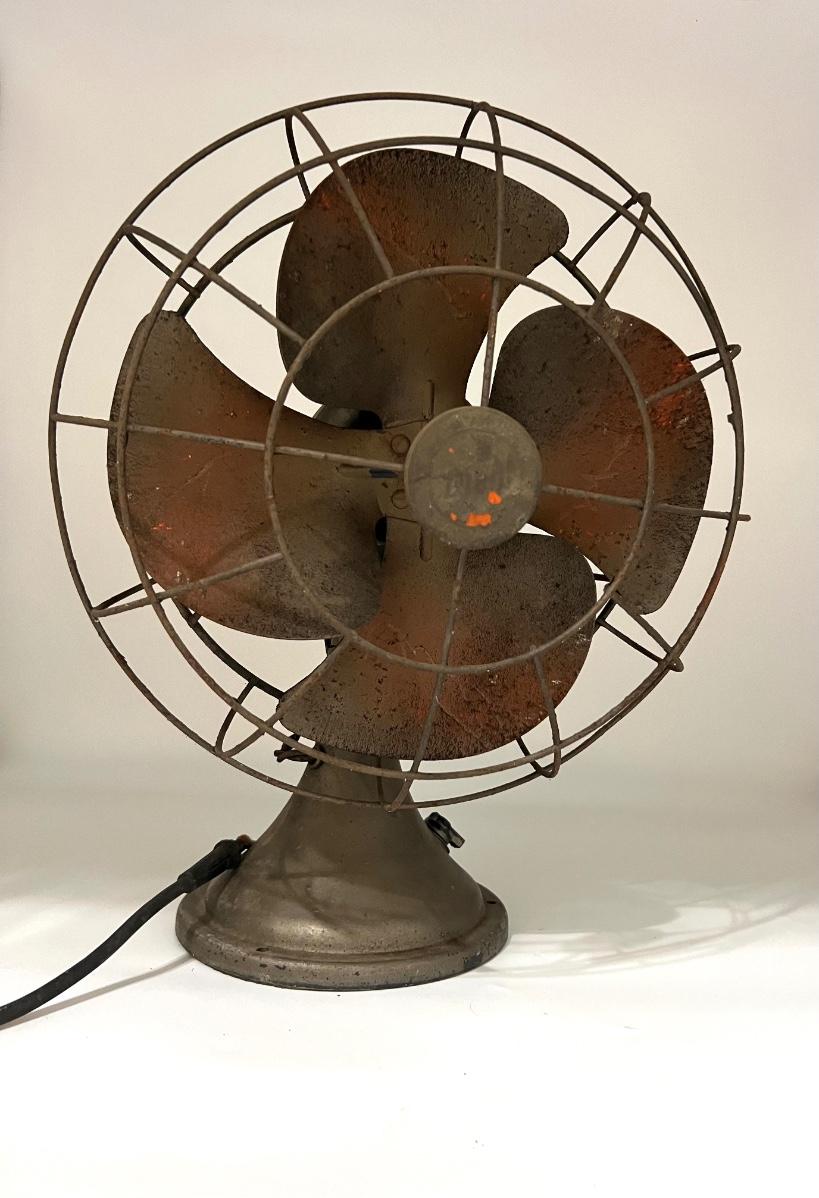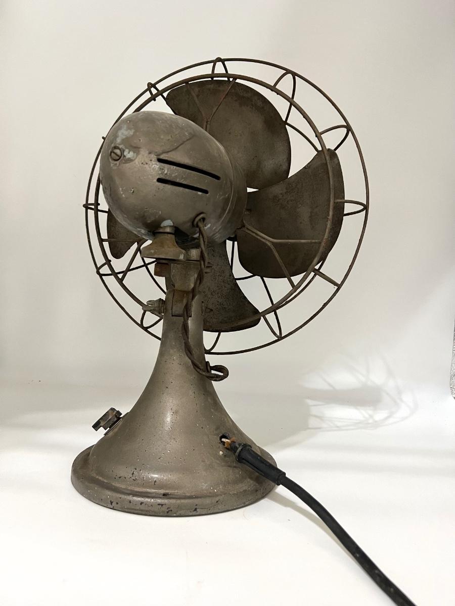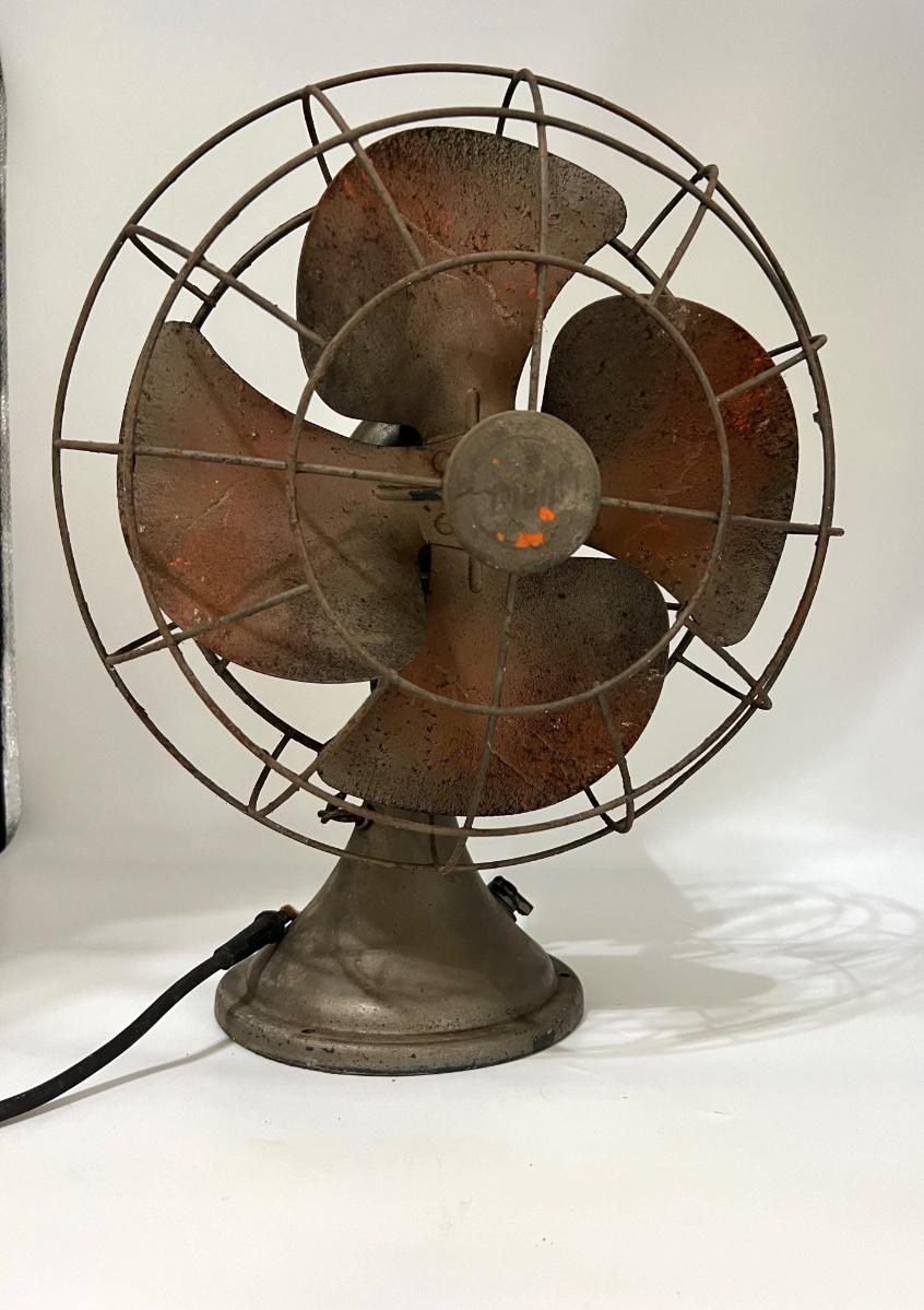 Vintage table fan possibly DIELL. This fan is heavy! NOT TESTED! Cord looks like it needs to be redone. Selling as a decorative piece only. Measures 19 inches and 13 1/2 inches wide.