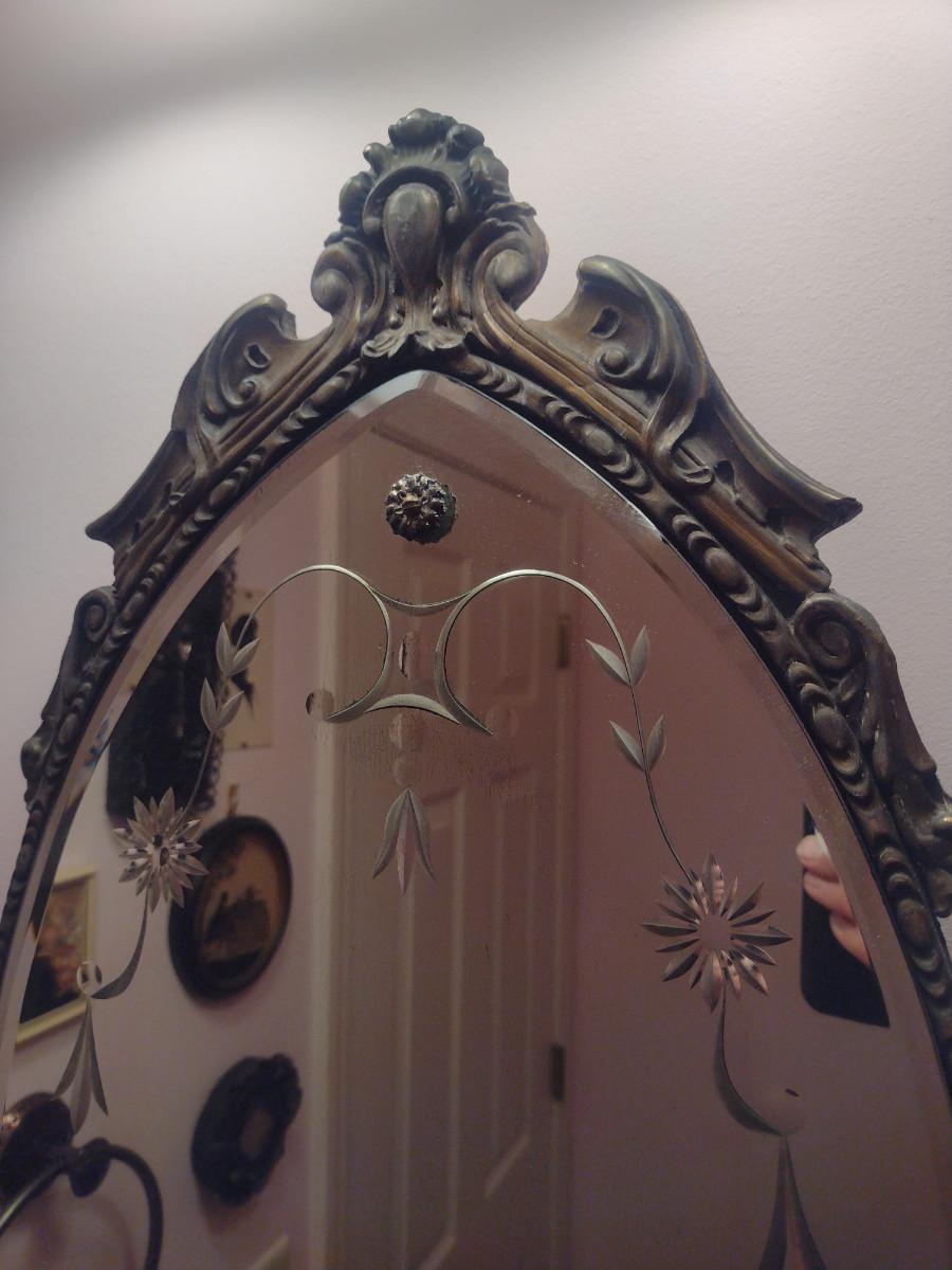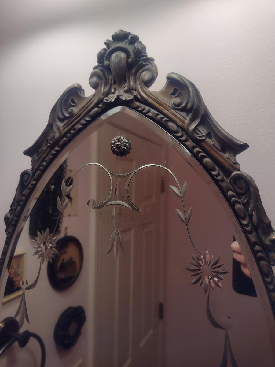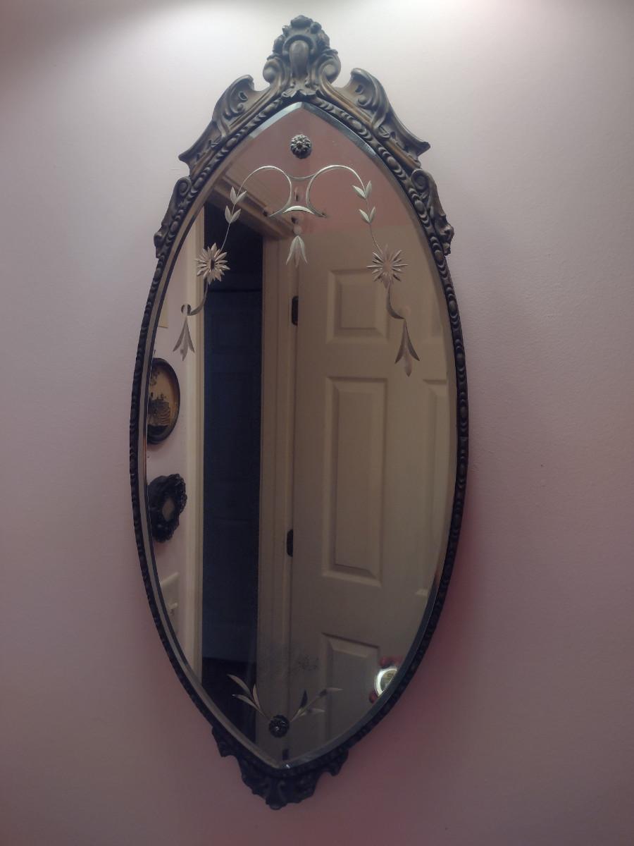 Vintage Fancy Framed Wall Mirror- Approx 27 1/2" x 12 1/2". Mirror is beveled and has decorative etching.