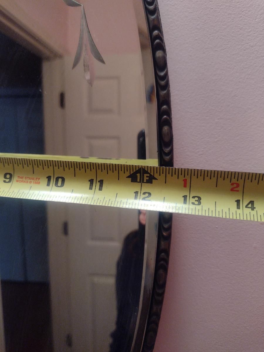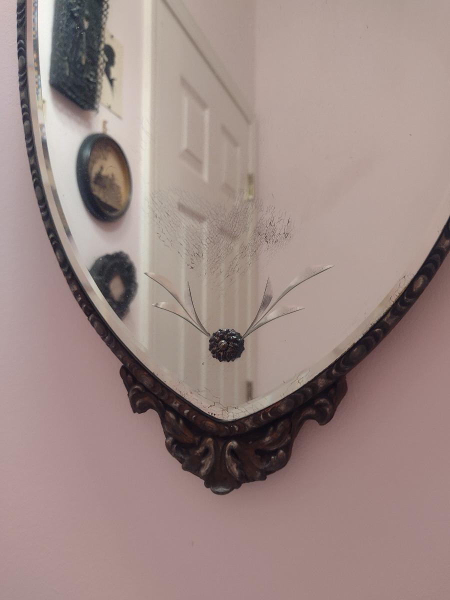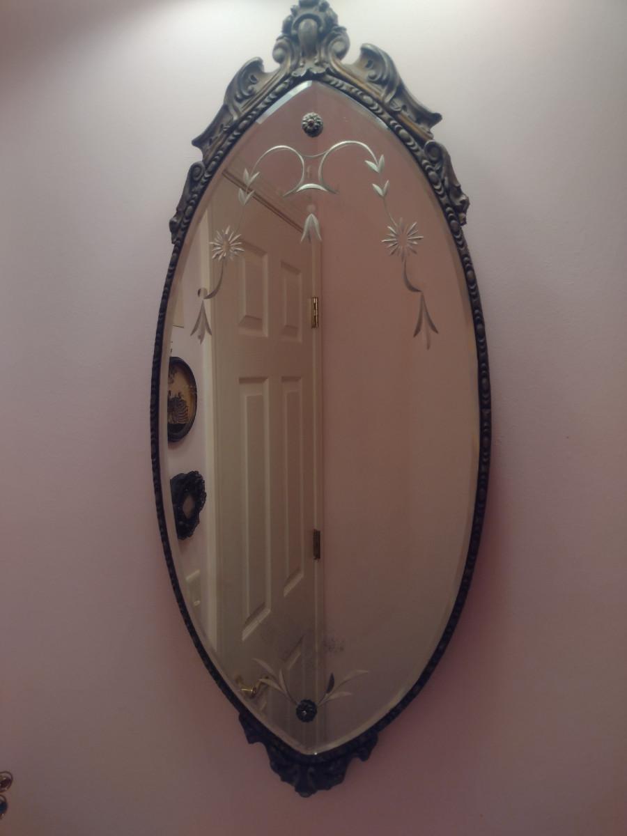 Vintage Fancy Framed Wall Mirror- Approx 27 1/2" x 12 1/2". Mirror is beveled and has decorative etching.