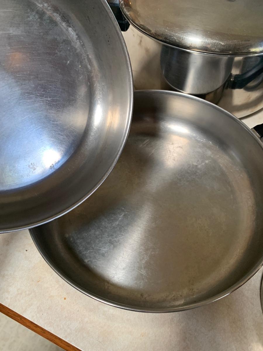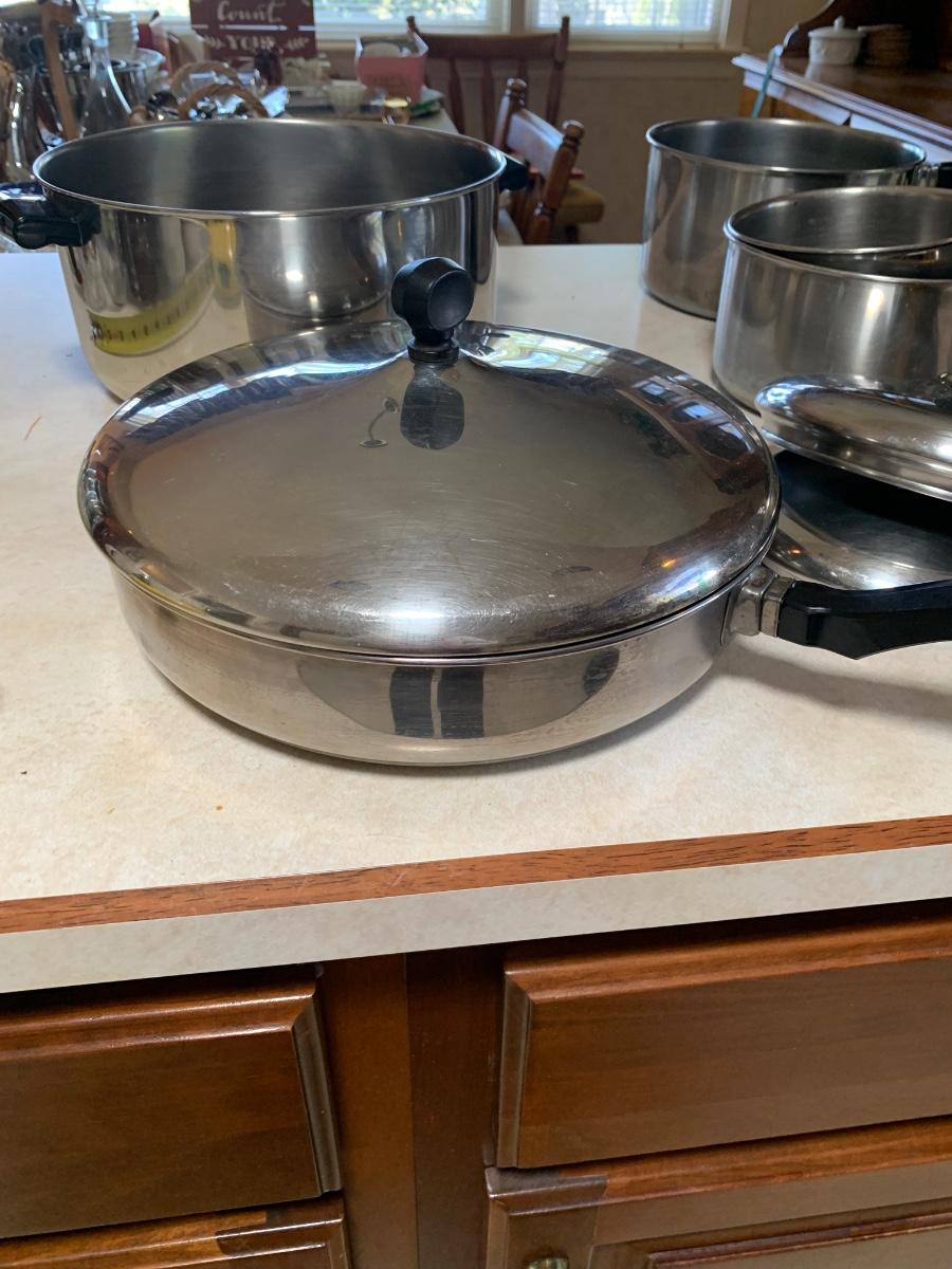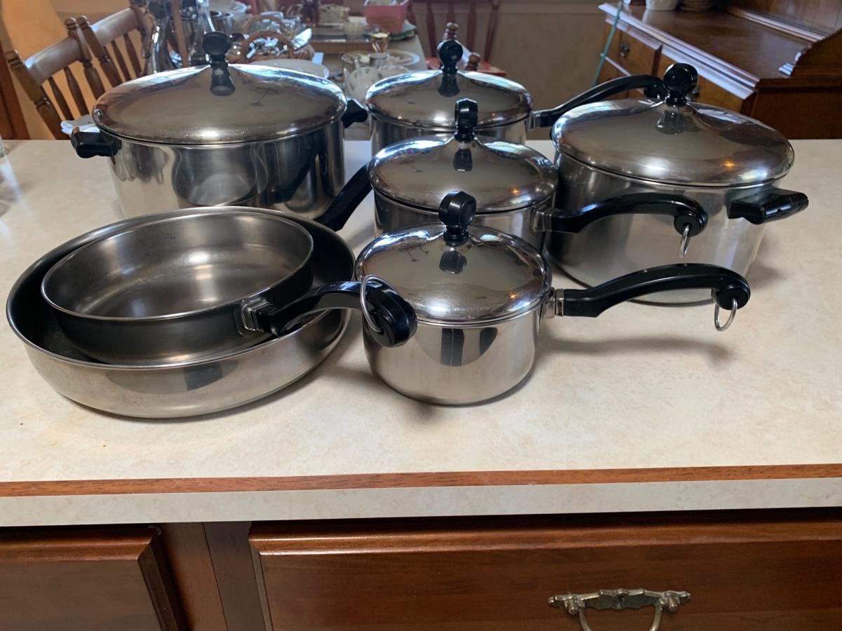 Set of 4 pots and 2 pans with lids. Used but bery good condition. Smaller pan does has handle that needs tightening