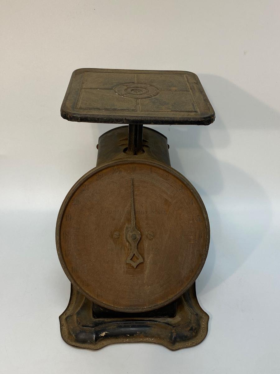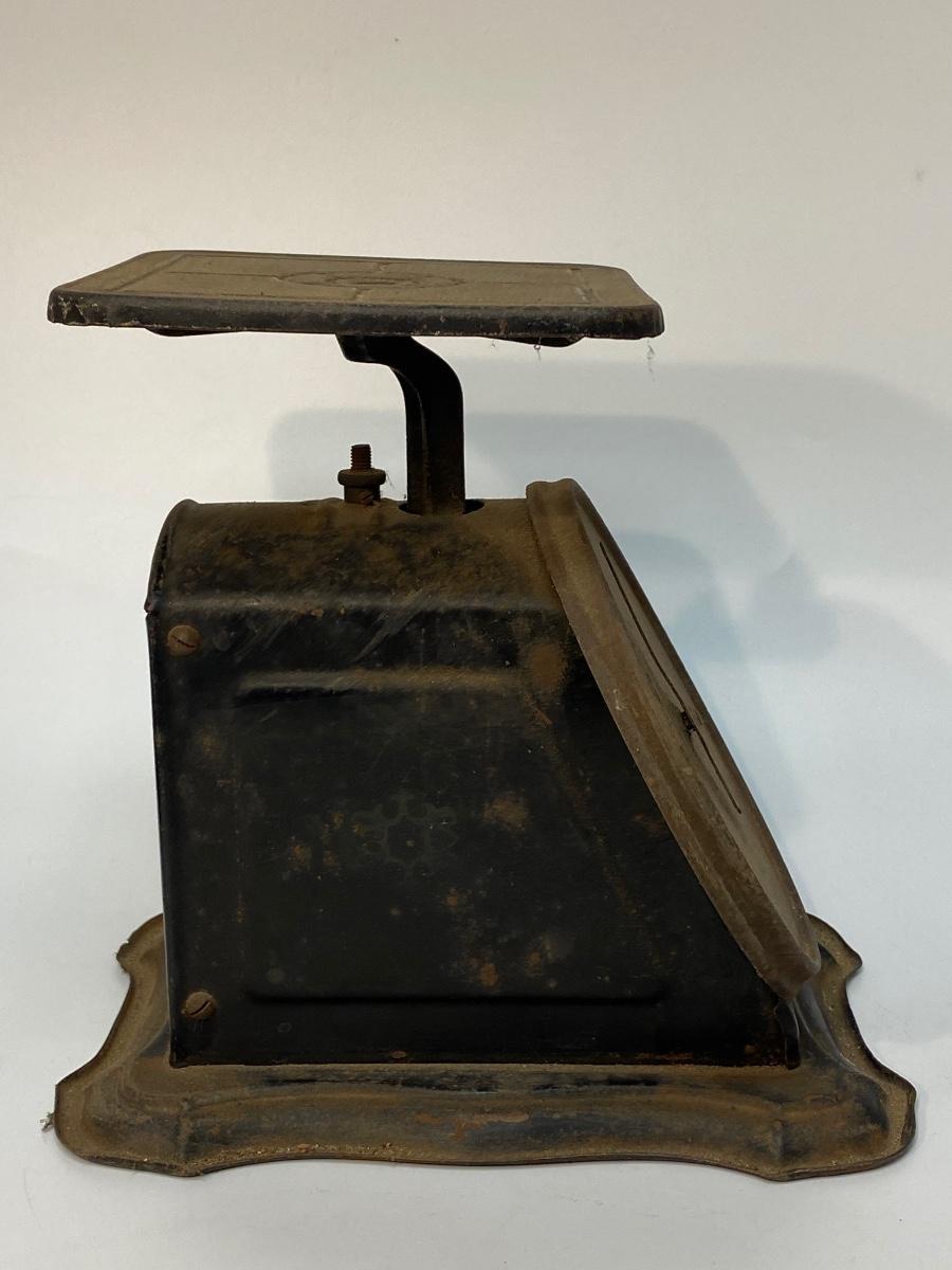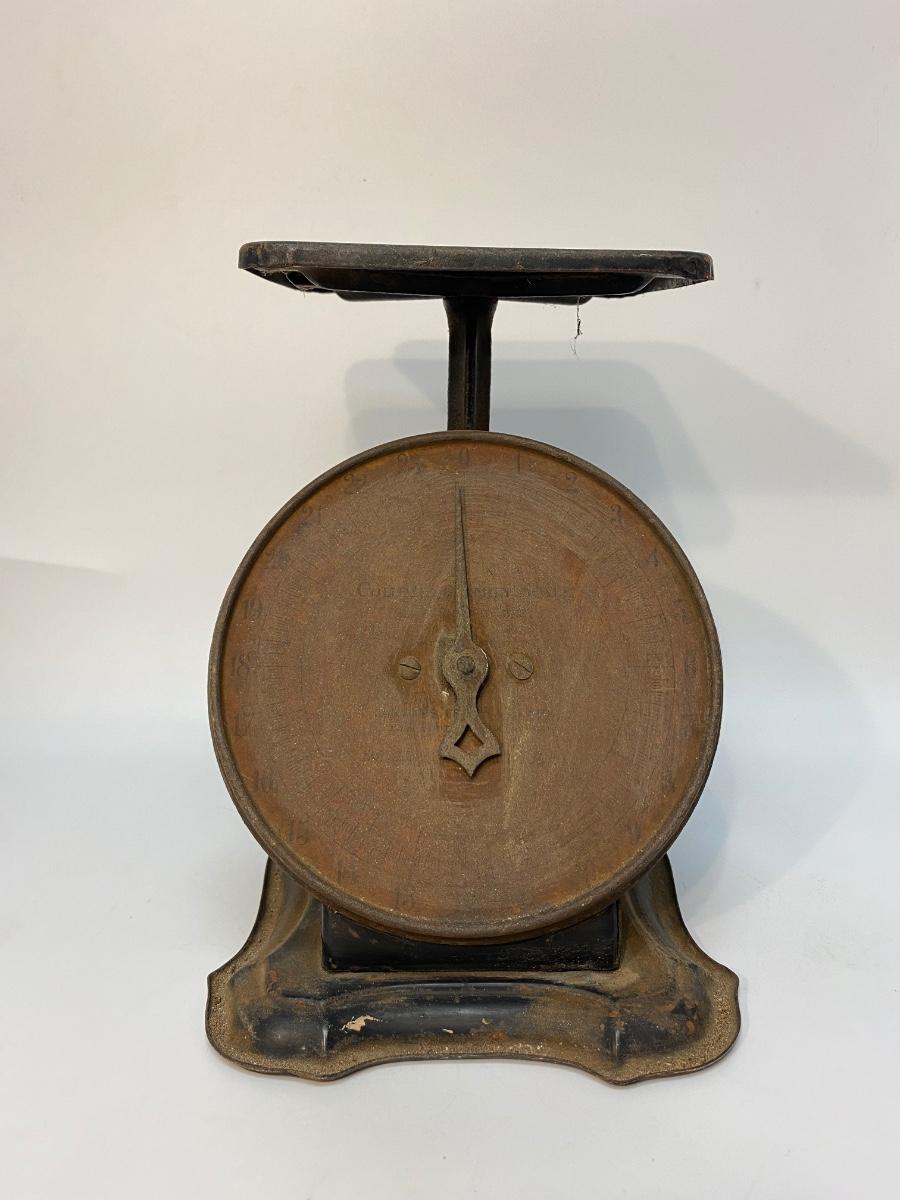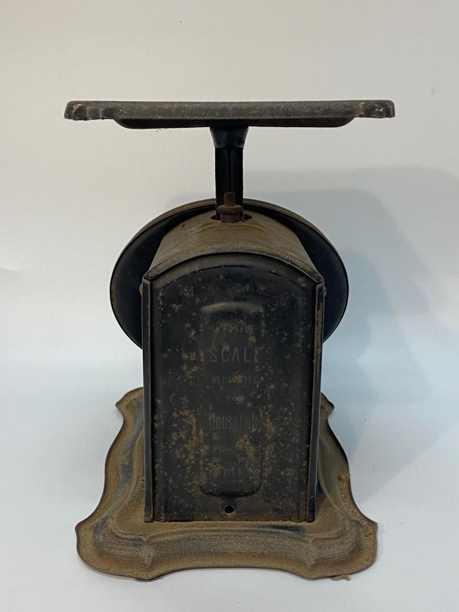 Vintage farmhouse rustic style food scale. Obvious signs of age with rusty patina, you can still see some of the wording on the front. Other than the rust it is in good condition, no major dents or dings. Not sure how well it would clean up. Great for decor.