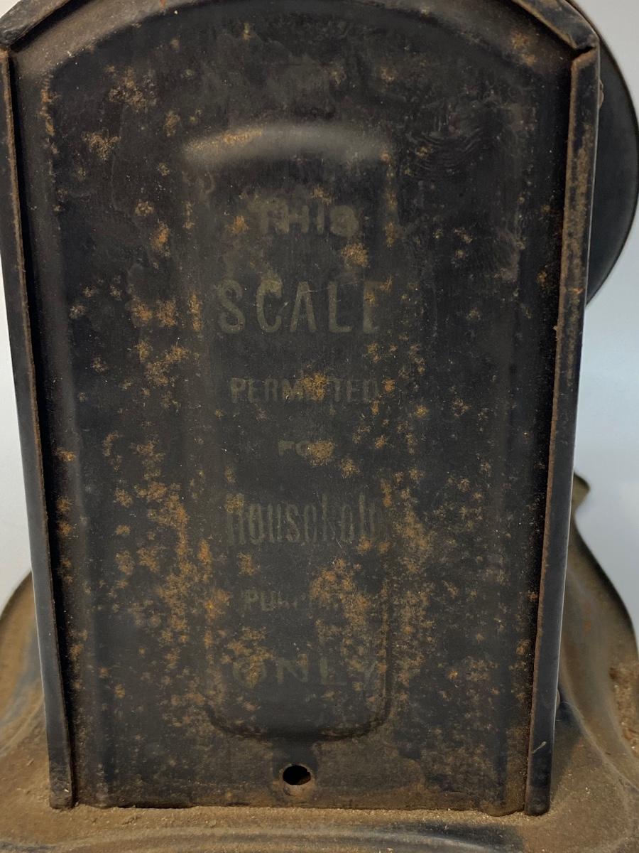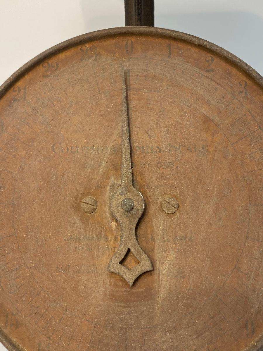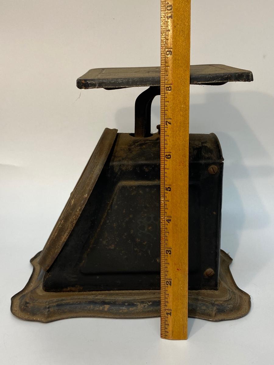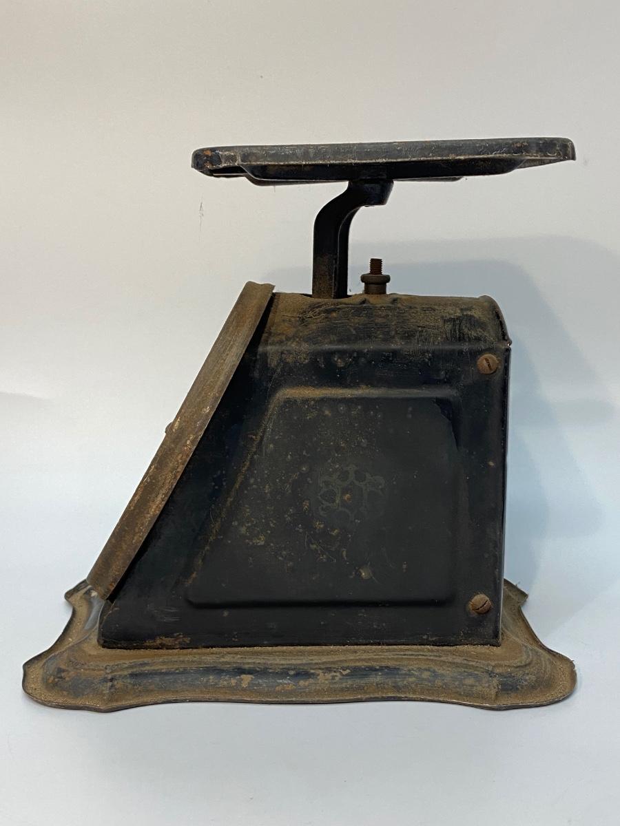 Vintage farmhouse rustic style food scale. Obvious signs of age with rusty patina, you can still see some of the wording on the front. Other than the rust it is in good condition, no major dents or dings. Not sure how well it would clean up. Great for decor.