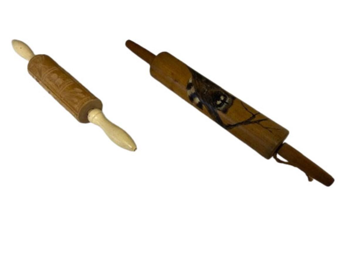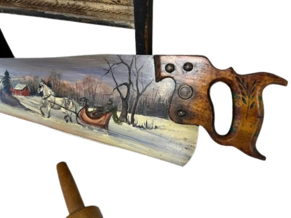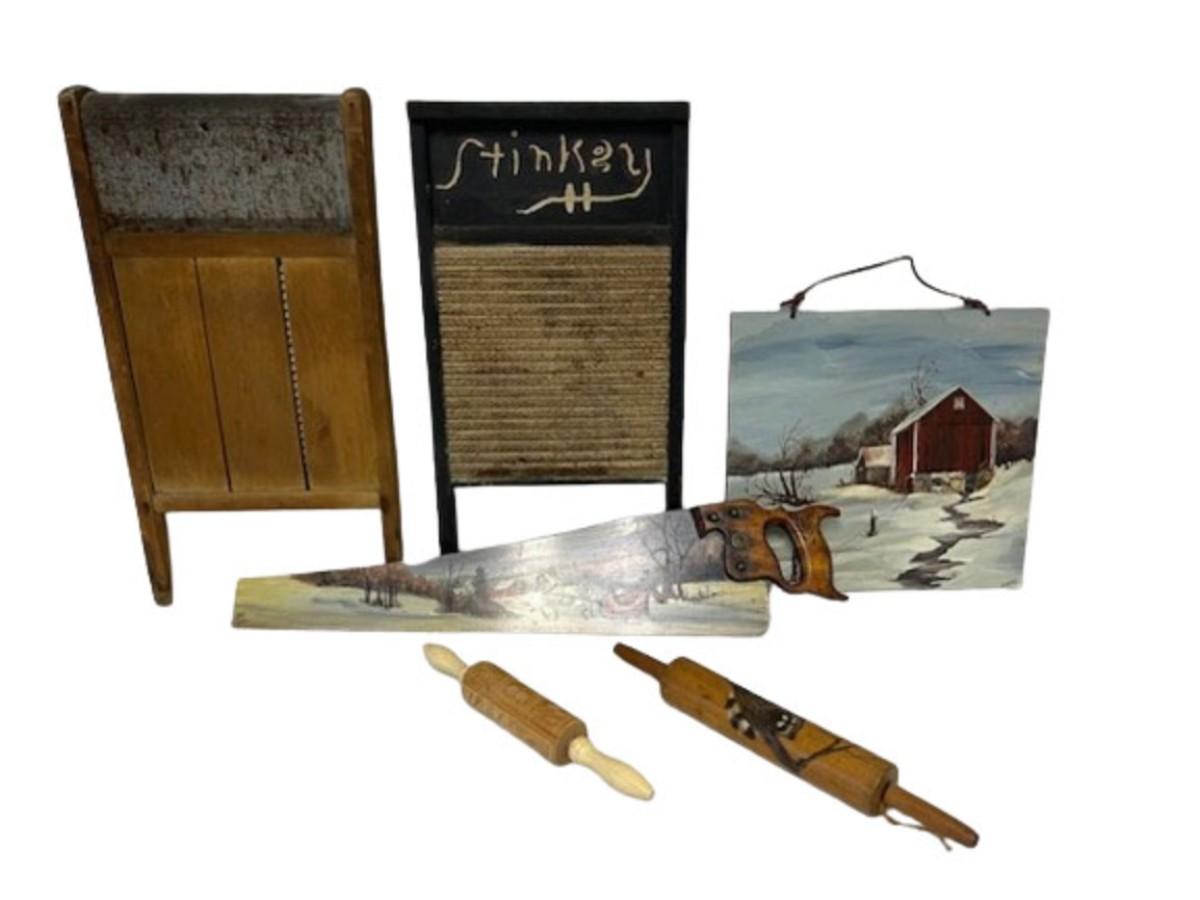 Includes 2 washboards, a painted saw, a wall plaque, and 2 rolling pins. Total of 6 pieces. [ST]