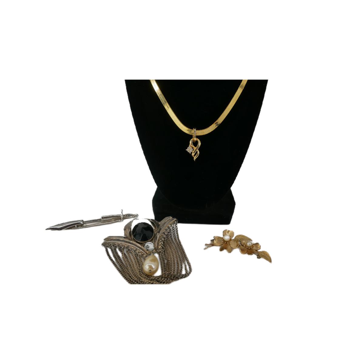 One Gold plated necklace with pendant and rhinestones. One large brooch with black plastic rhinestone. One small gold plated flower with faux pearls brooch. One stainless steel rhinestone sword tie clip. Lot weighs 2 oz. (J12)