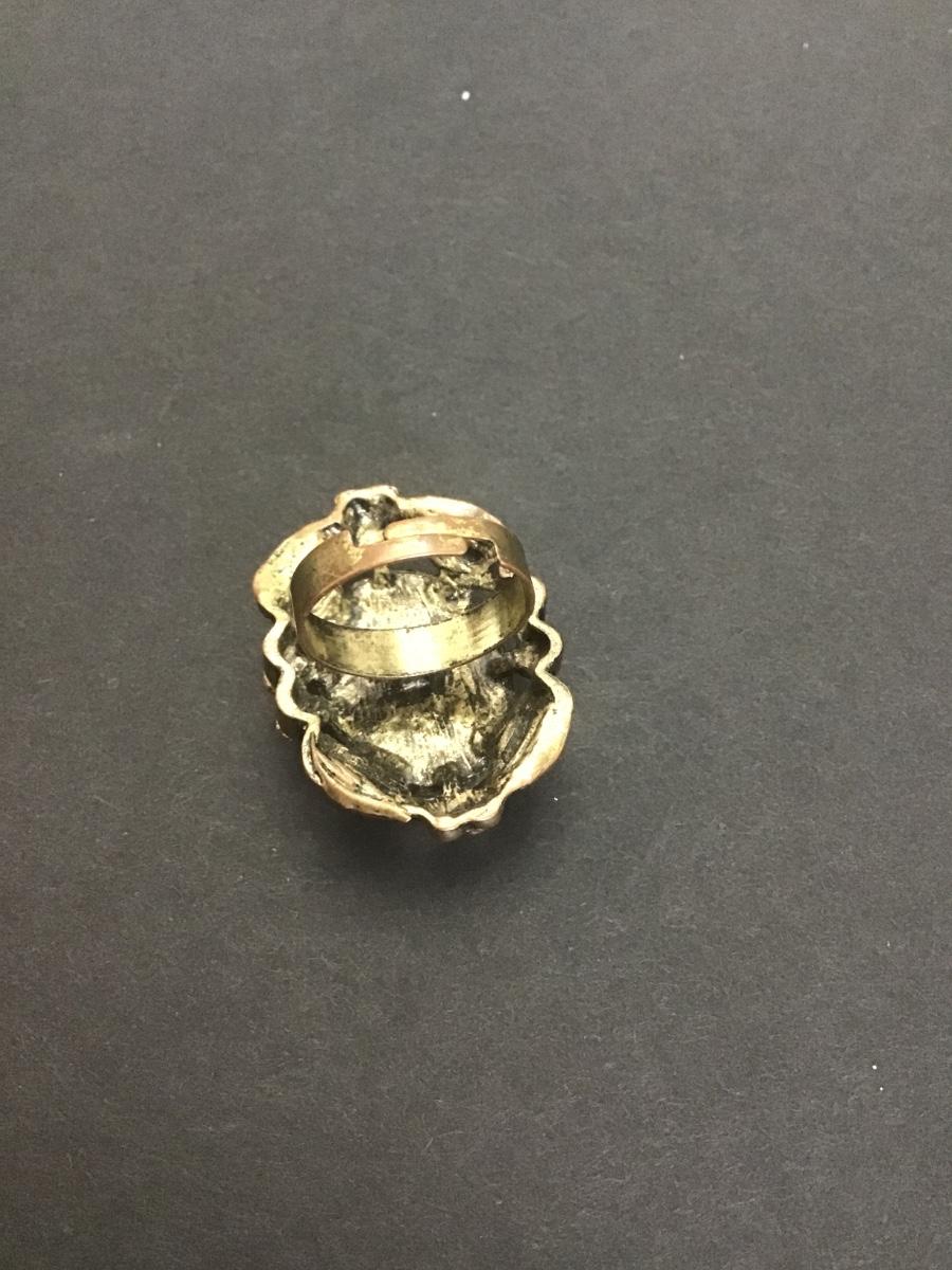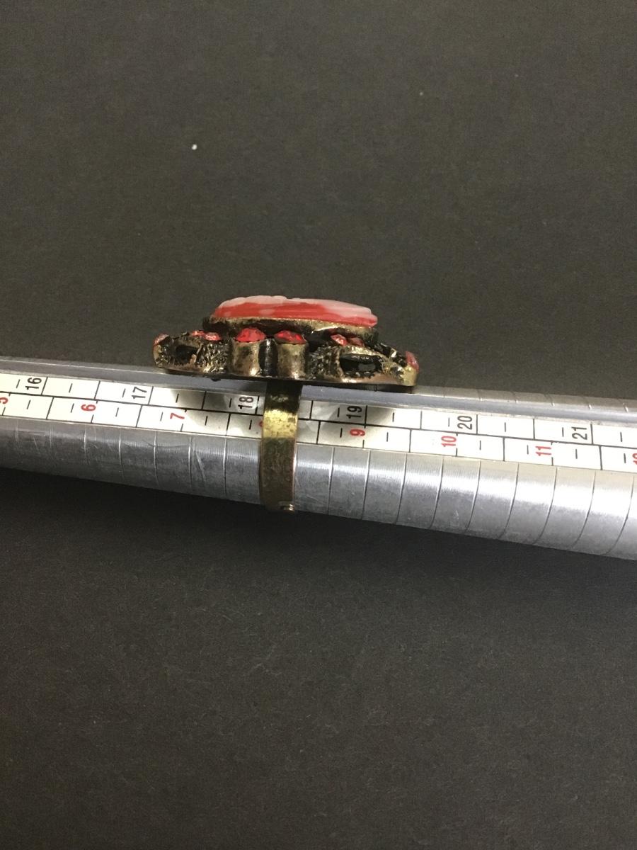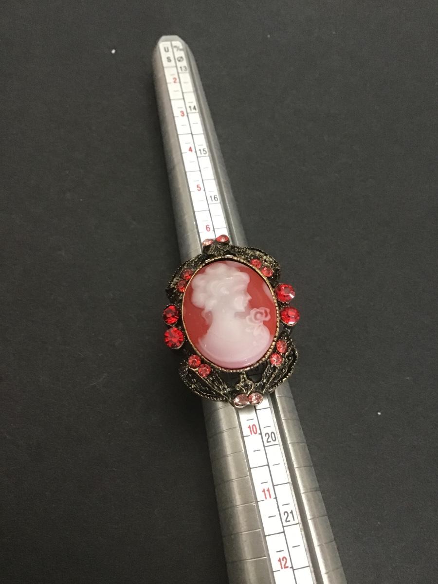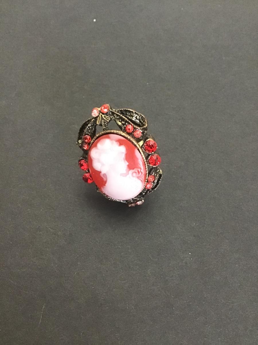 Vintage cameo, fashion statement ring with red rhinestones. Please see attached photos.