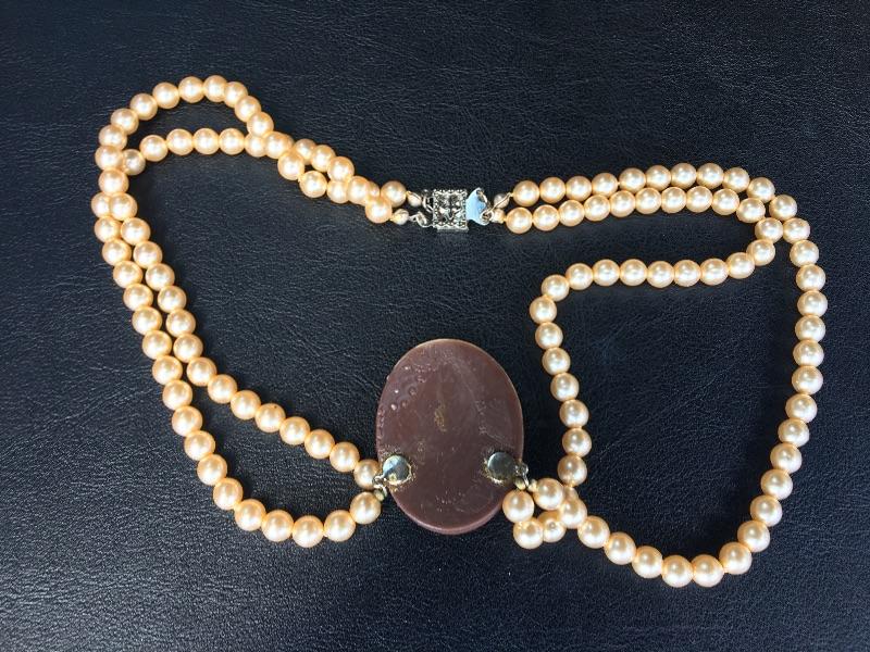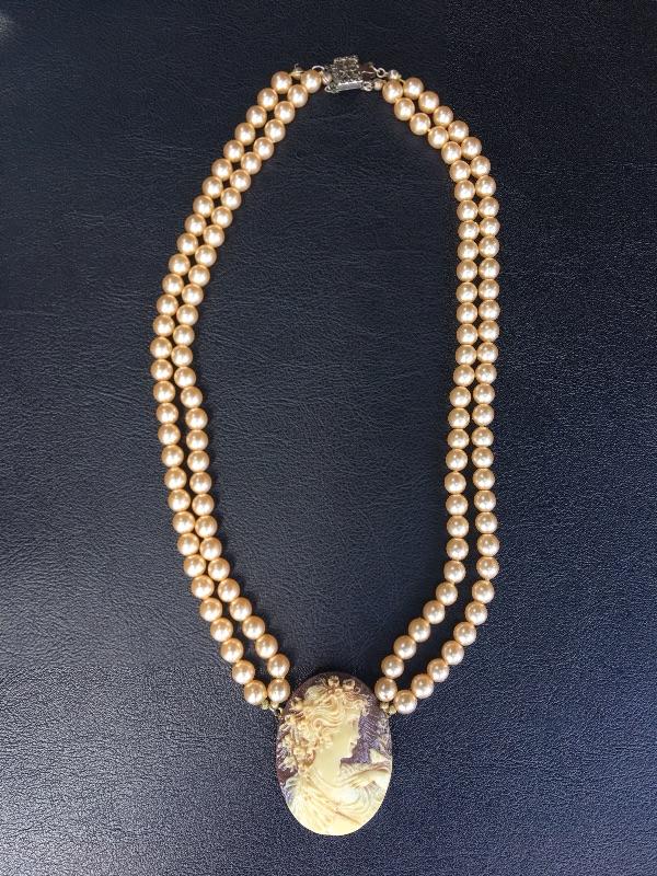 Necklace measures 15” long. Cameo pendant looks to be early resin.