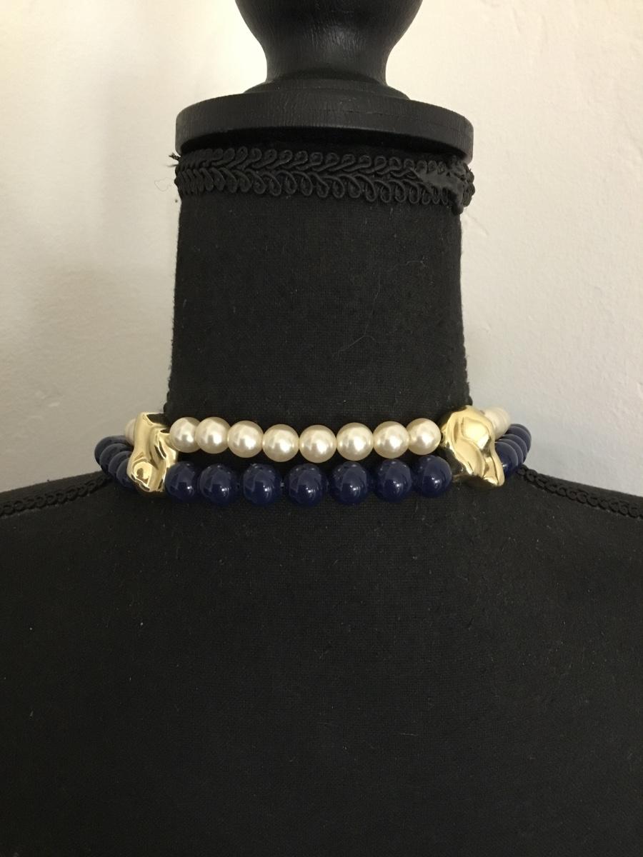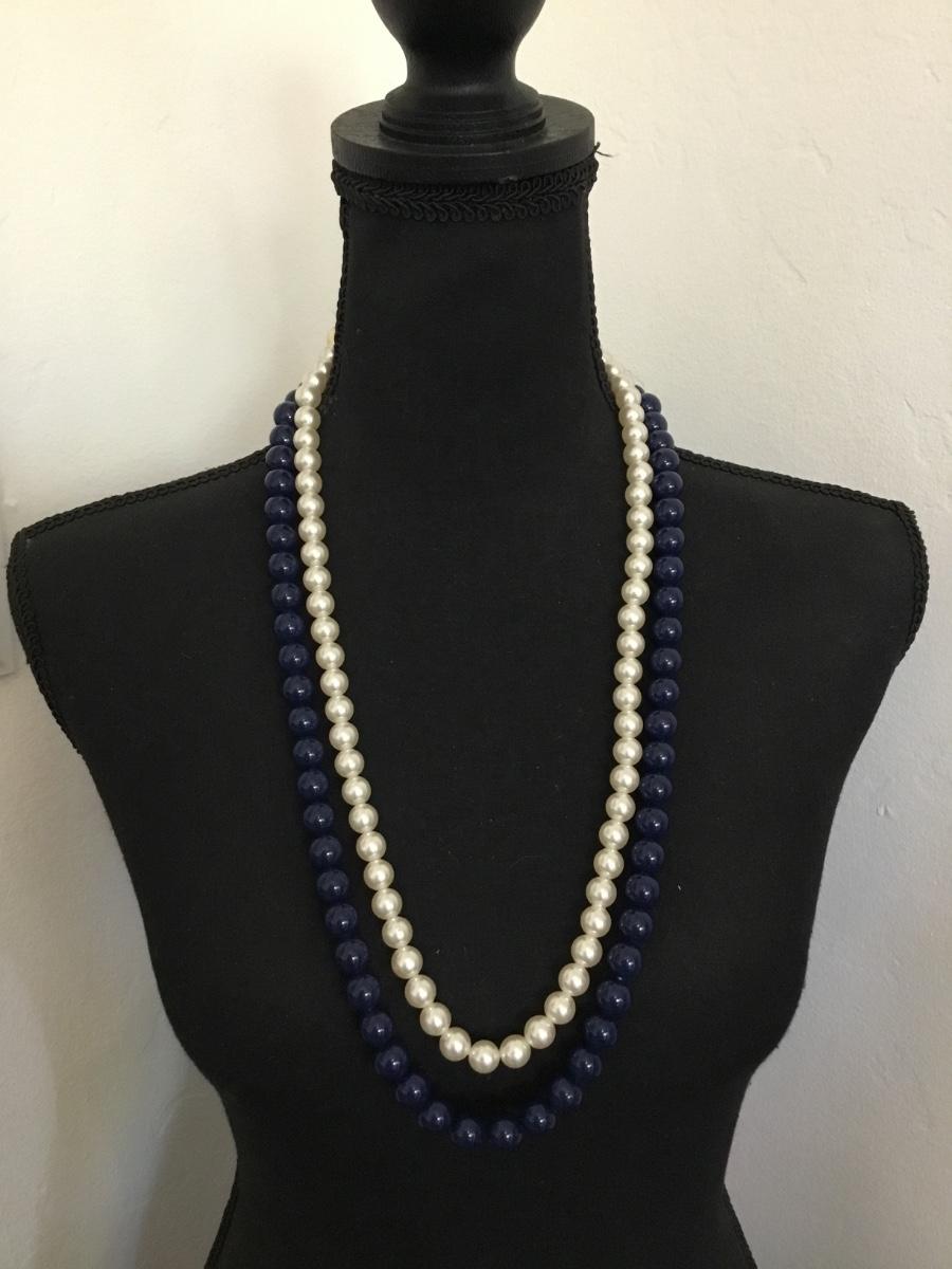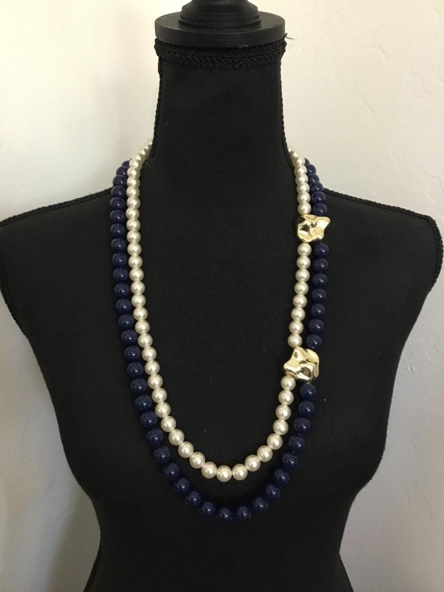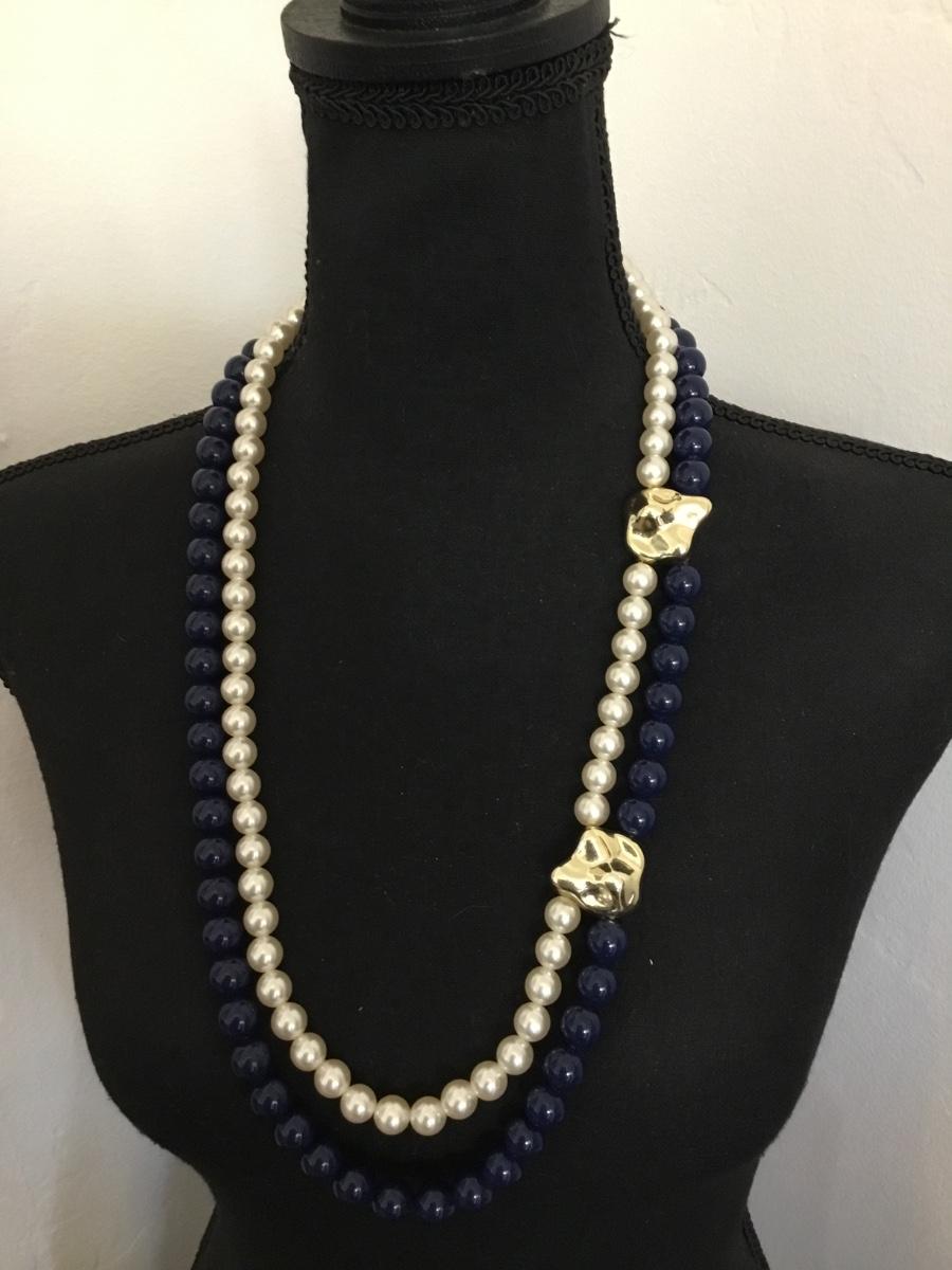 Vintage faux, pearl, dark navy blue long, beaded statement, necklace Gold tone accents