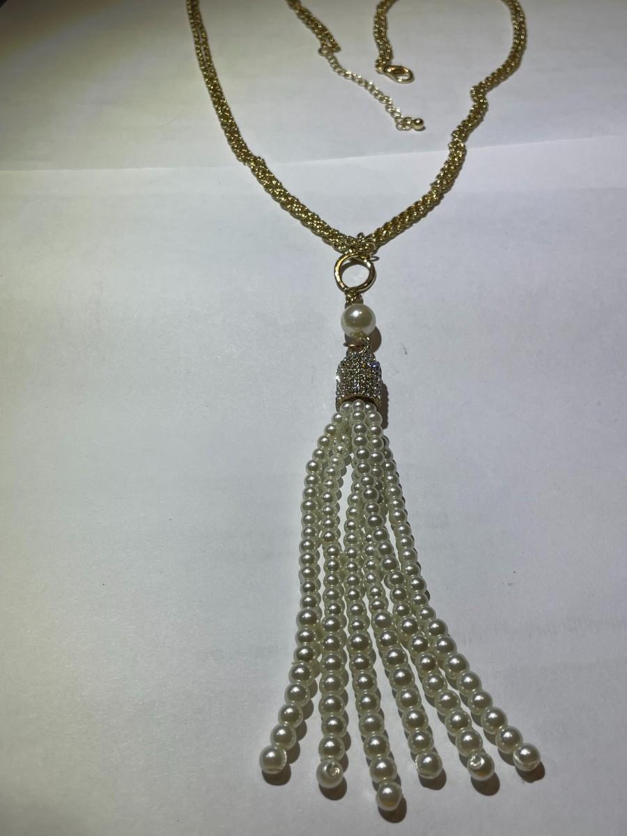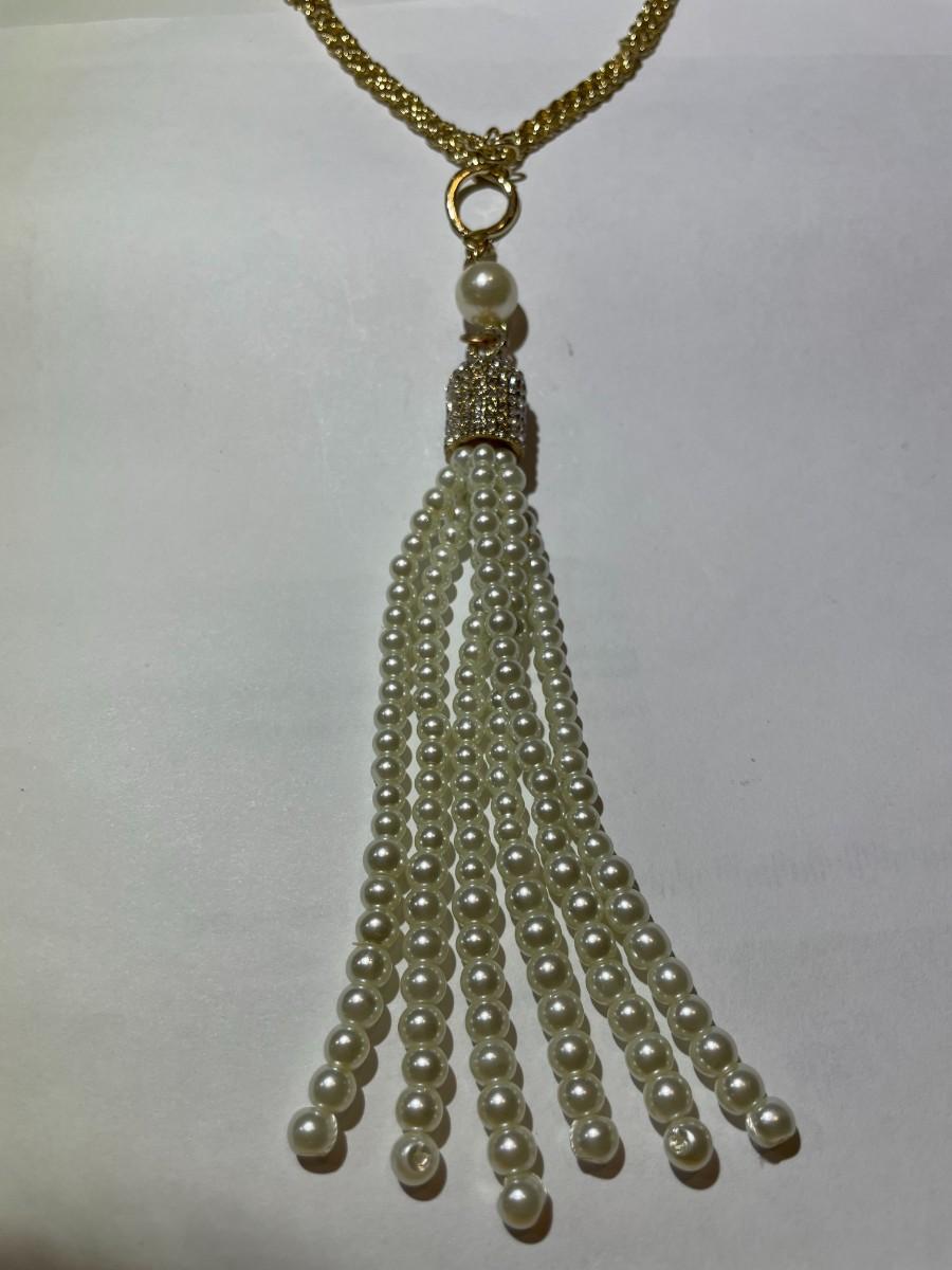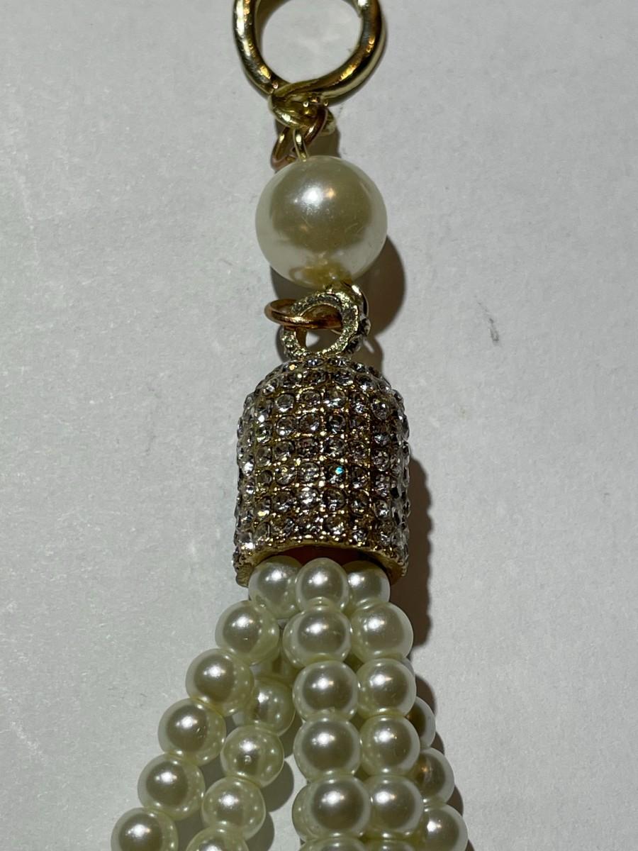 Vintage Faux Pearl & Rhinestone Pendant on a Gold-tone Double Strand Necklace 30-33" Adjustable in Very Good Preowned Condition as Pictured. $5 Domestic Shipping.