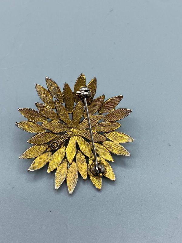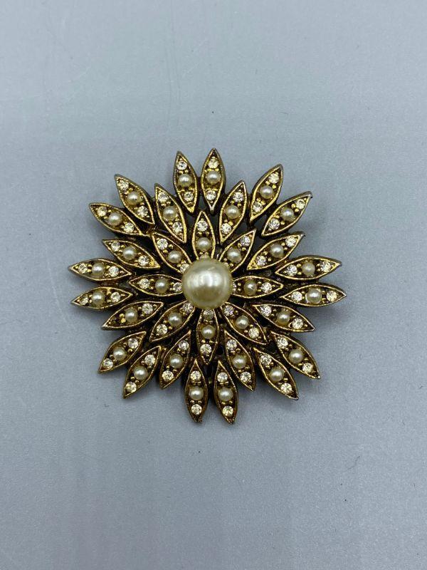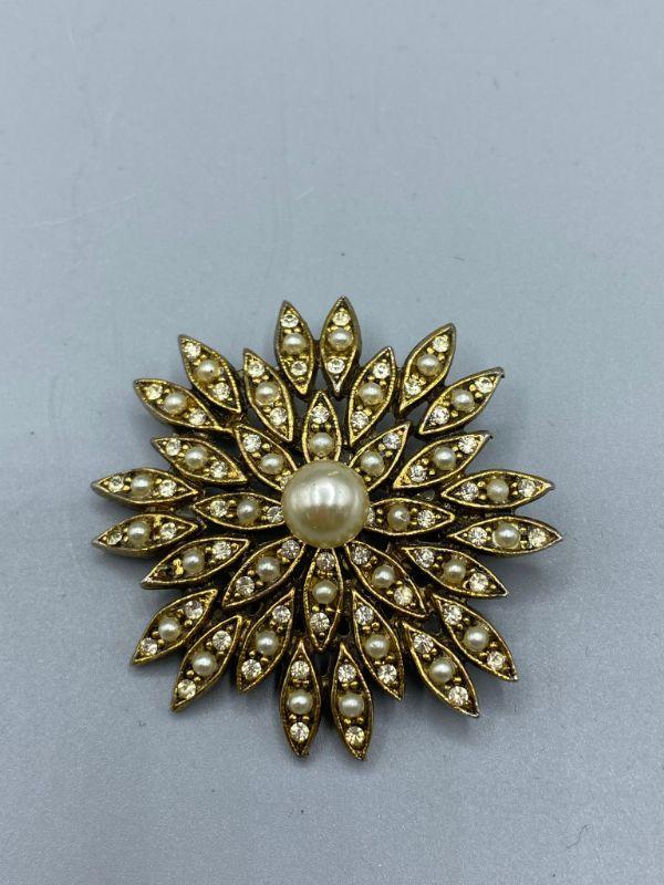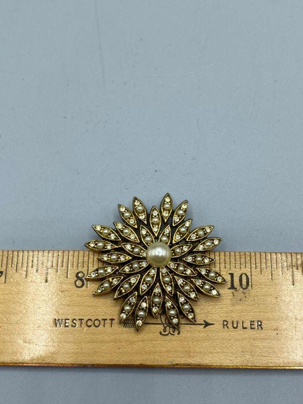 Vintage faux pearl and rhinestone pin. Starburst shape. Gold tone metal setting. About 2" size. No missing stones.
