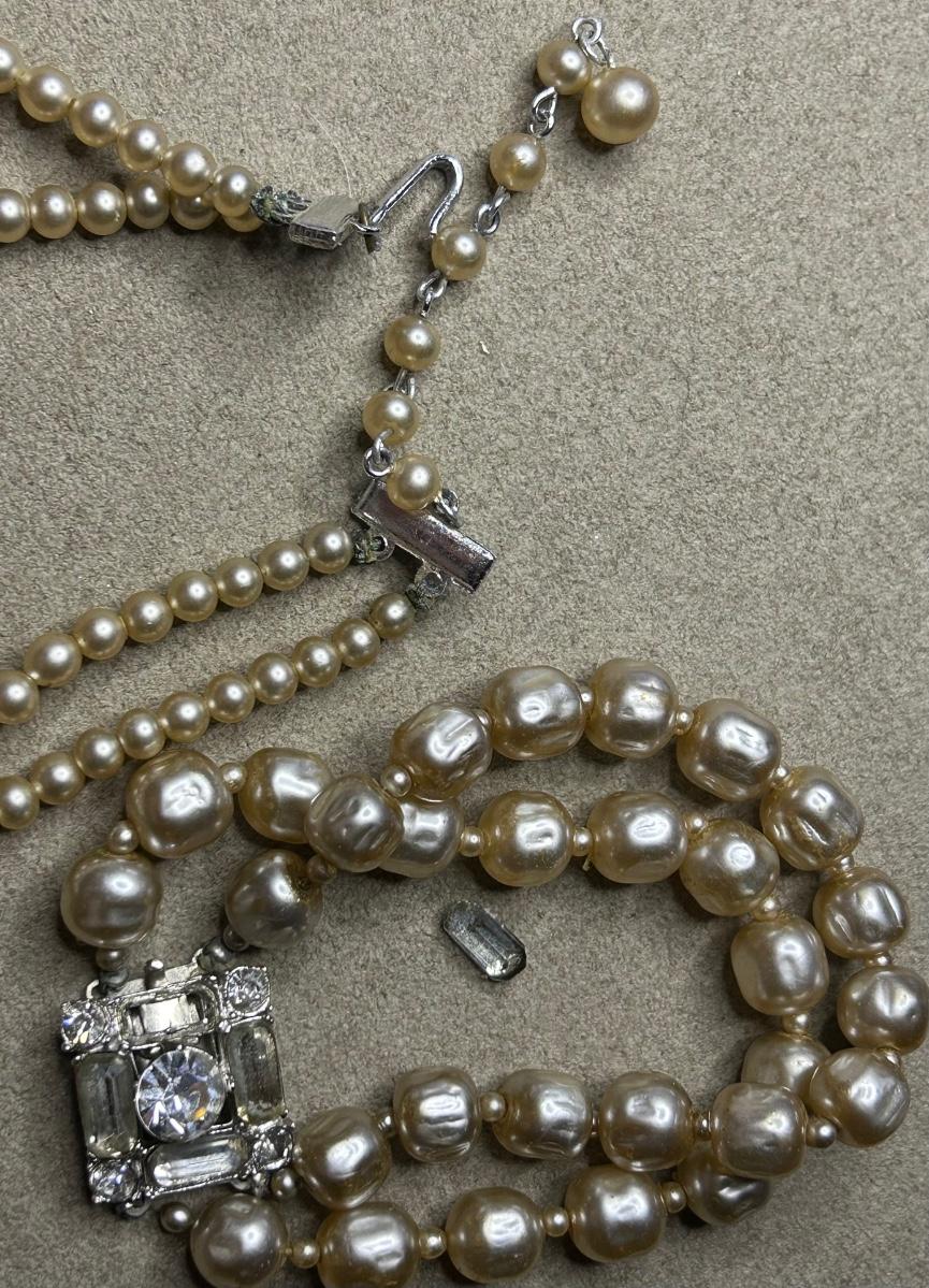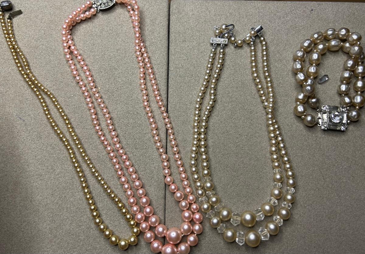 3 faux, pearl necklaces, and bracelet. 3rd 2 strand necklace is stamped Japan.