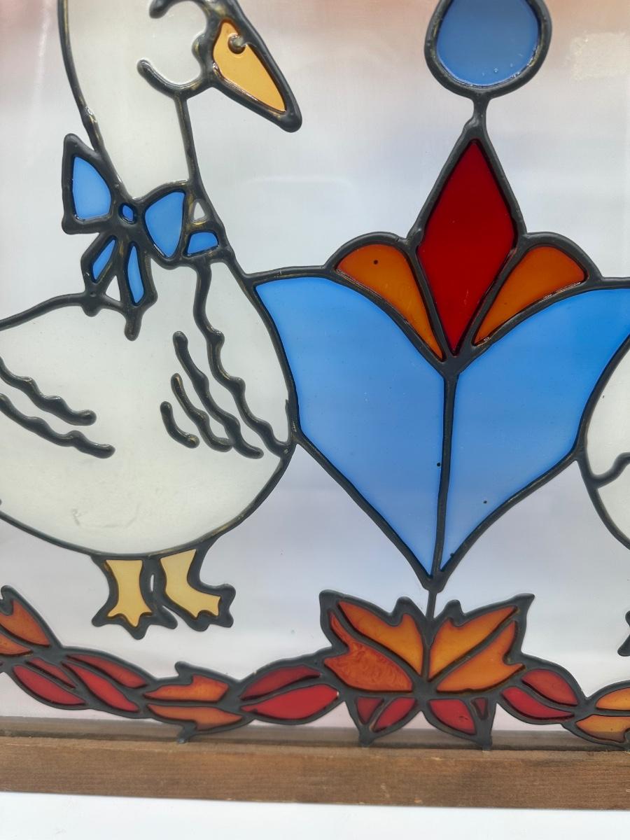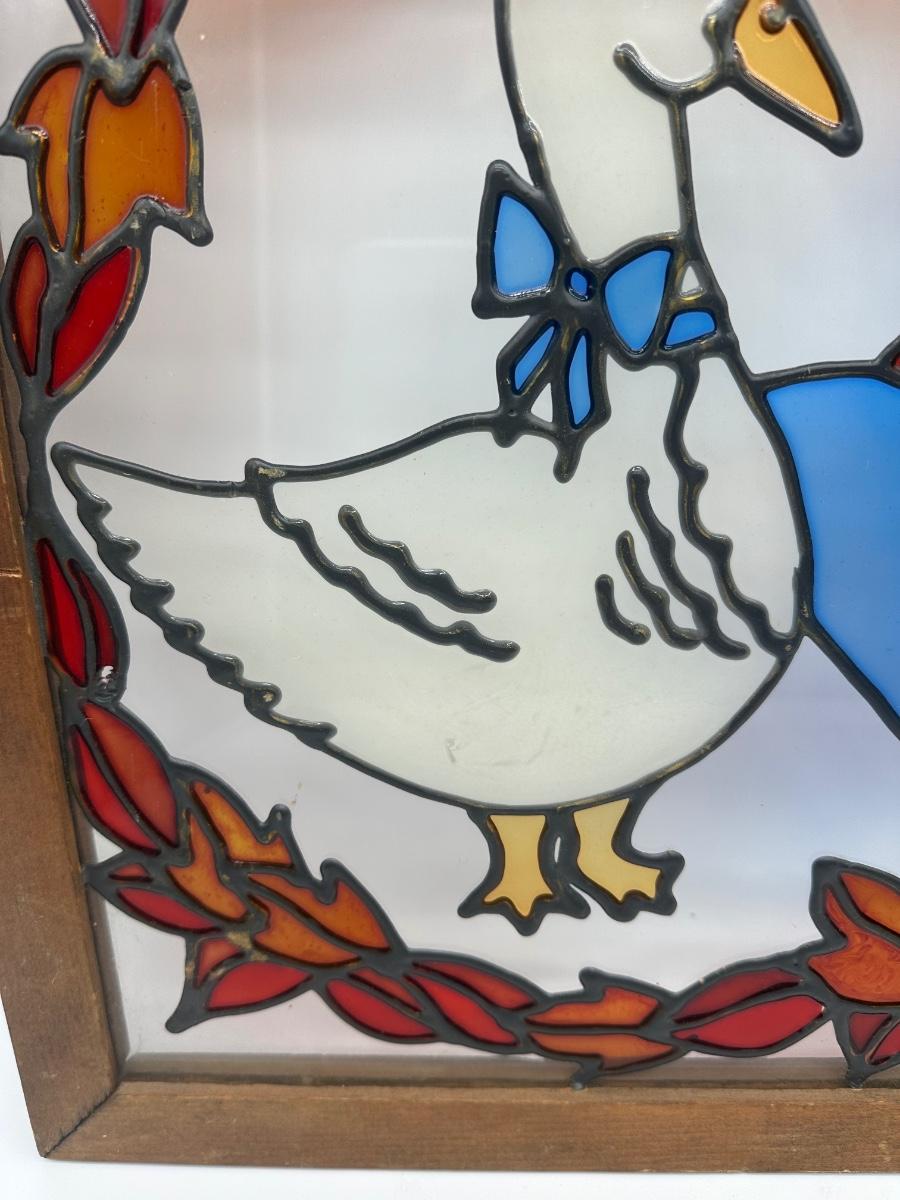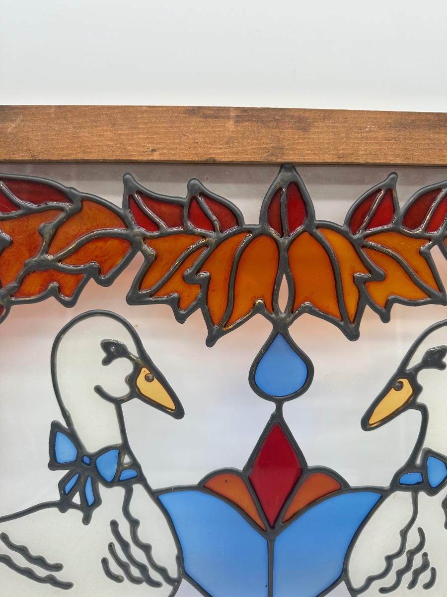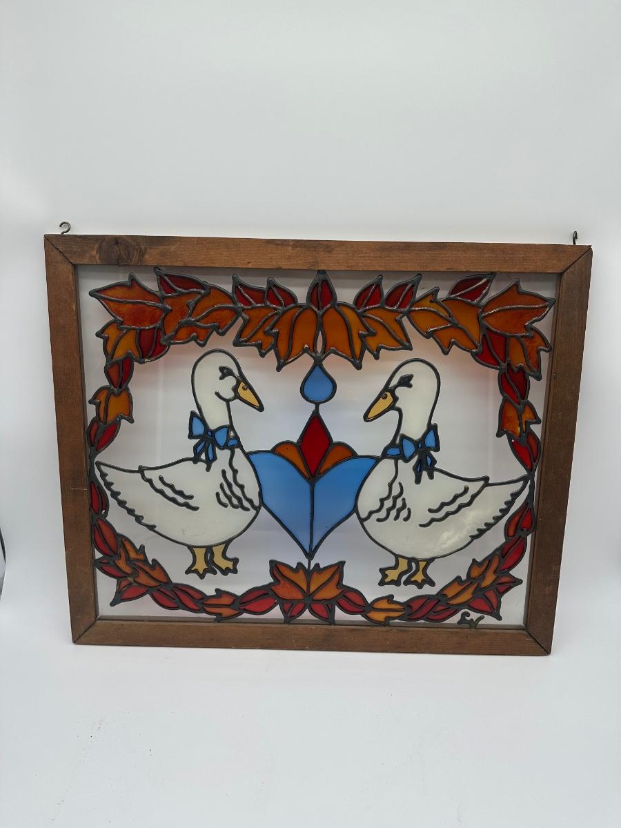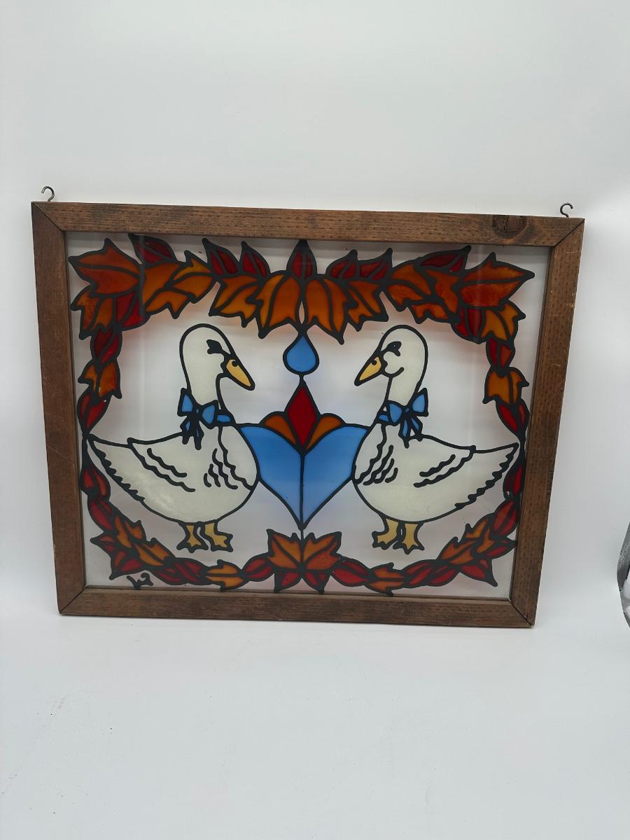 Decorative stained glass panel featuring a pair of geese with floral border. Wood framed and ready to hang.