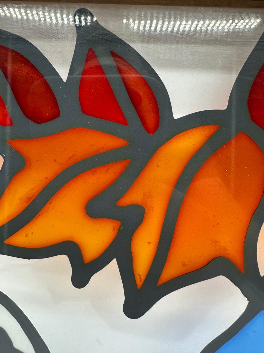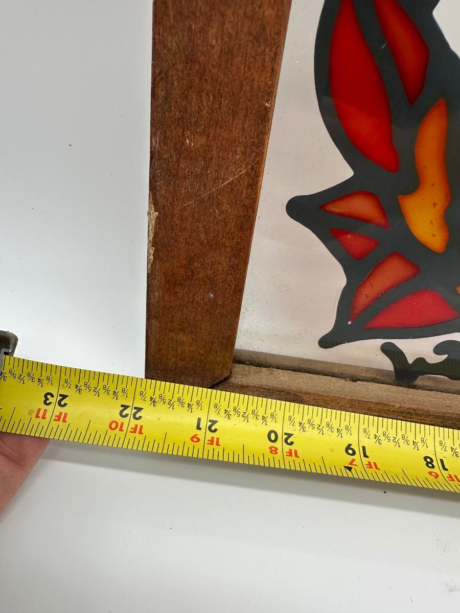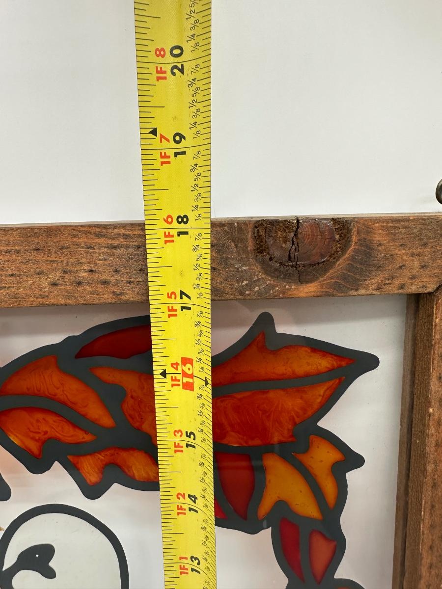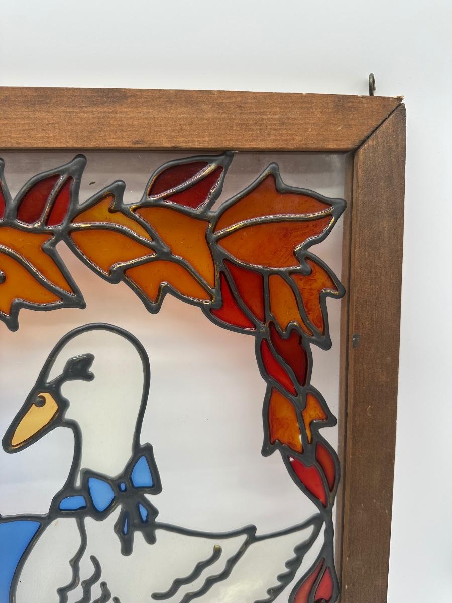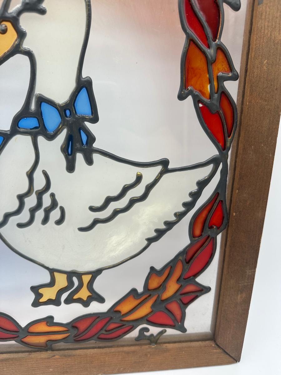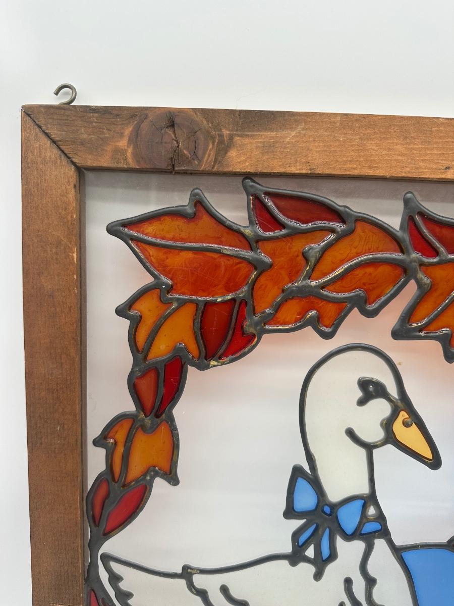 Decorative stained glass panel featuring a pair of geese with floral border. Wood framed and ready to hang.