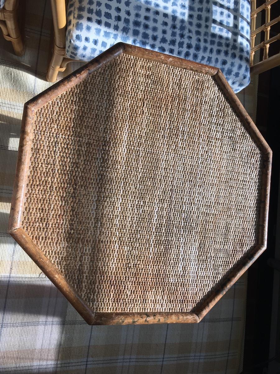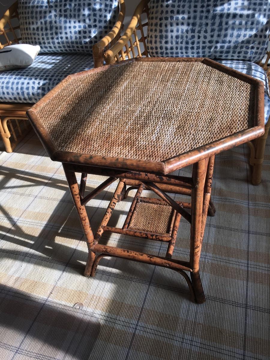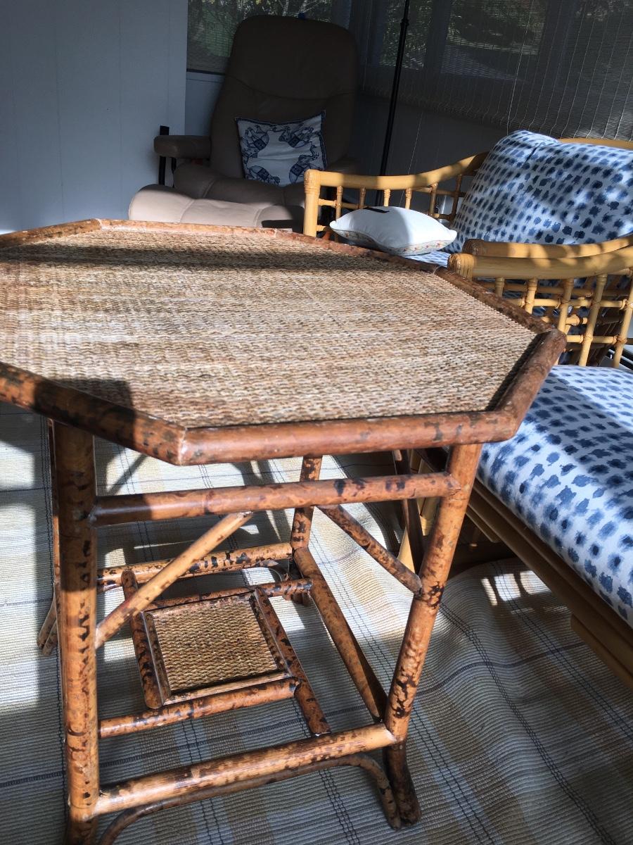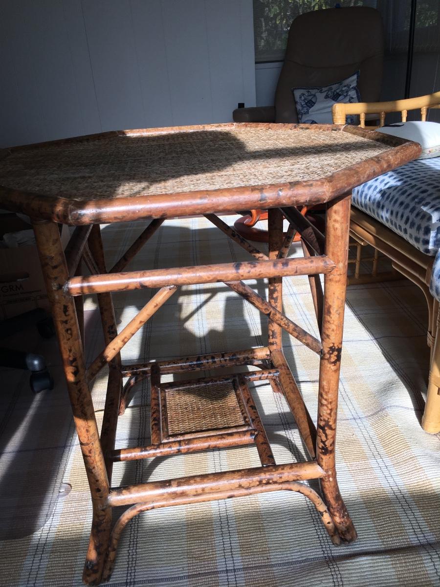 Reed finish top with faux burnt tortoise sheel accent bamboo make for a lovely 2 tiered side table. Excellent condition.