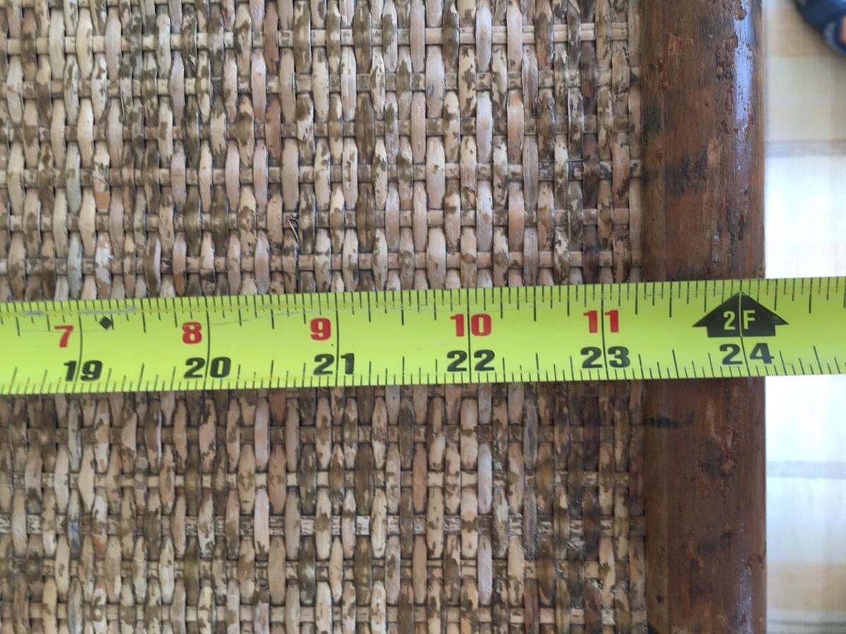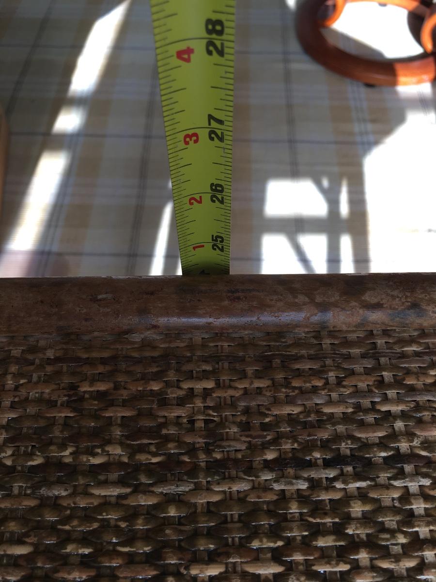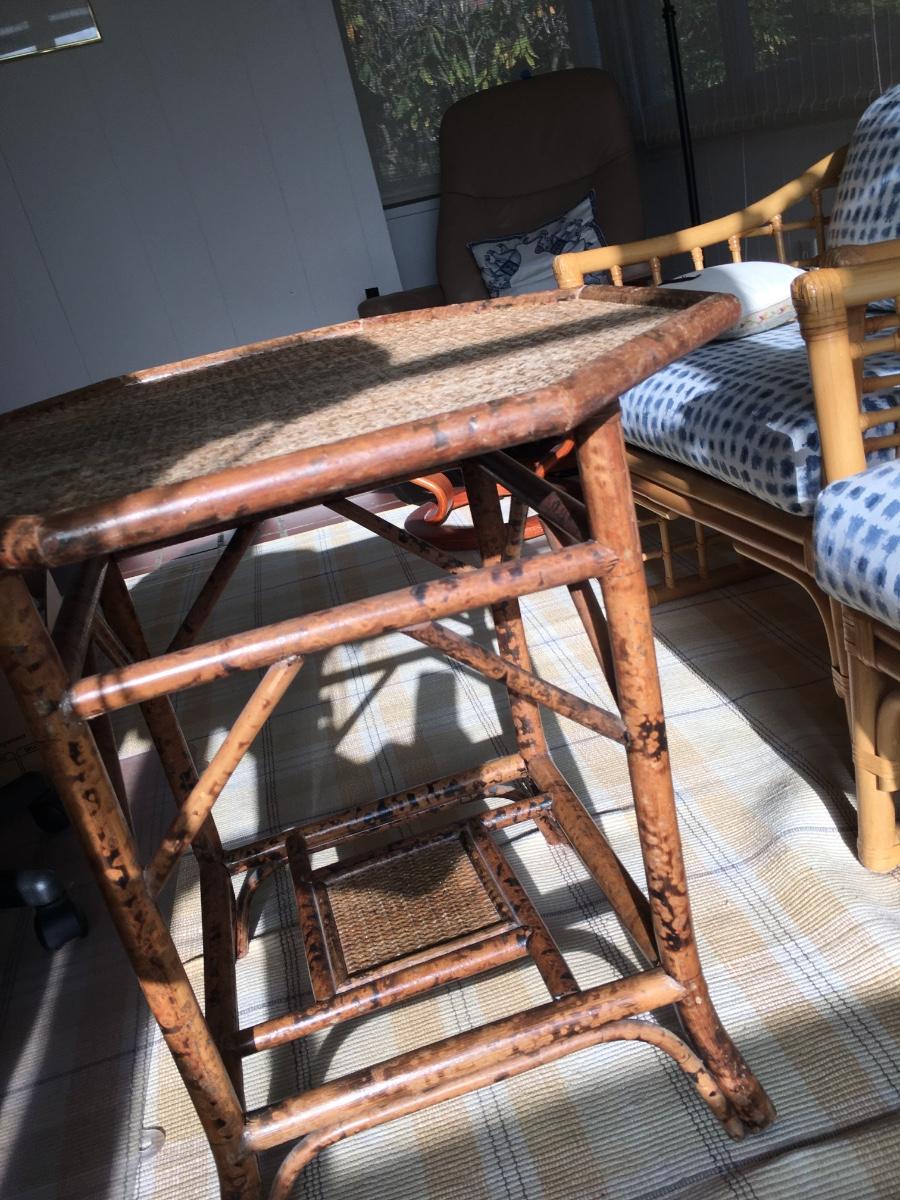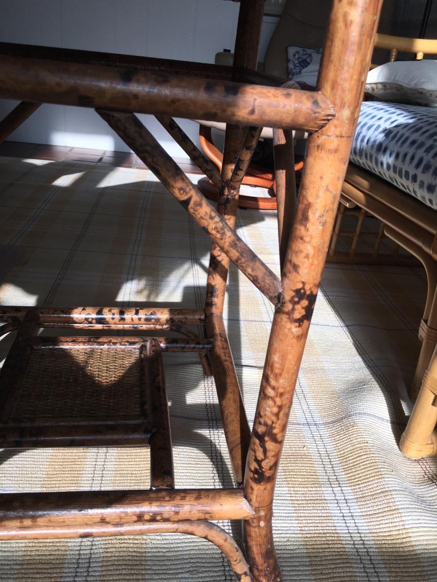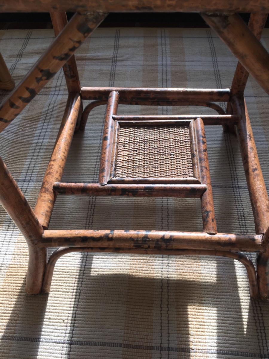 Reed finish top with faux burnt tortoise sheel accent bamboo make for a lovely 2 tiered side table. Excellent condition.