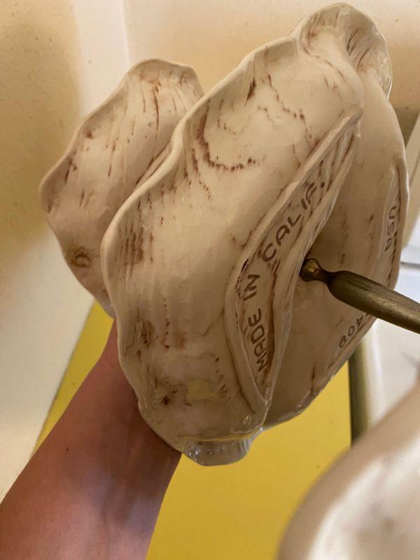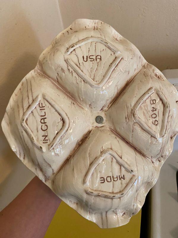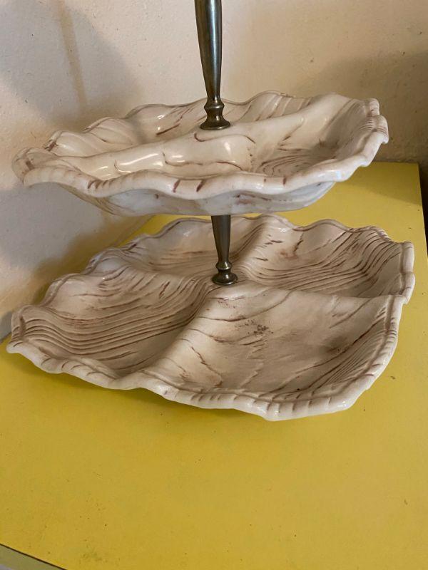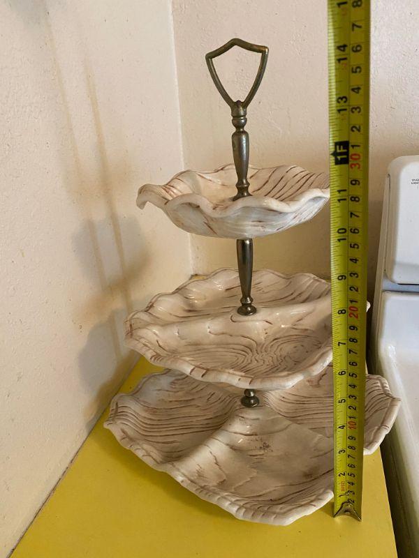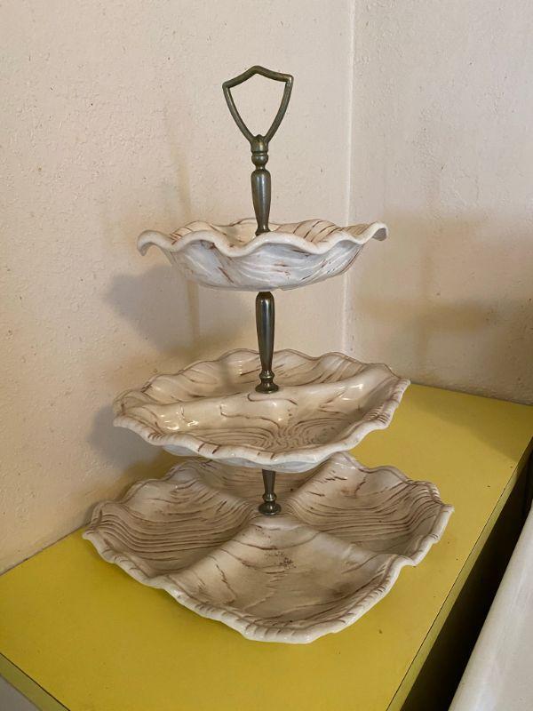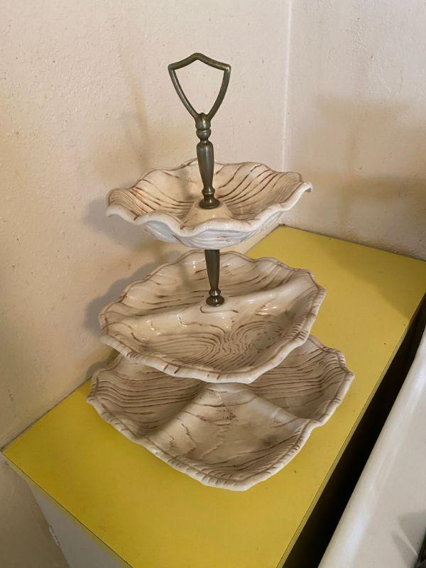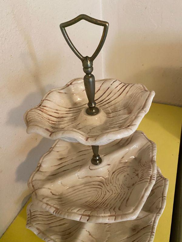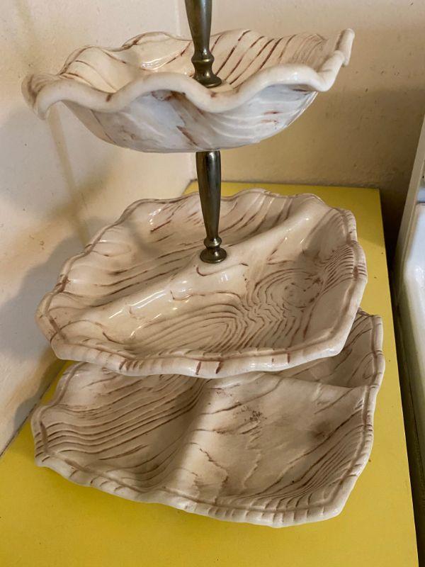 Vintage California pottery triple dish stand. Great for desserts, candy, nuts. All pieces are marked. No chips or damage. White with brown faux wood grain detail. Metal stand pieces have dulled a little, can be replaced, comes apart.