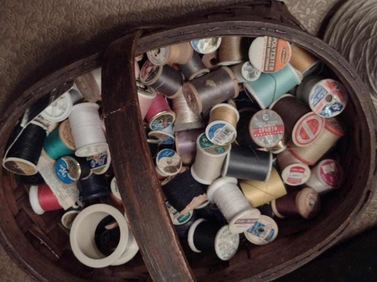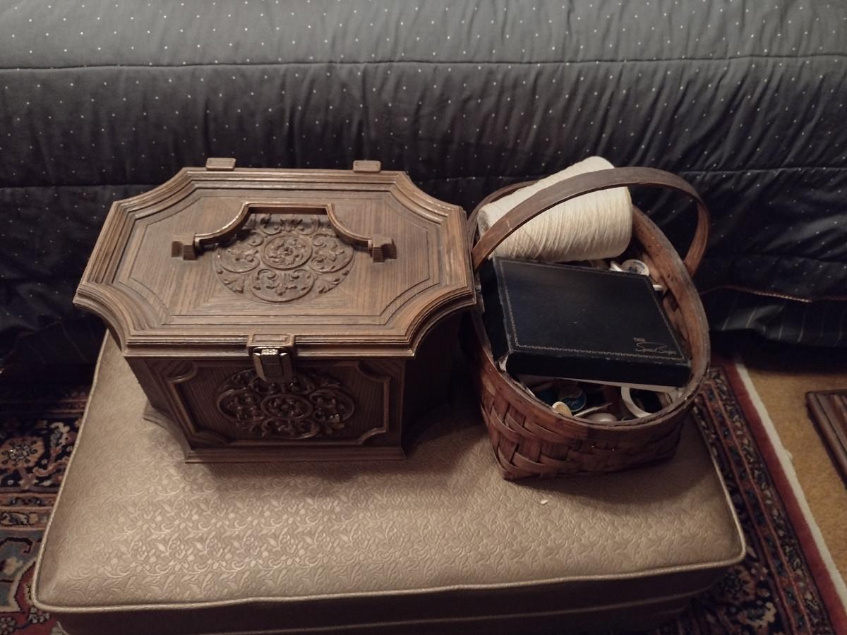 Vintage Faux Wood Plastic Sewing Box with Tray Including Supplies and Accessories. Box is Max Klein SC-2015. Nice selection of thread in basket. Please see all pictures.