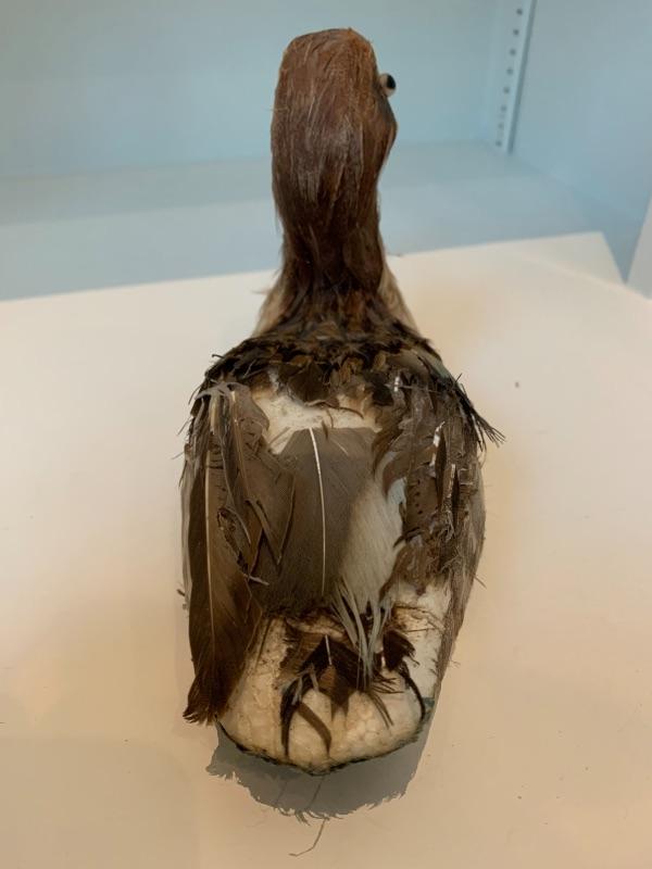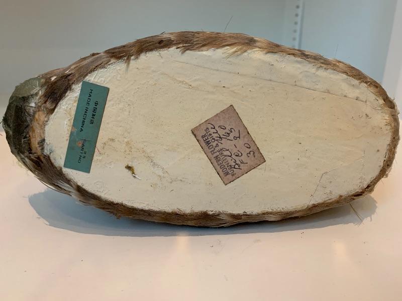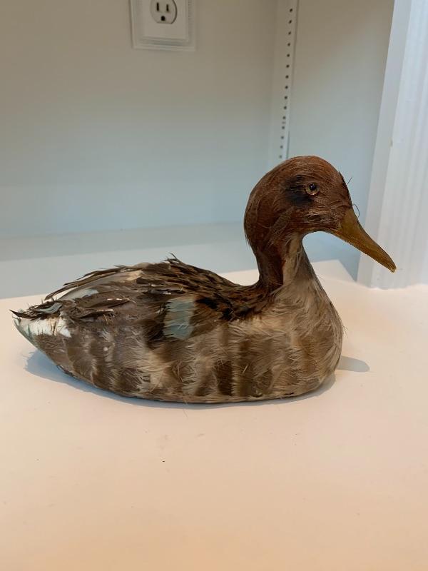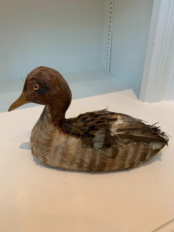 Vintage Feathered Duck, Width tip of tail to tip of beak is 8 inches and Height at top of head is 7 inches. Few missing feathers noted at “tail end” as noted in photo # 2. Still nice looking!!