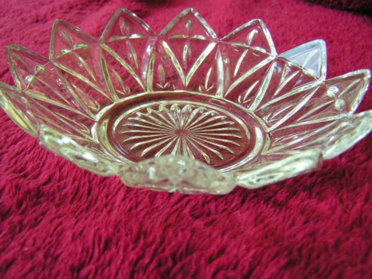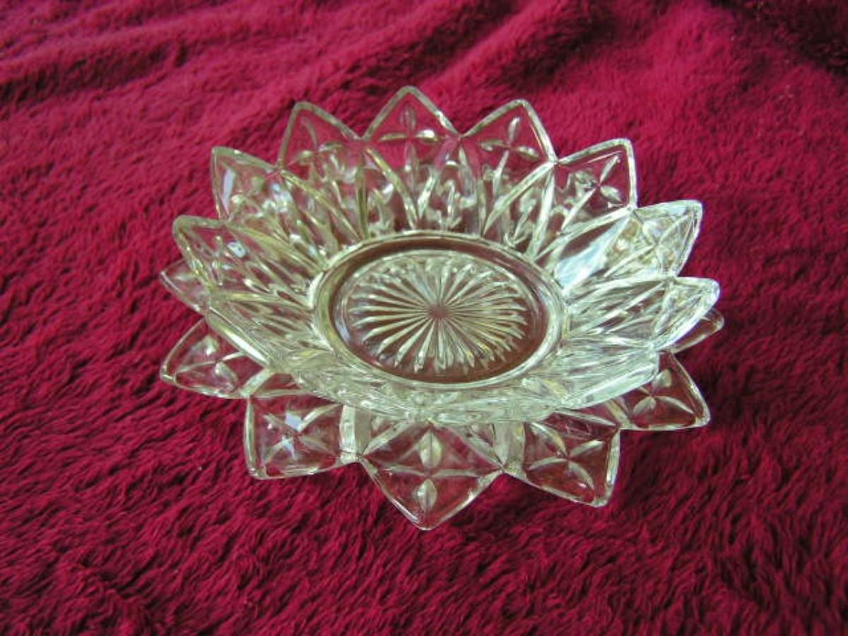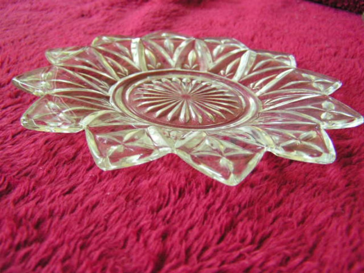 Vintage Federal Glass Co. pressed crystal small plate and dish c.1960s. Dish is about 6" point to point and plate is about 6-1/2" point to point. Dish has tiny chip barely discernible on one point.