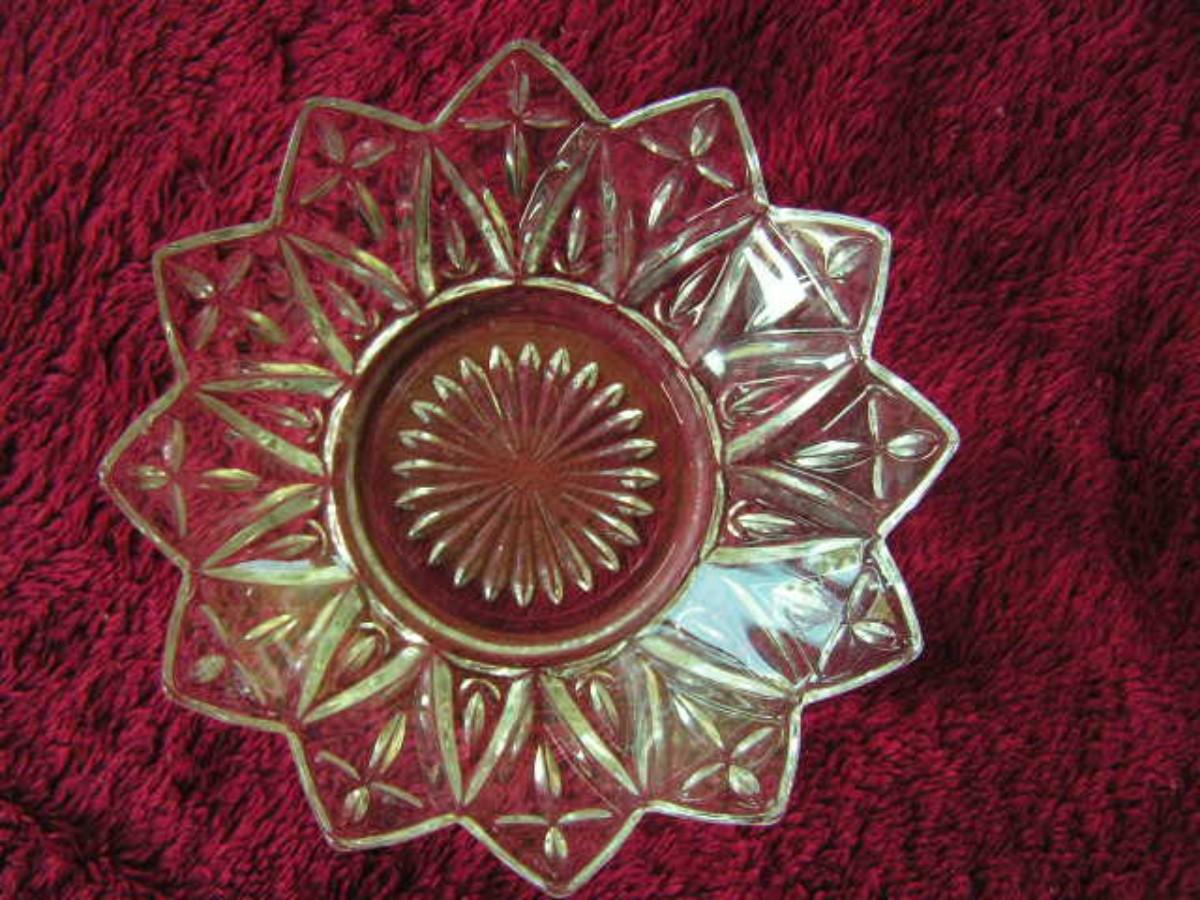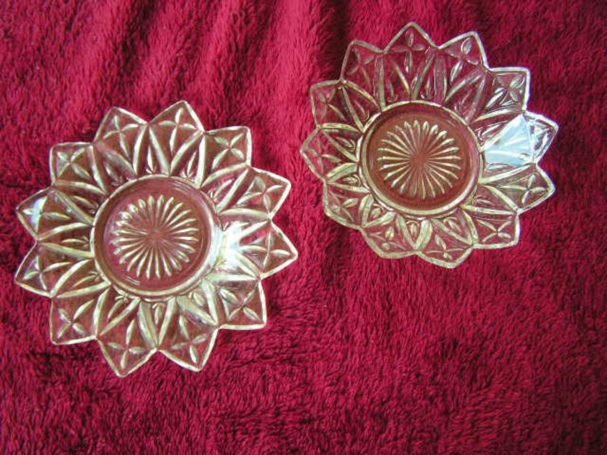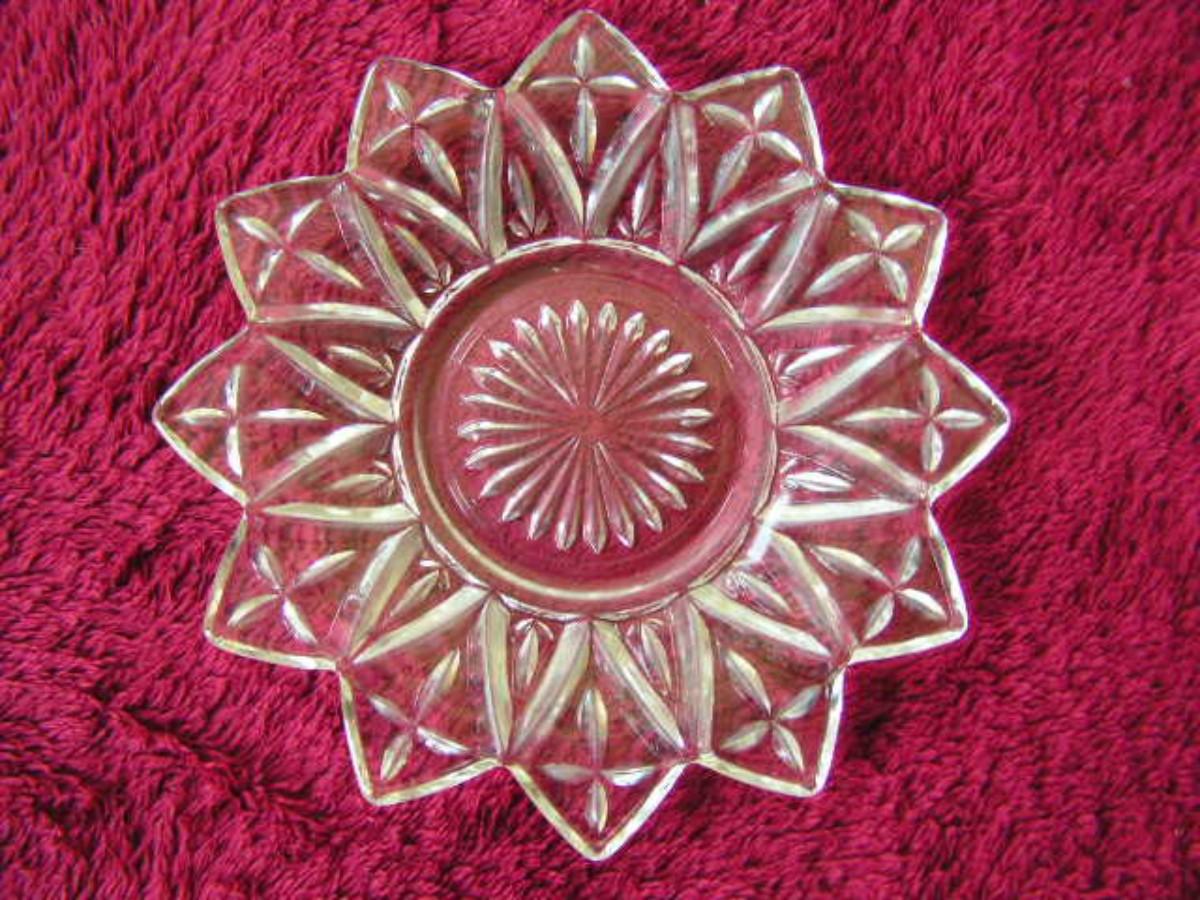 Vintage Federal Glass Co. pressed crystal small plate and dish c.1960s. Dish is about 6" point to point and plate is about 6-1/2" point to point. Good to Fair condition.