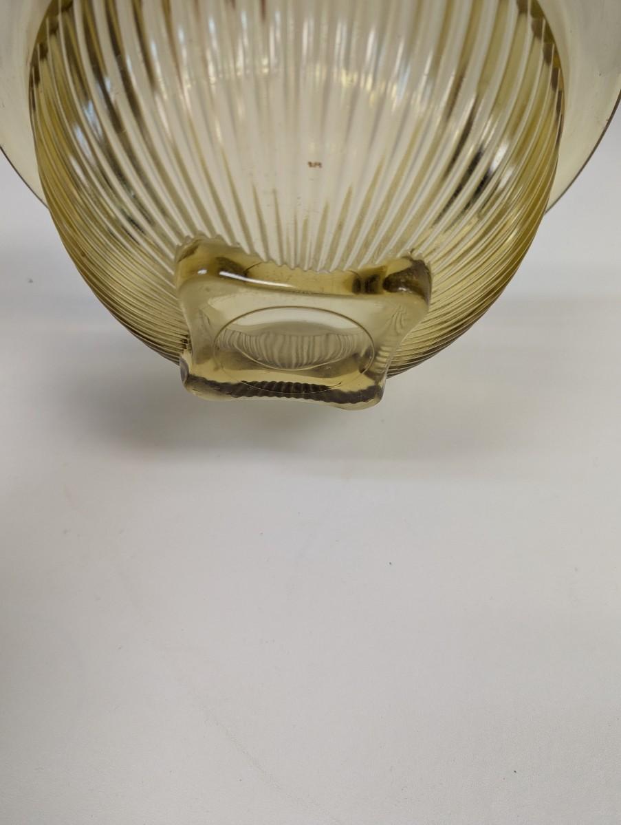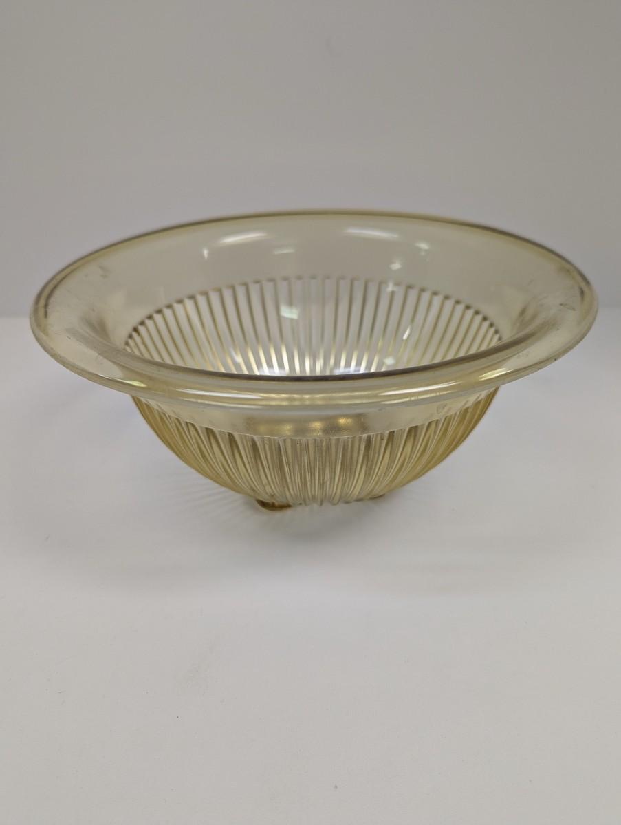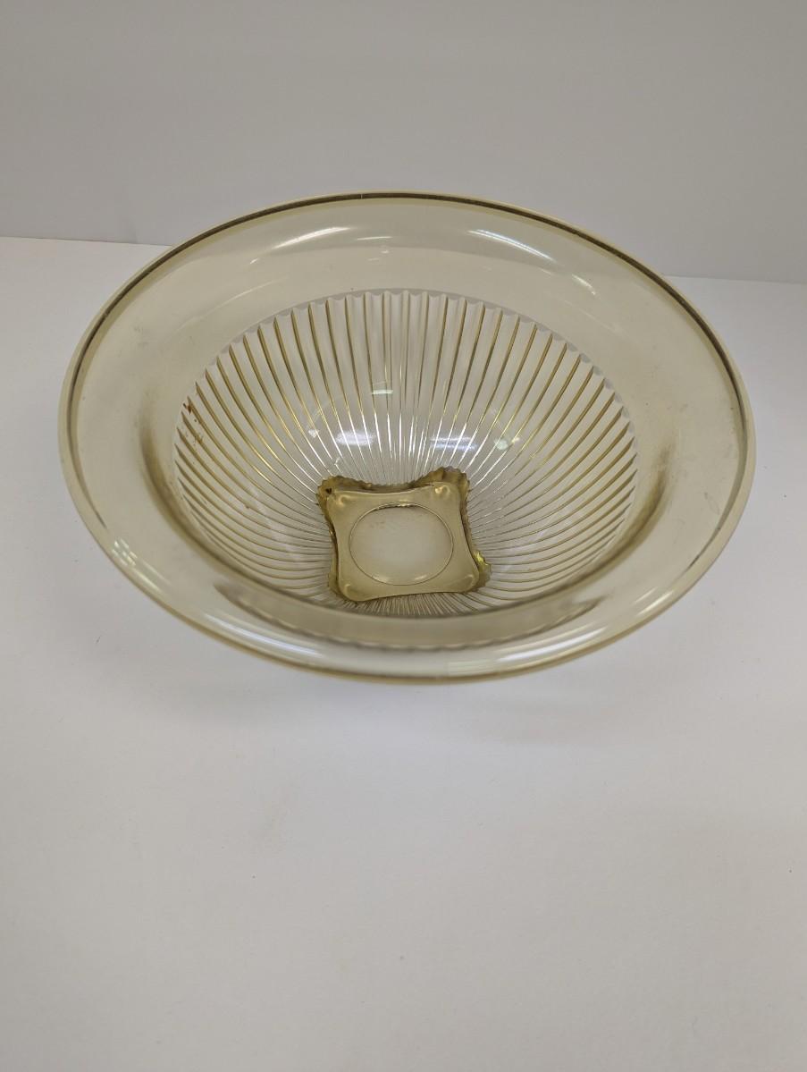 This vintage Federal Glass bowl is a stunning addition to any kitchen. The beautiful amber yellow color and ribbed design offer a classic look that is sure to impress. This depression glass piece from the \"Golden Glow\" collection measures 9 3/4 inches and is perfect for mixing or serving. The mirrored features reflect light beautifully, making it a great centerpiece for any table. Made from high-quality glass by Federal, an antique original manufacturer, this bowl is not only beautiful but also durable. Whether you're a collector or just looking for a timeless piece, this bowl is the perfect choice.