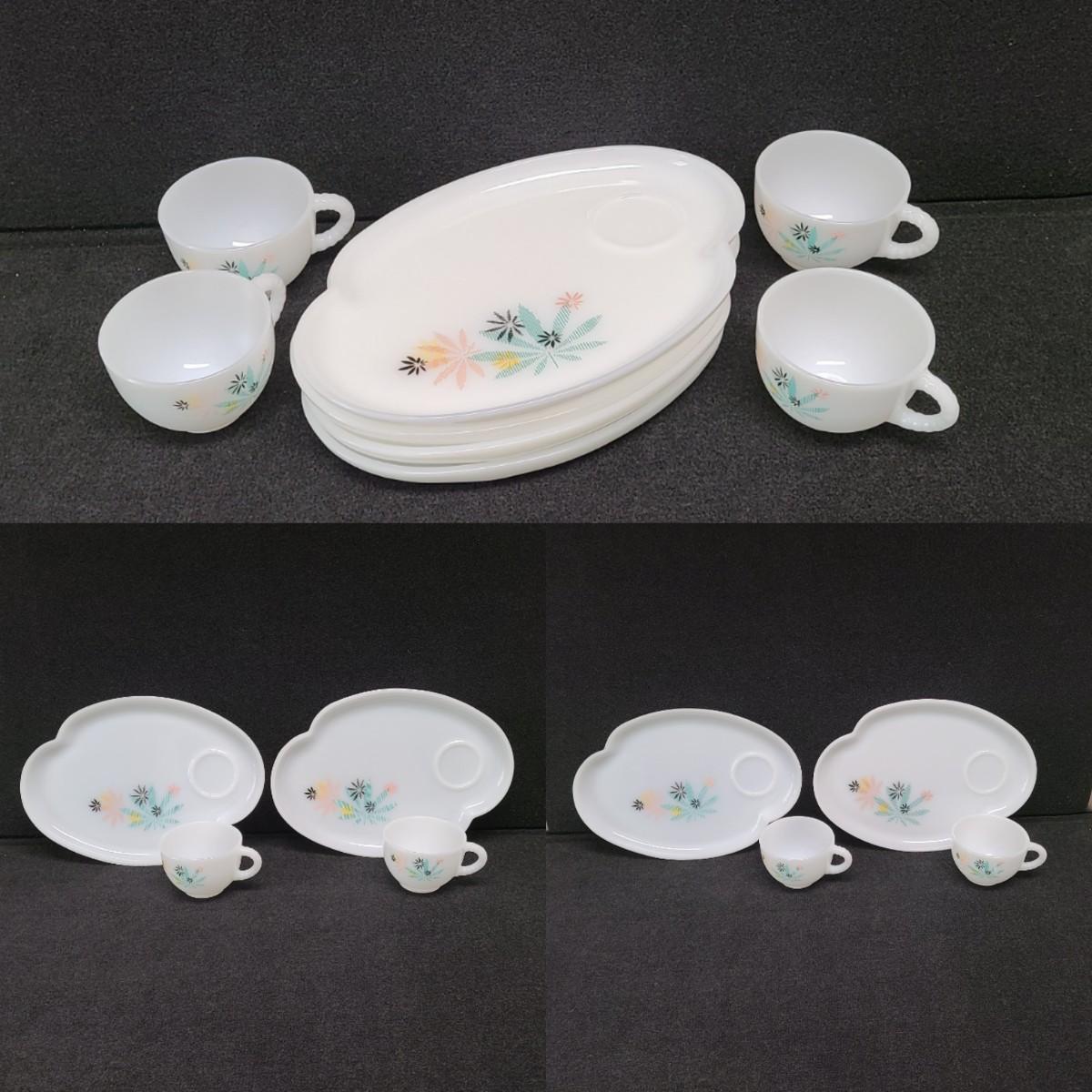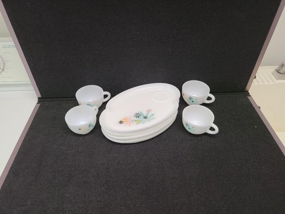 In great condition. Includes 4 Plates & 4 Matching Cups. Vintage Patio Snack Set Milk Glass Atomic Flower Box Federal Mid Century Modern. No box.