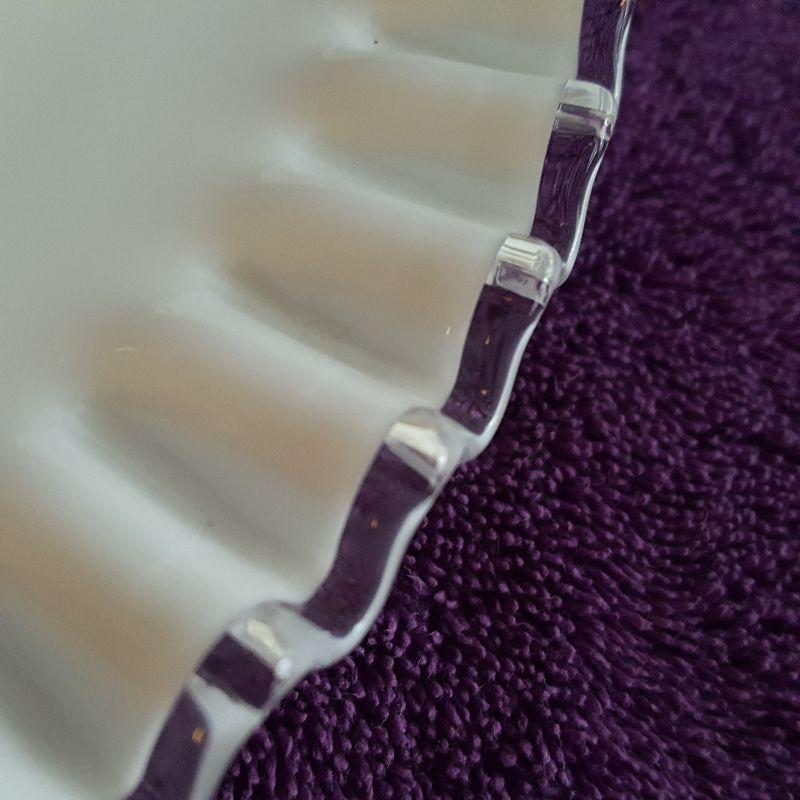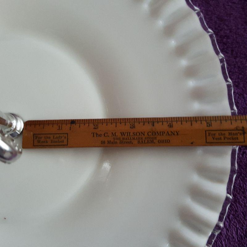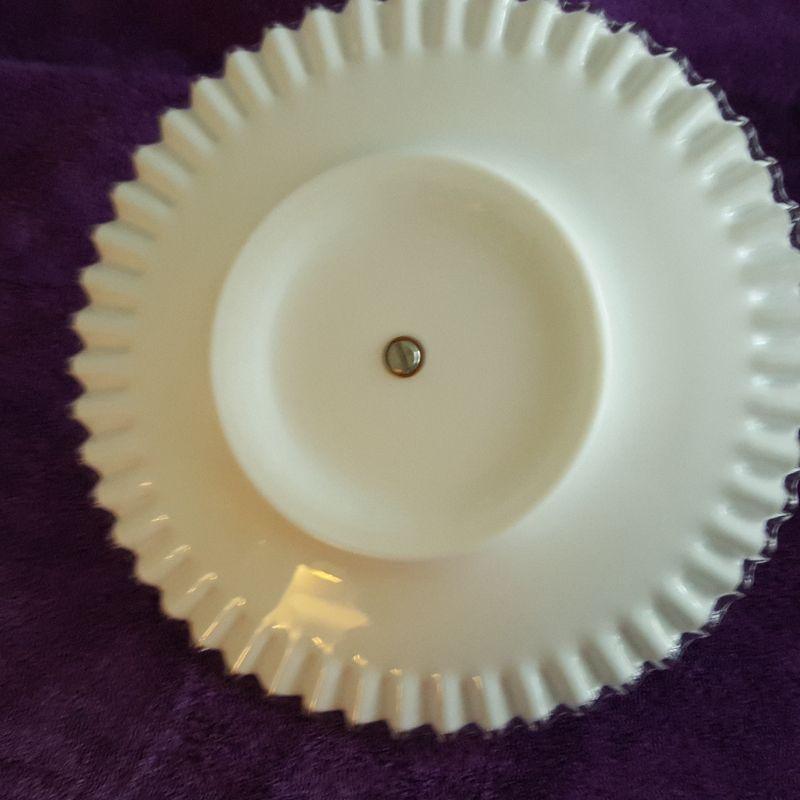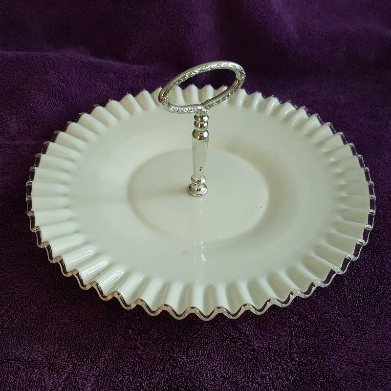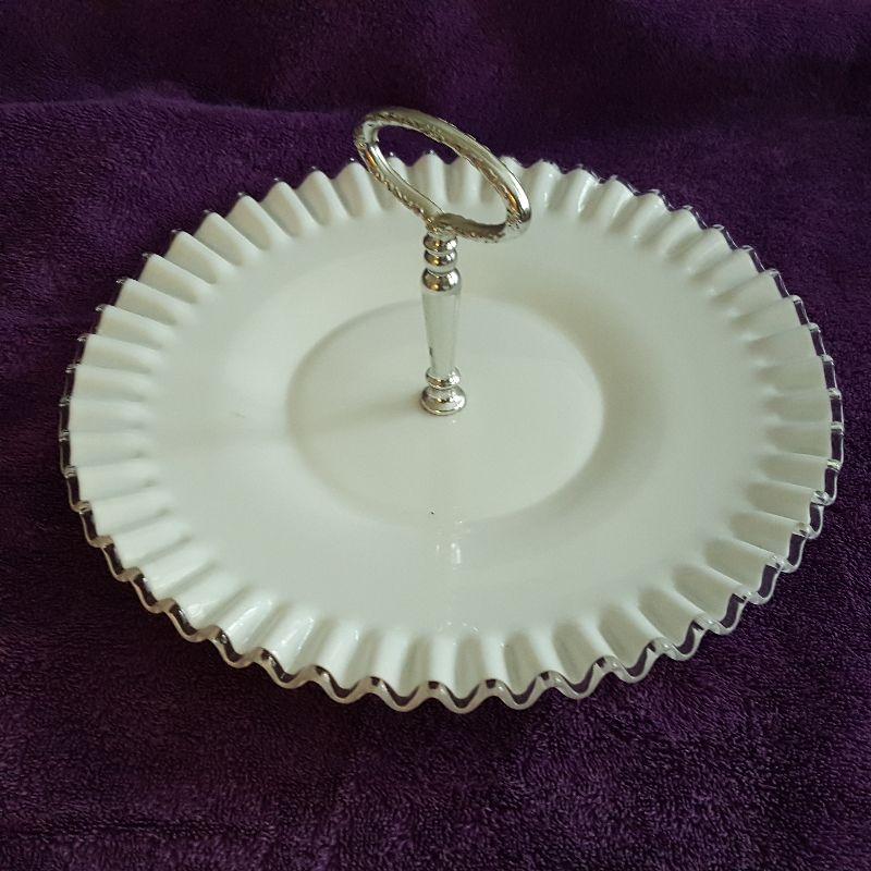 This auction lot is for a Fenton Glass Fluted Dessert Server. This server with silver-toned handle measures about 12-inches in diameter. It is a beautiful and clean opaque white with clear edge flute. Vintage Fenton Glass was made in West Virginia. This server is ready for high tea display or the passing of cookies whenever.