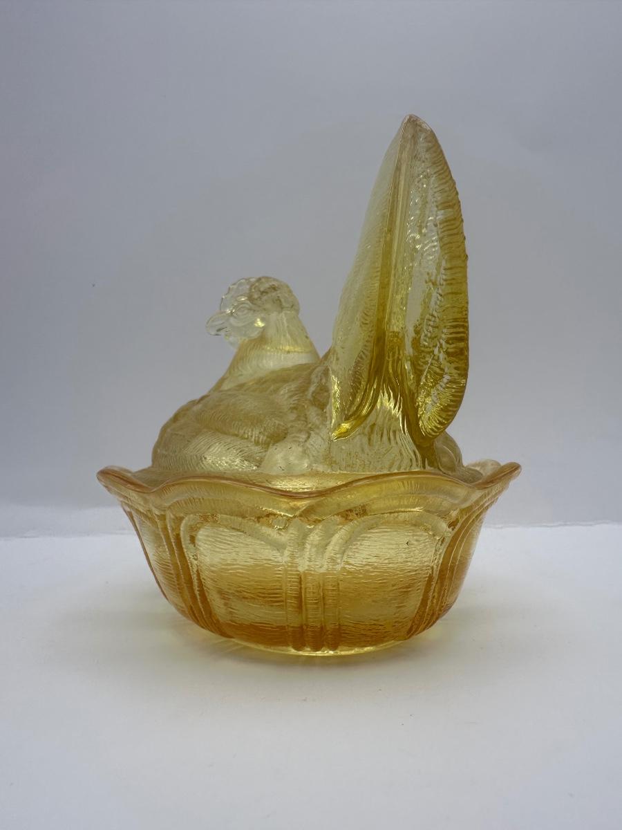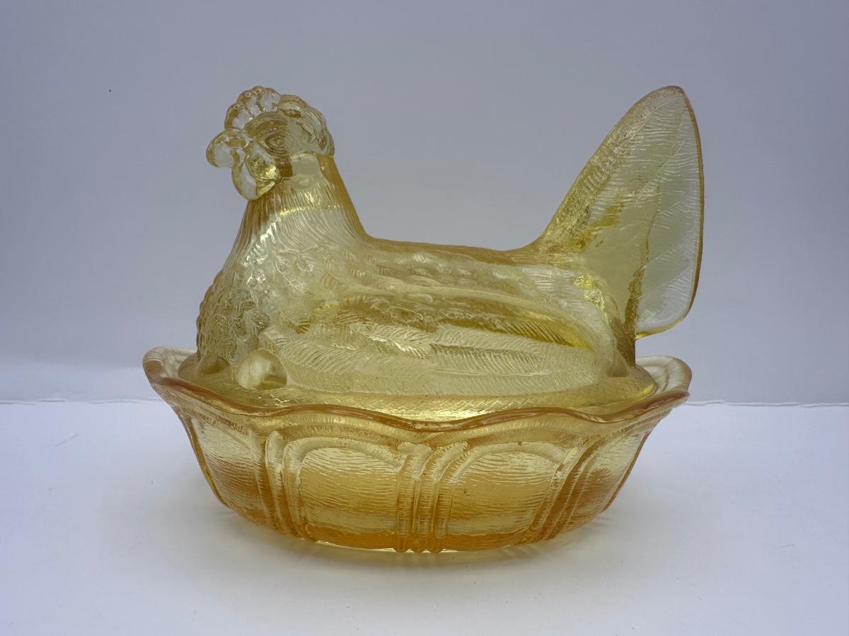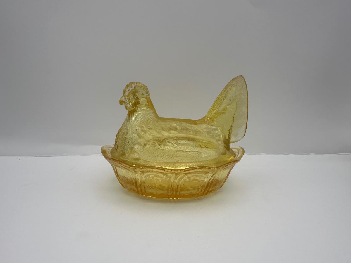 Vintage Fenton pressed glass hen on nest covered dish in yellow. Base marked “Fenton 8.” No cracks observed.