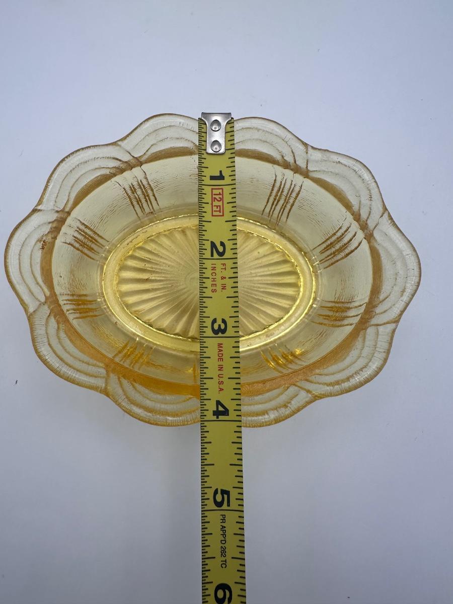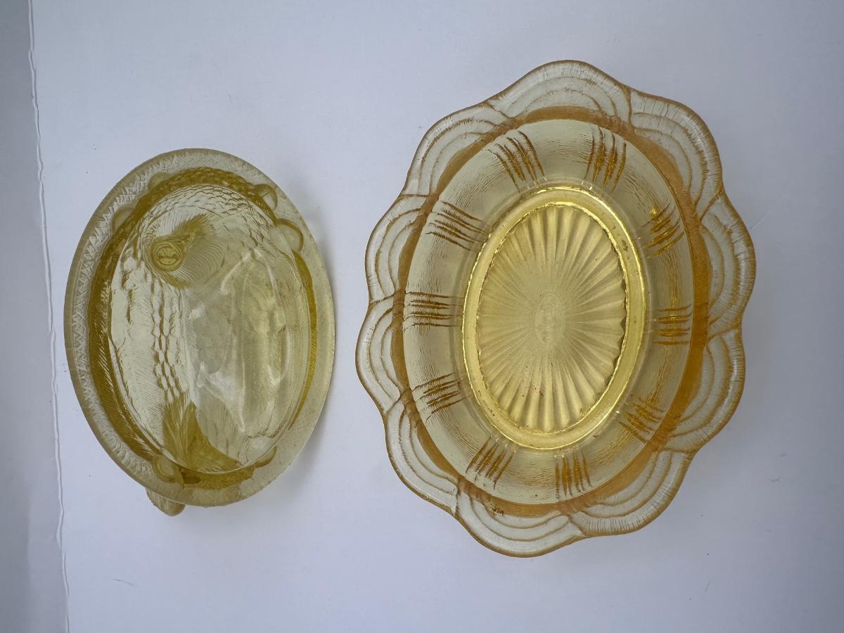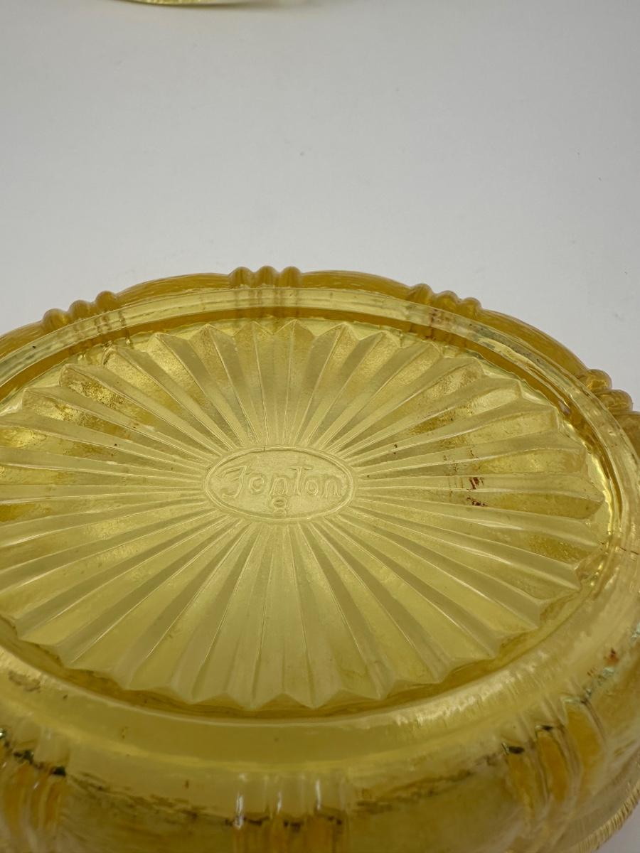 Vintage Fenton pressed glass hen on nest covered dish in yellow. Base marked “Fenton 8.” No cracks observed.