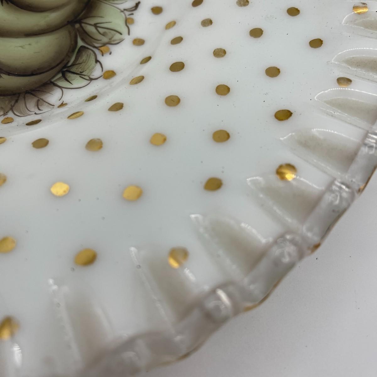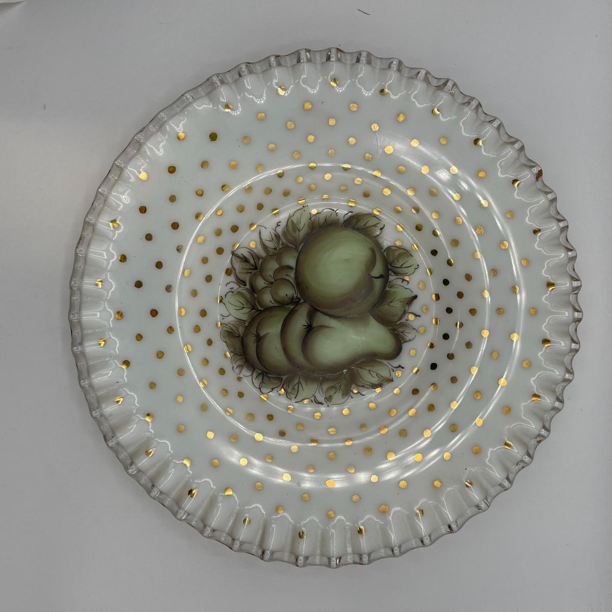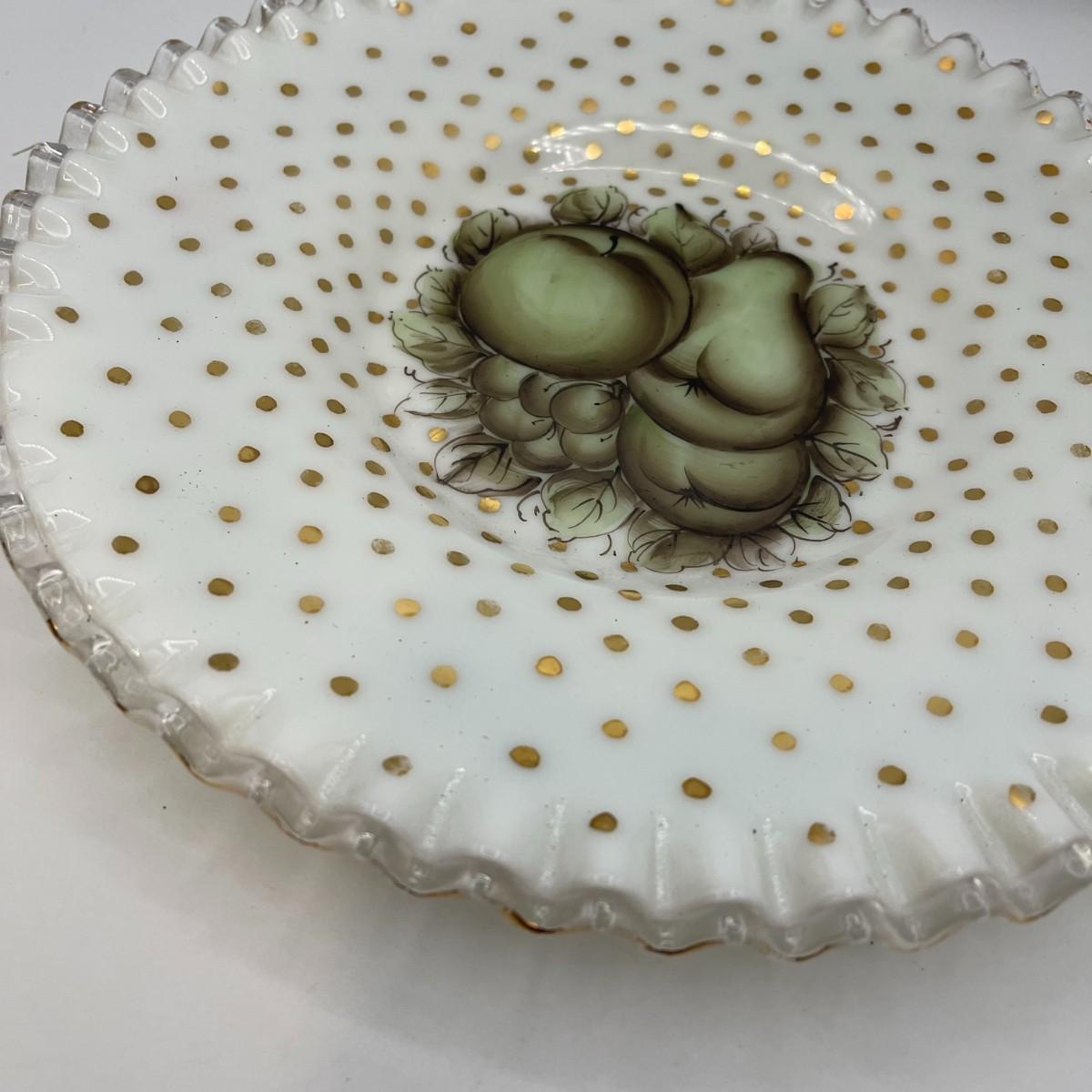 Vintage Fenton Glass Platter with Ribbon Edge, Gold Dots, & Hand Painted Pears