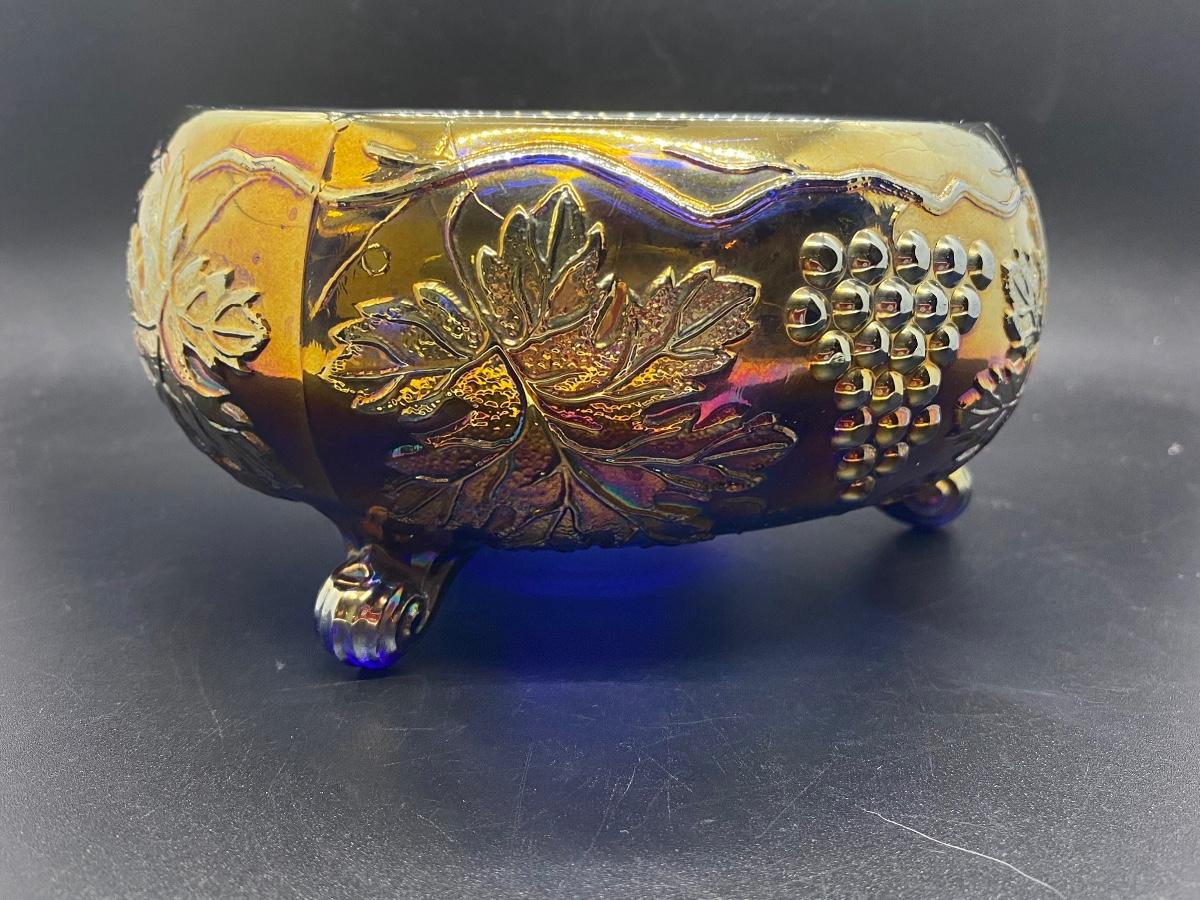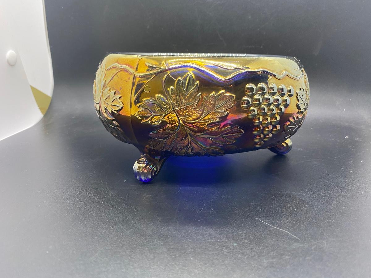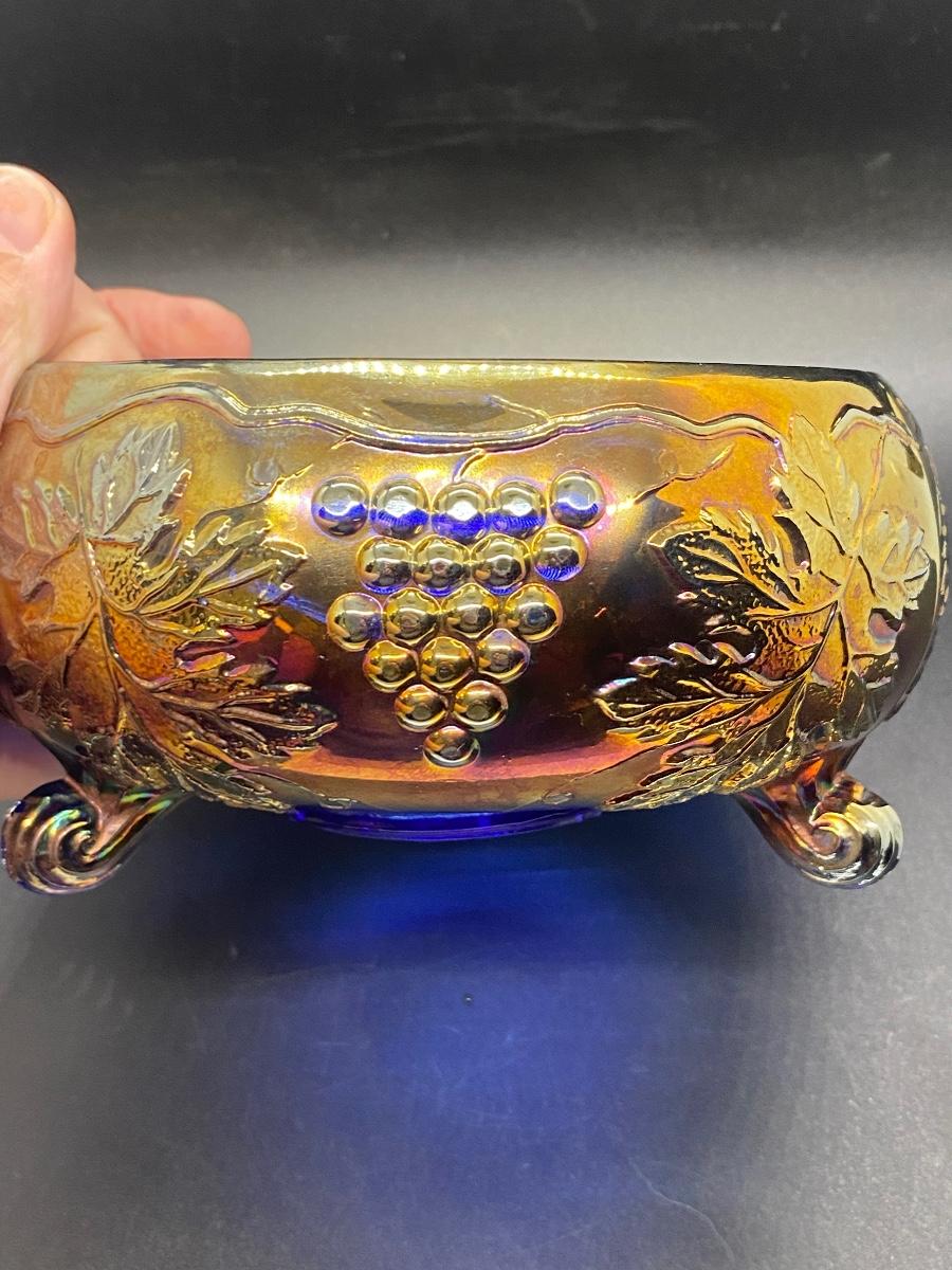 Vintage Fenton carnival glass bowl. Grape and vine embossed pattern. Cobalt blue glass with a golden iridescent glow. Three small feet on the bottom. In good condition, no chips. About 7" wide.