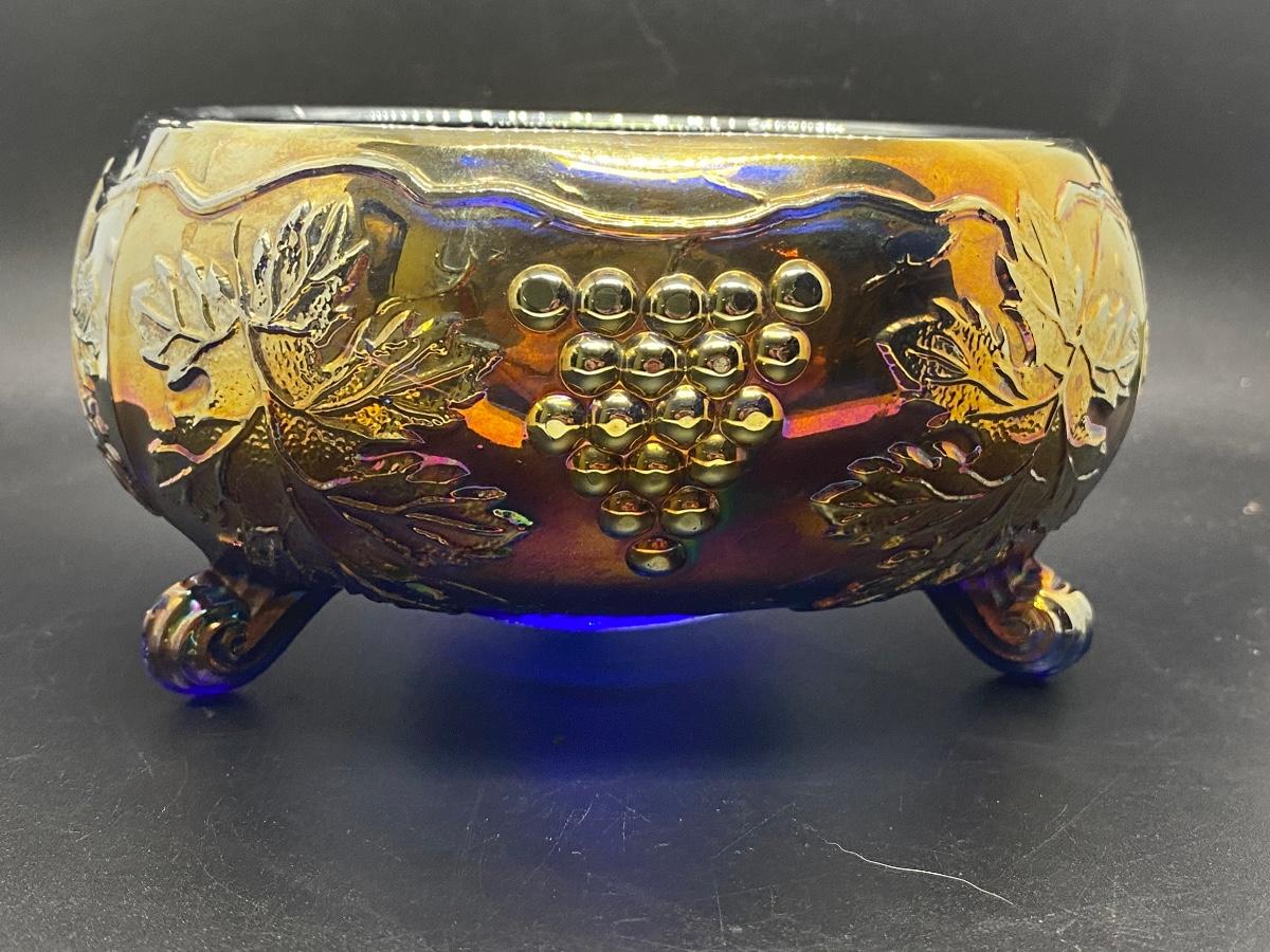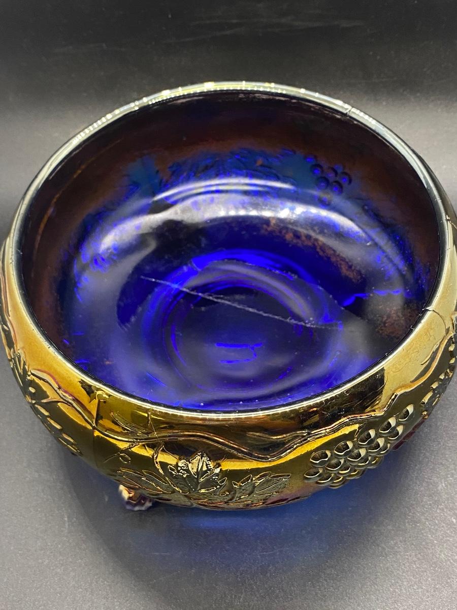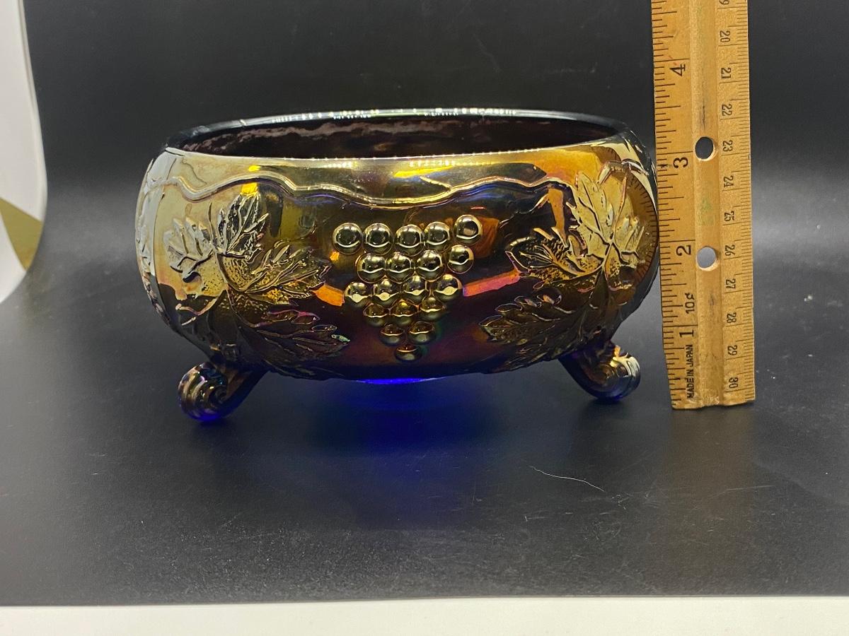 Vintage Fenton carnival glass bowl. Grape and vine embossed pattern. Cobalt blue glass with a golden iridescent glow. Three small feet on the bottom. In good condition, no chips. About 7" wide.