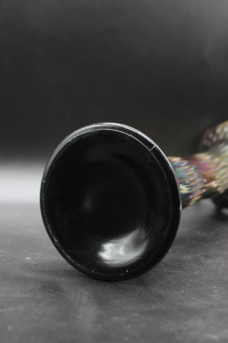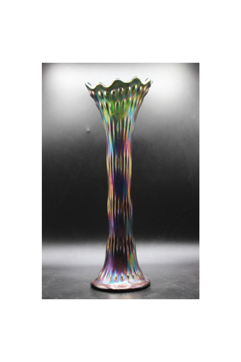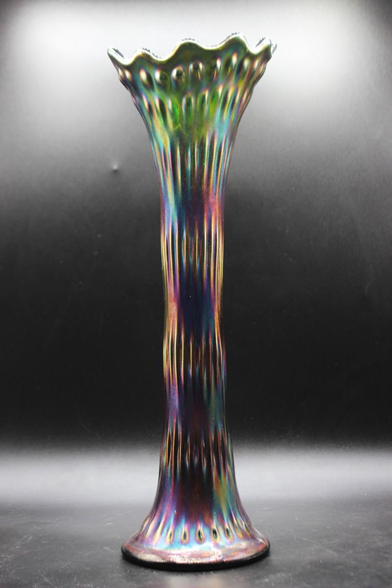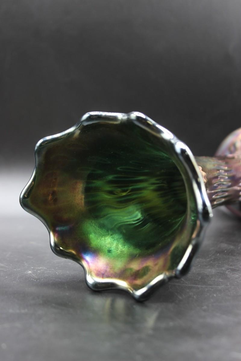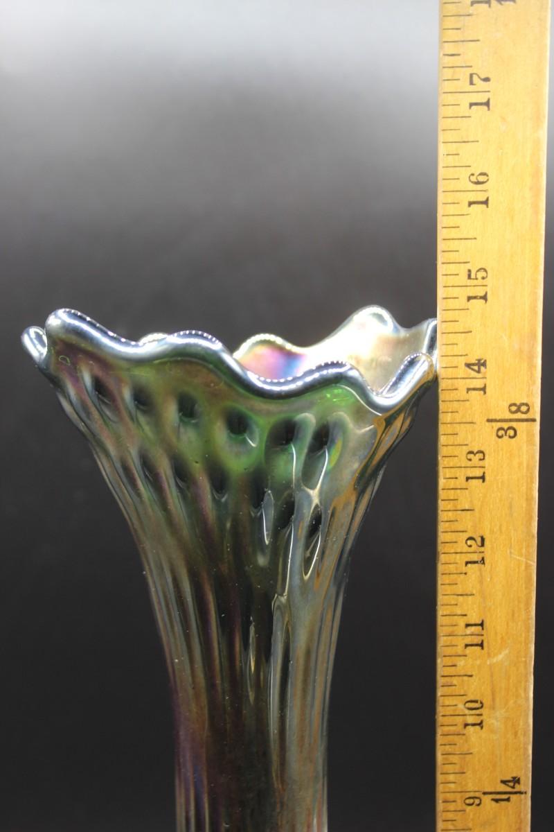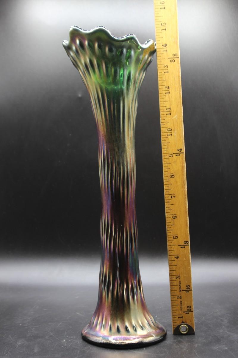 Vintage Fenton green carnival glass swung vase. 15" rustic standard vase. In good vintage condition.