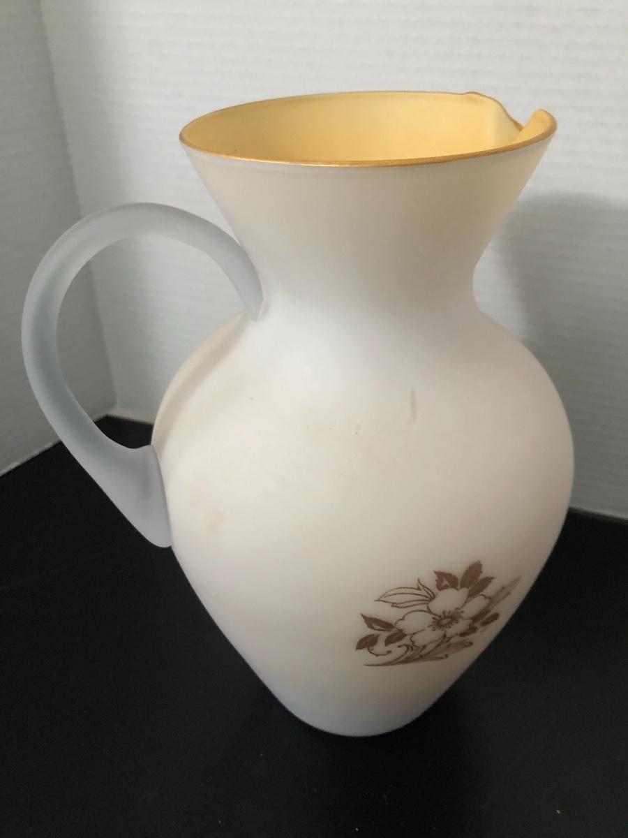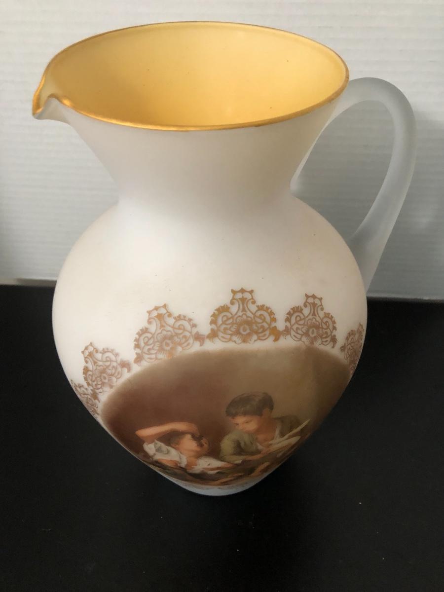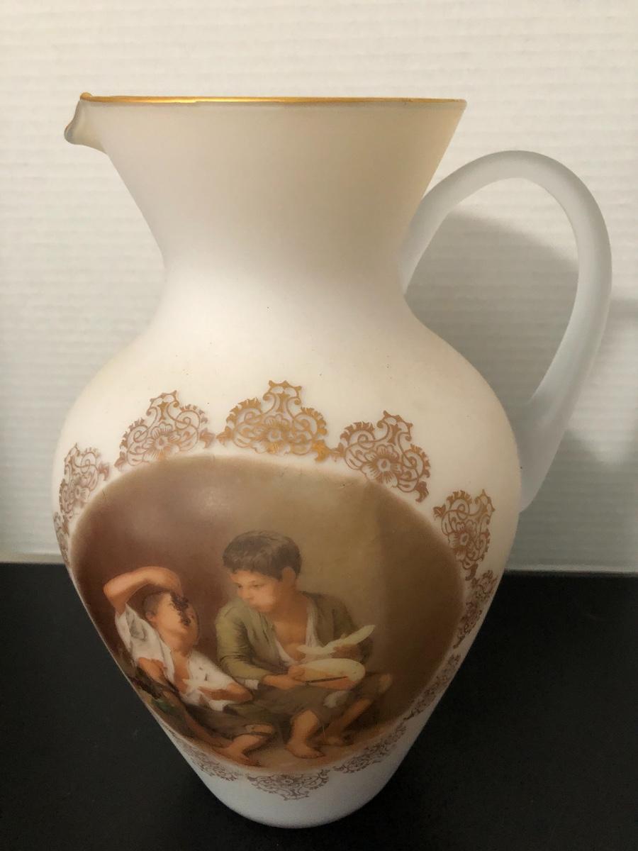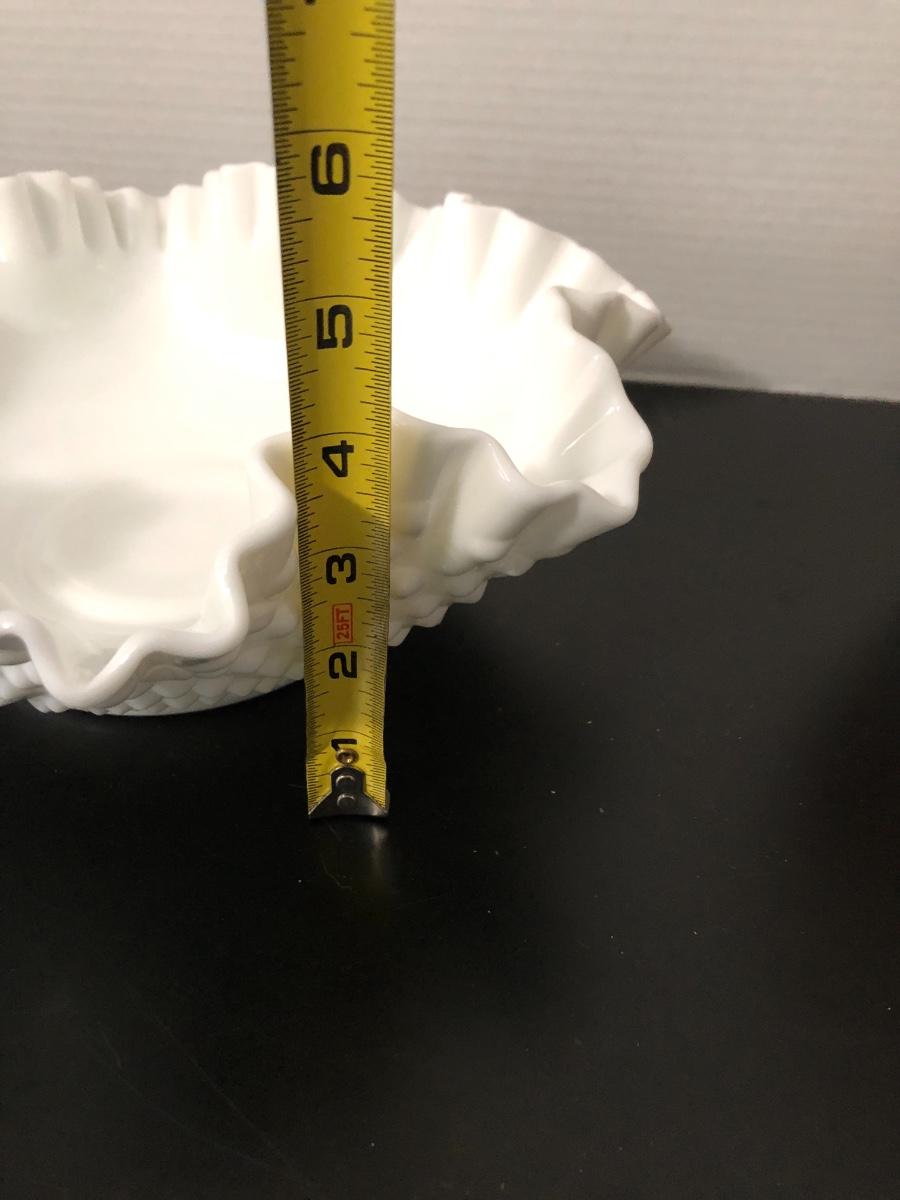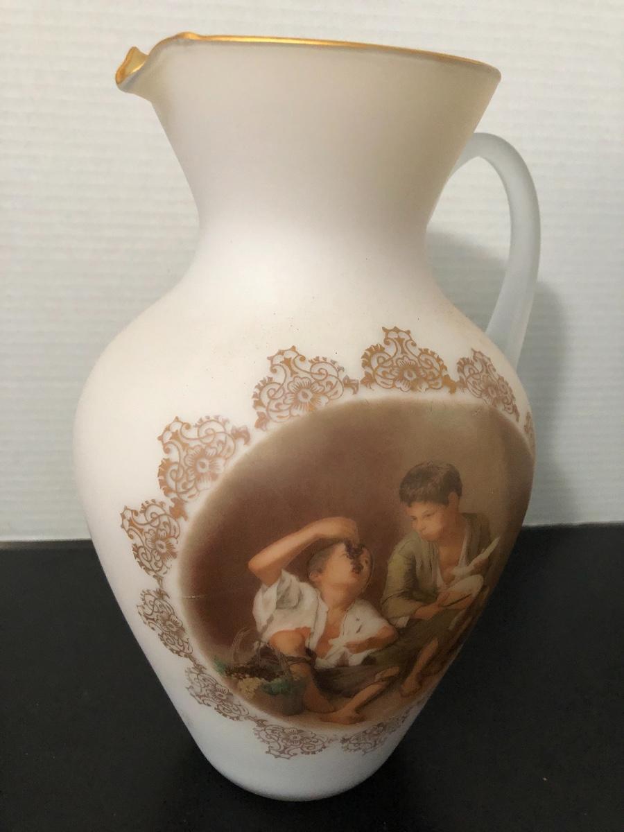 All items are sold as is, as found in the estate. Please see all photos for content, measurements and condition. Fenton vase has 8 ruffles, very clean piece. Appears to have no chips or cracks. Antique water jug needs to be washed, does have dust & dirt on it.