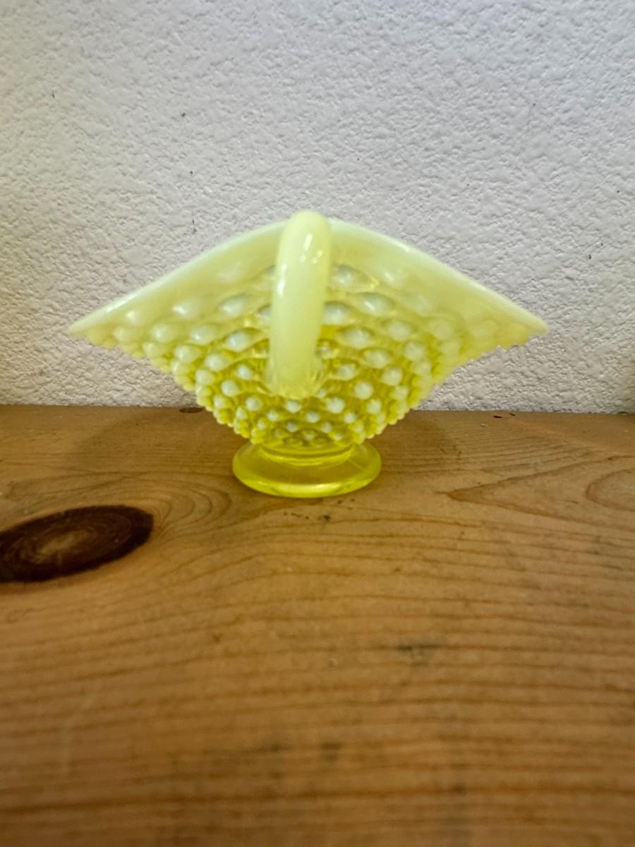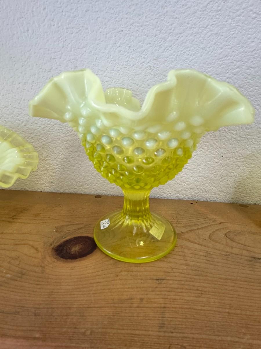 Vintage FENTON Hobnail Ruffle Topaz Vaseline Stemmed Compote dish