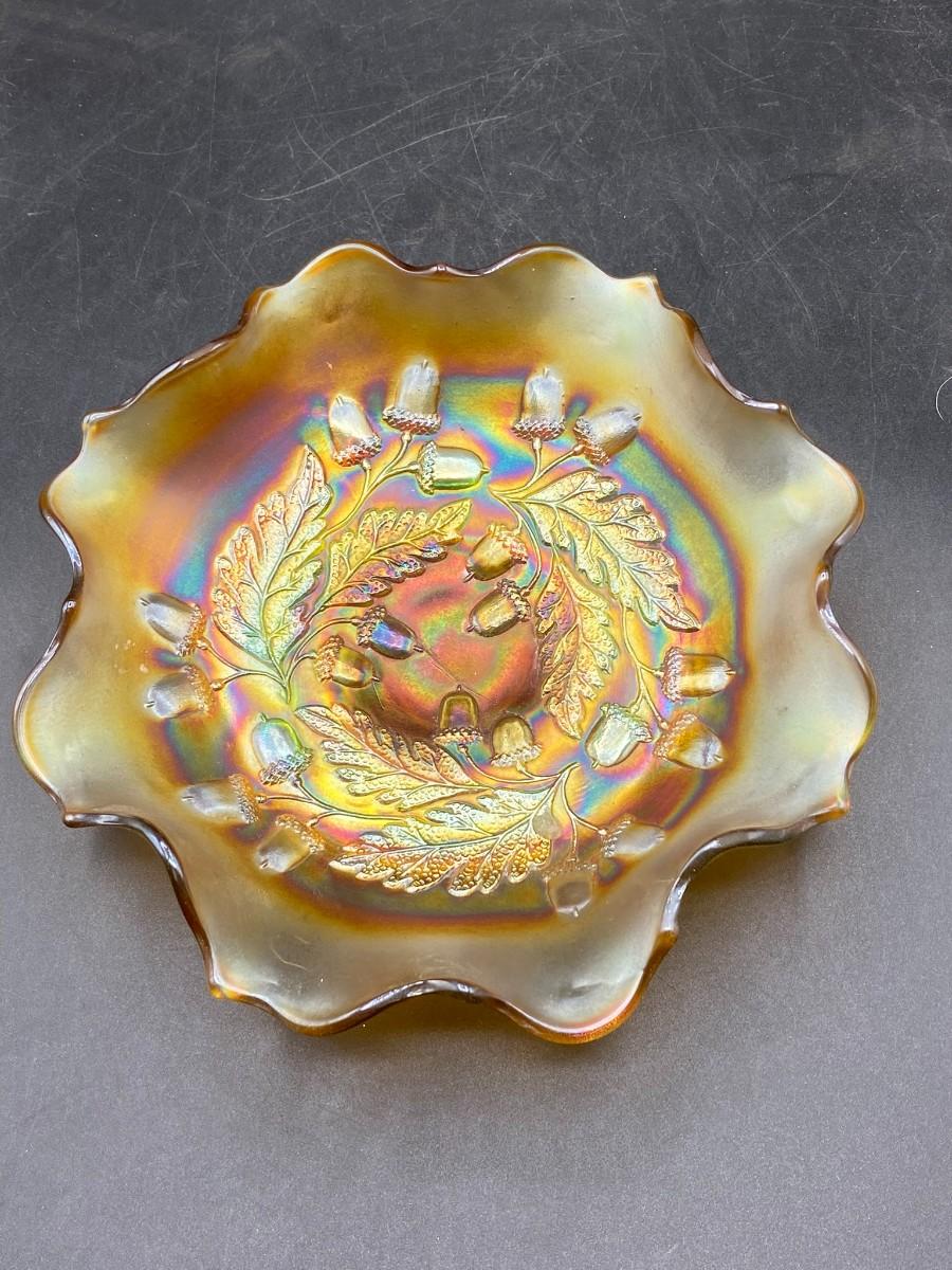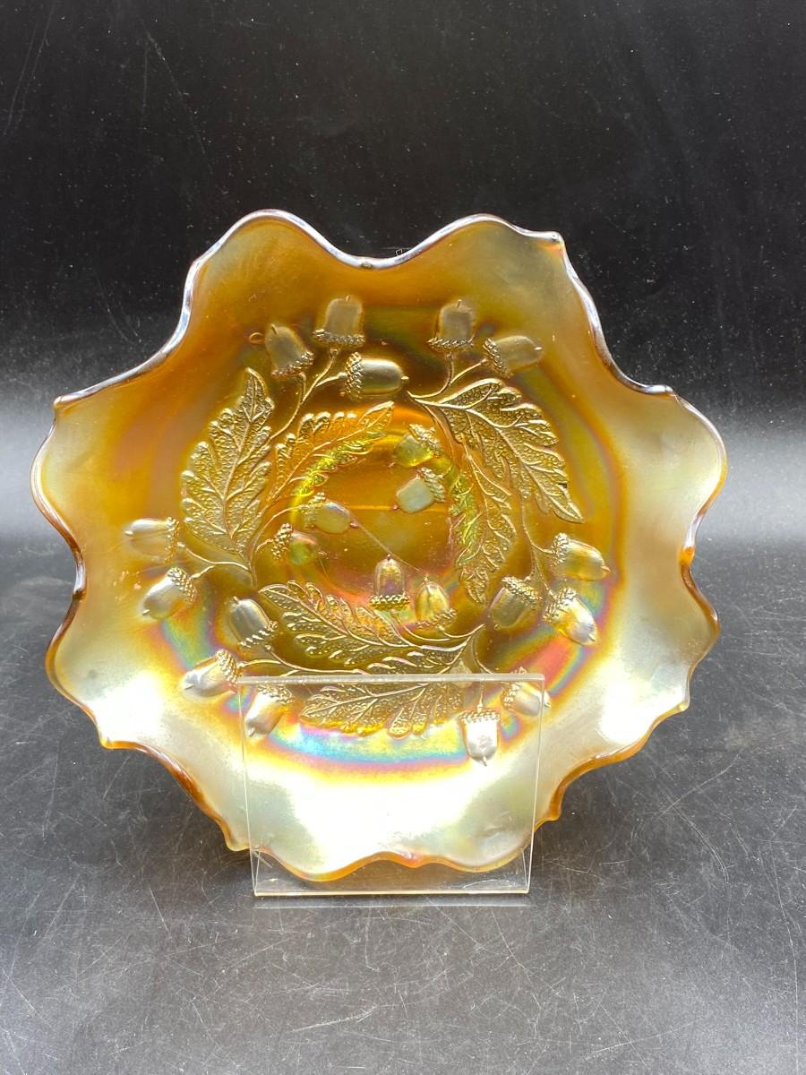 Fenton acorn pattern marigold carnival glass bowl. Ruffled edge. No chips, good condition. About 7" size.
