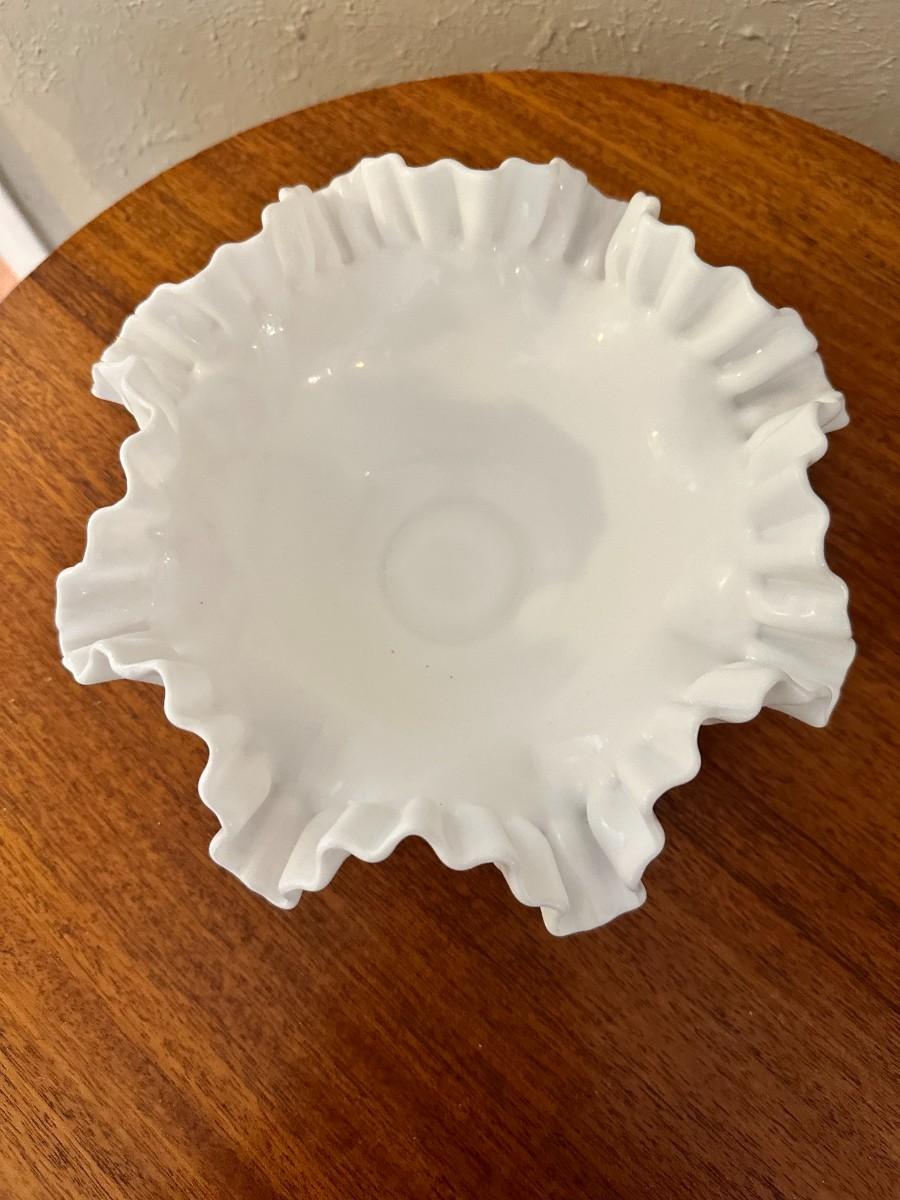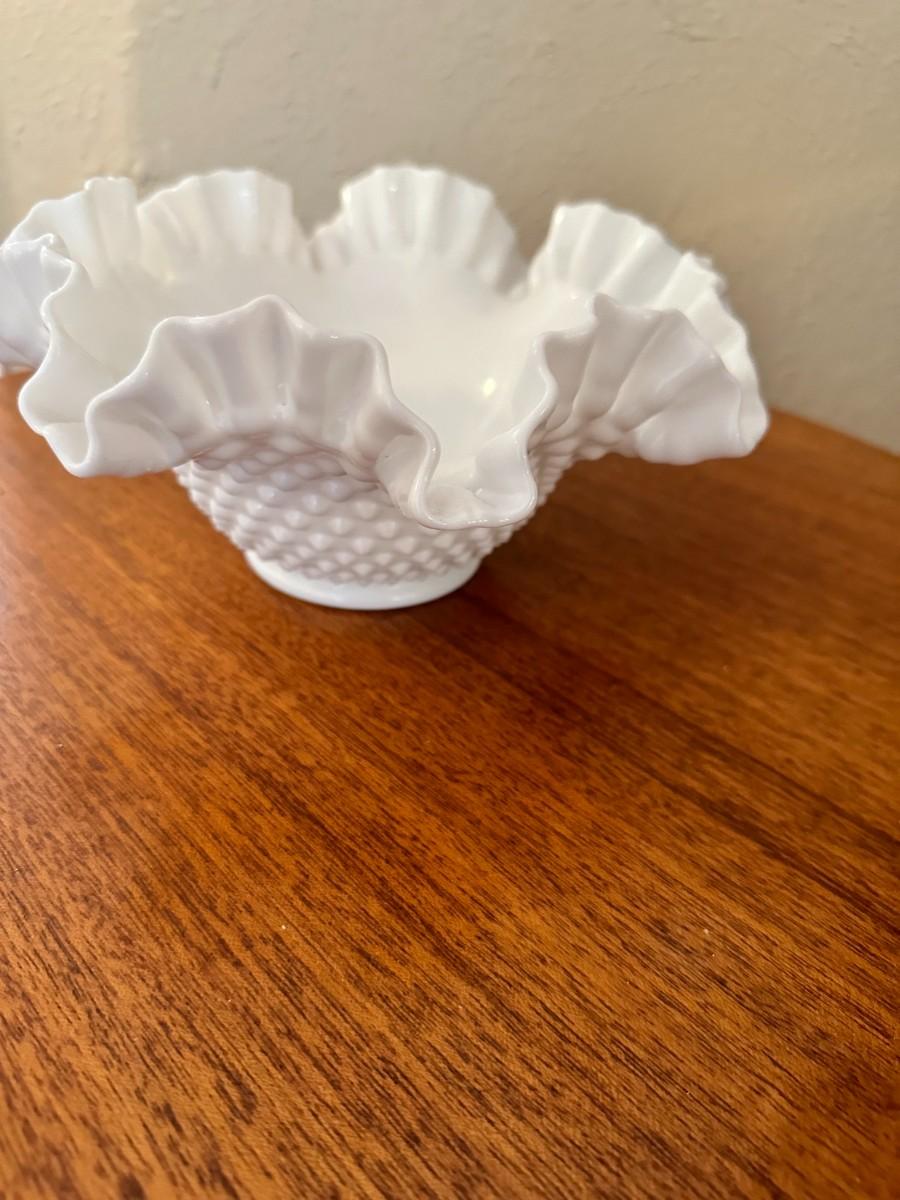 Vintage Fenton Milk Glass Hobnail Pattern Candy Dish: Ruffled Crimped Edge | Collectible