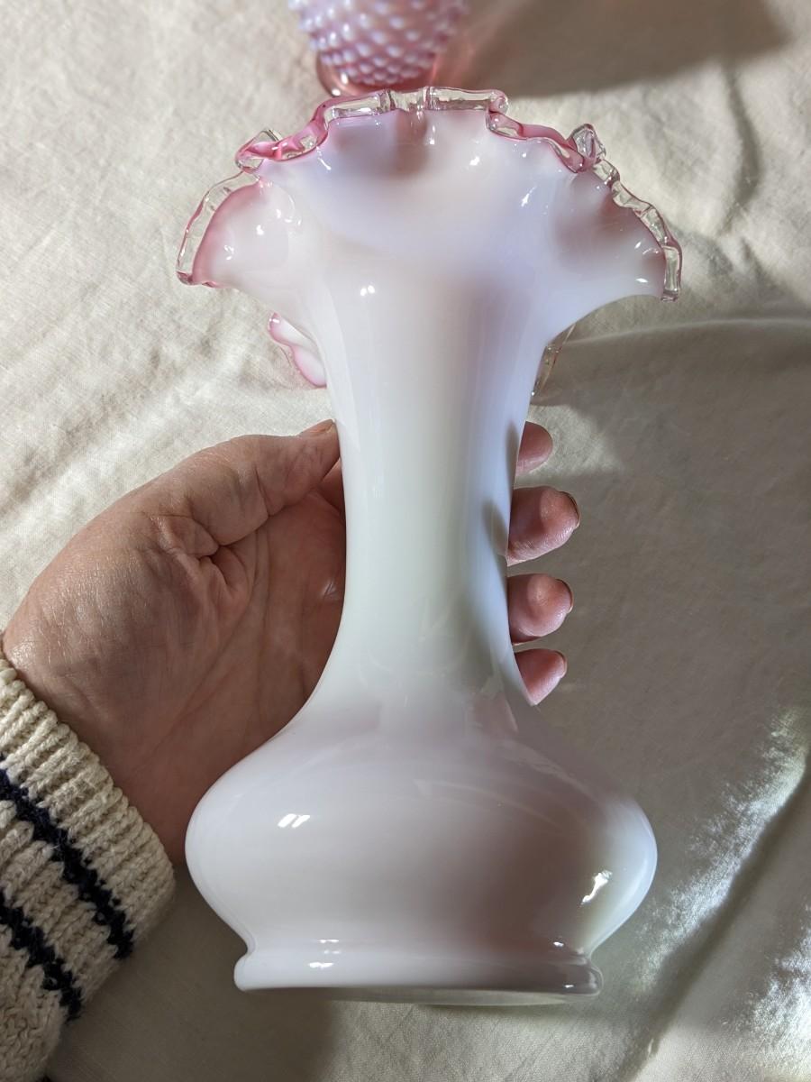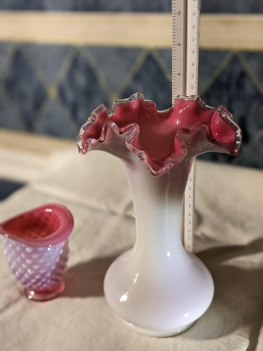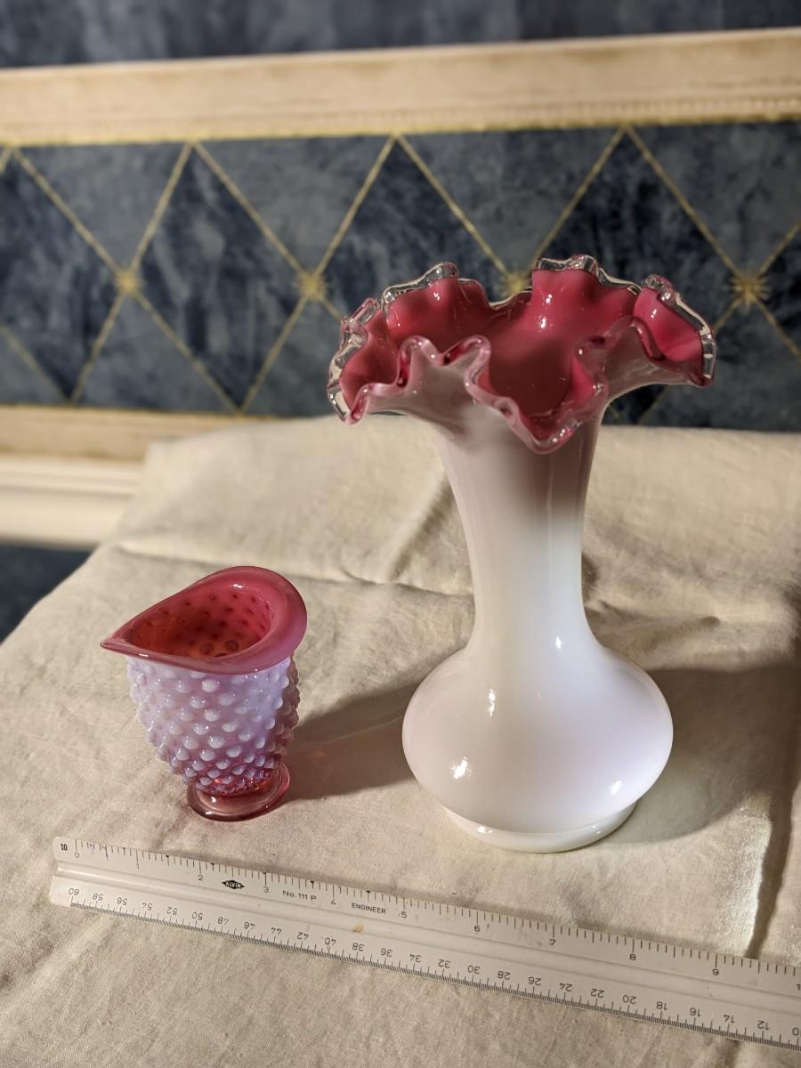 Vintage Fenton Peach Crest Vase, Cranberry Opalescent Hobnail Bud Vase