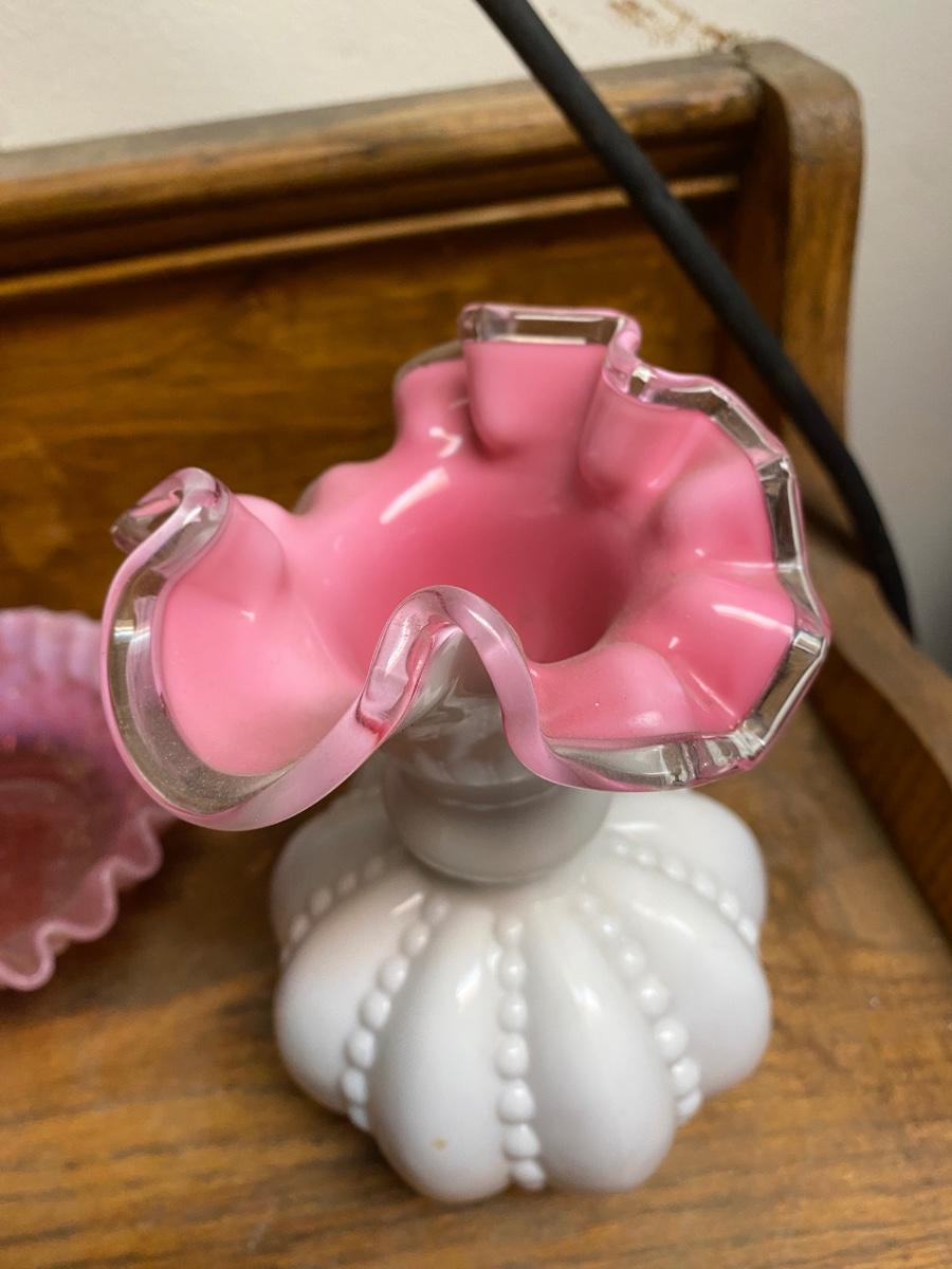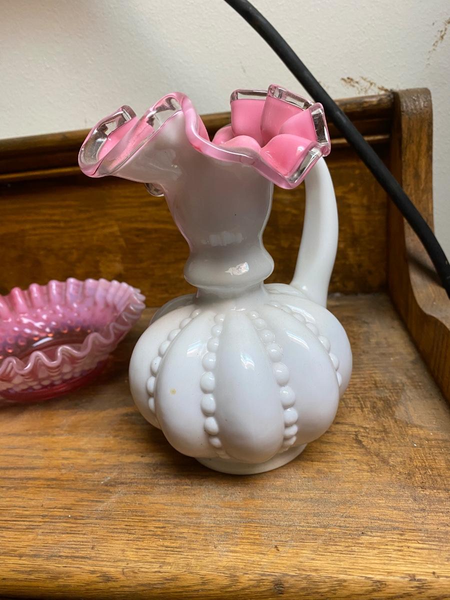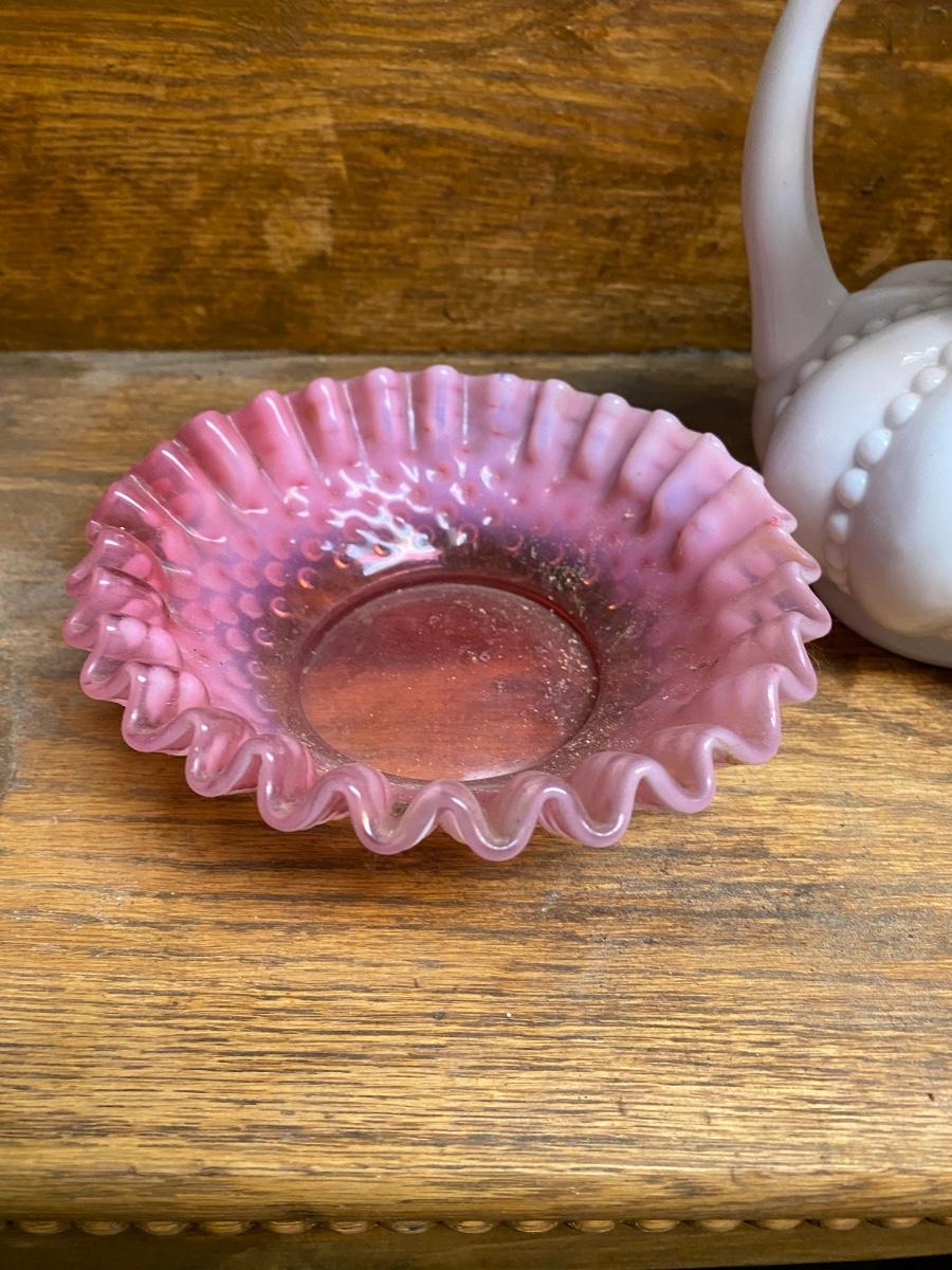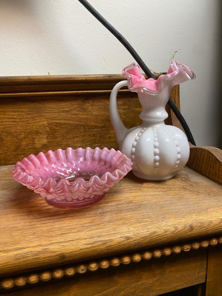 Fenton cranberry hobnail 5" dish and Fenton 6.5" Pink and White Cased Peach Crest Pitcher/Vase. Great condition.